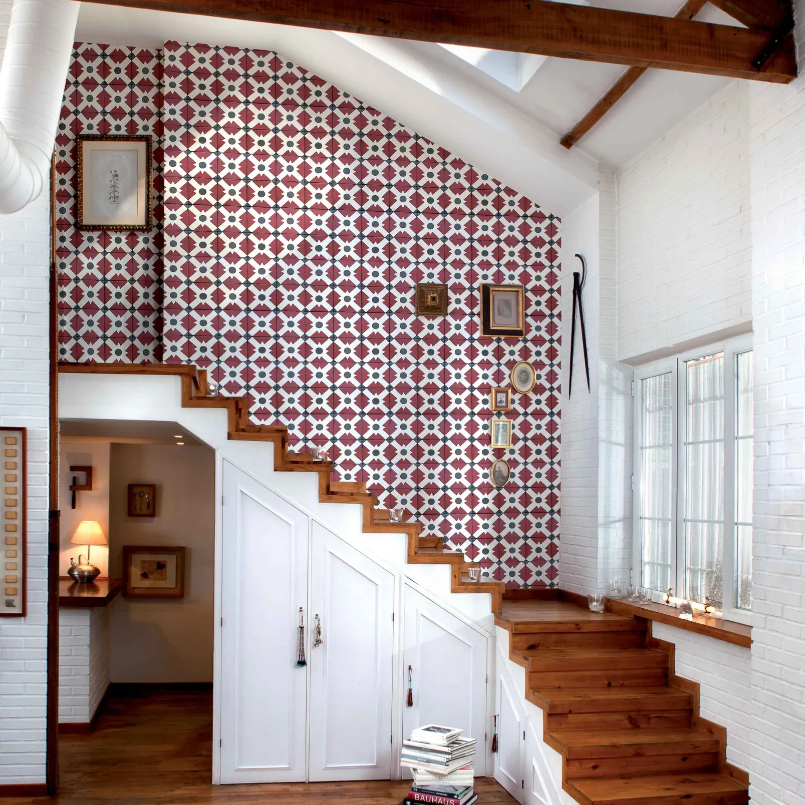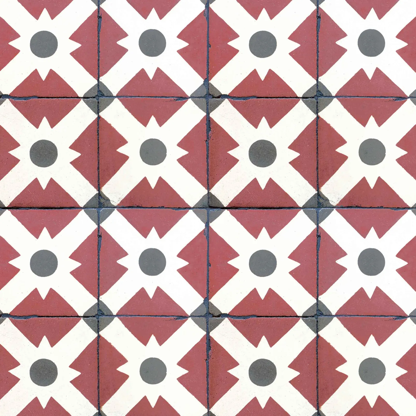 El papel pintado Celosia Clay de Coordonné es un diseño geométrico en tonos rojo/vino de la colección Tiles.