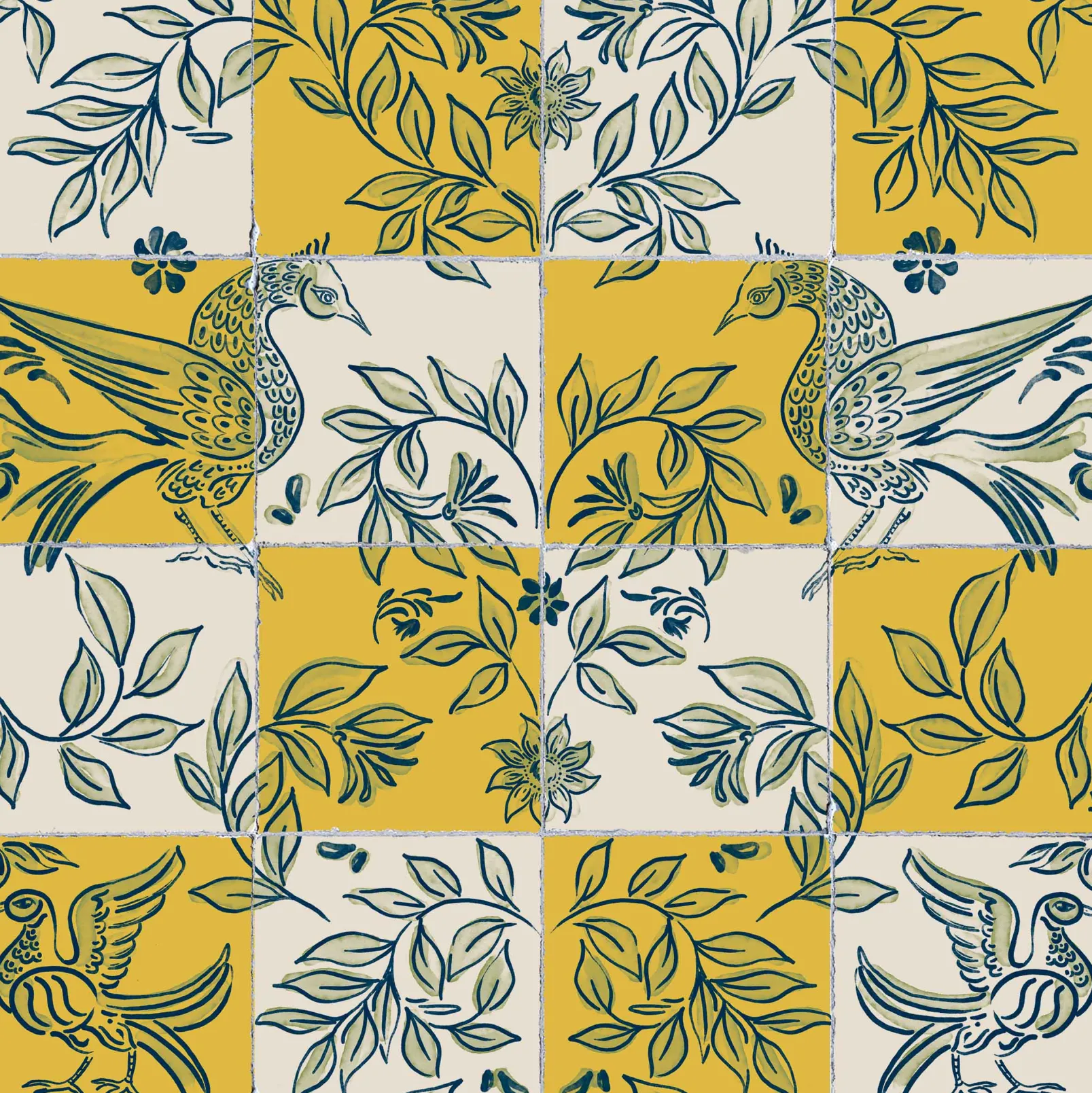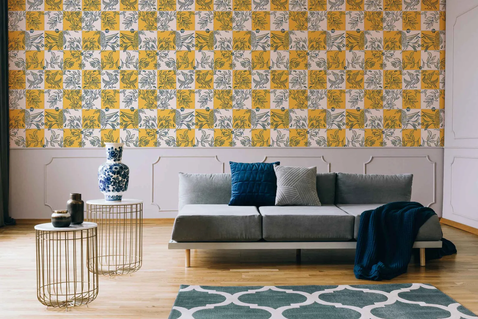 El papel pintado Cerâmica Damero de Coordonné es un diseño vegetal en tonos amarillo/naranja de la colección Wander.