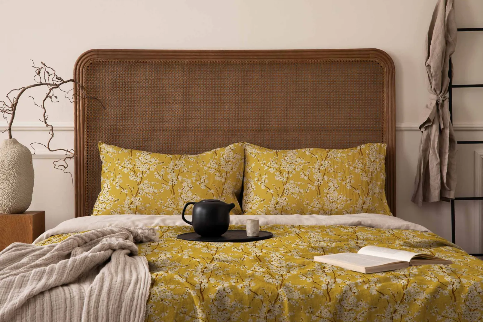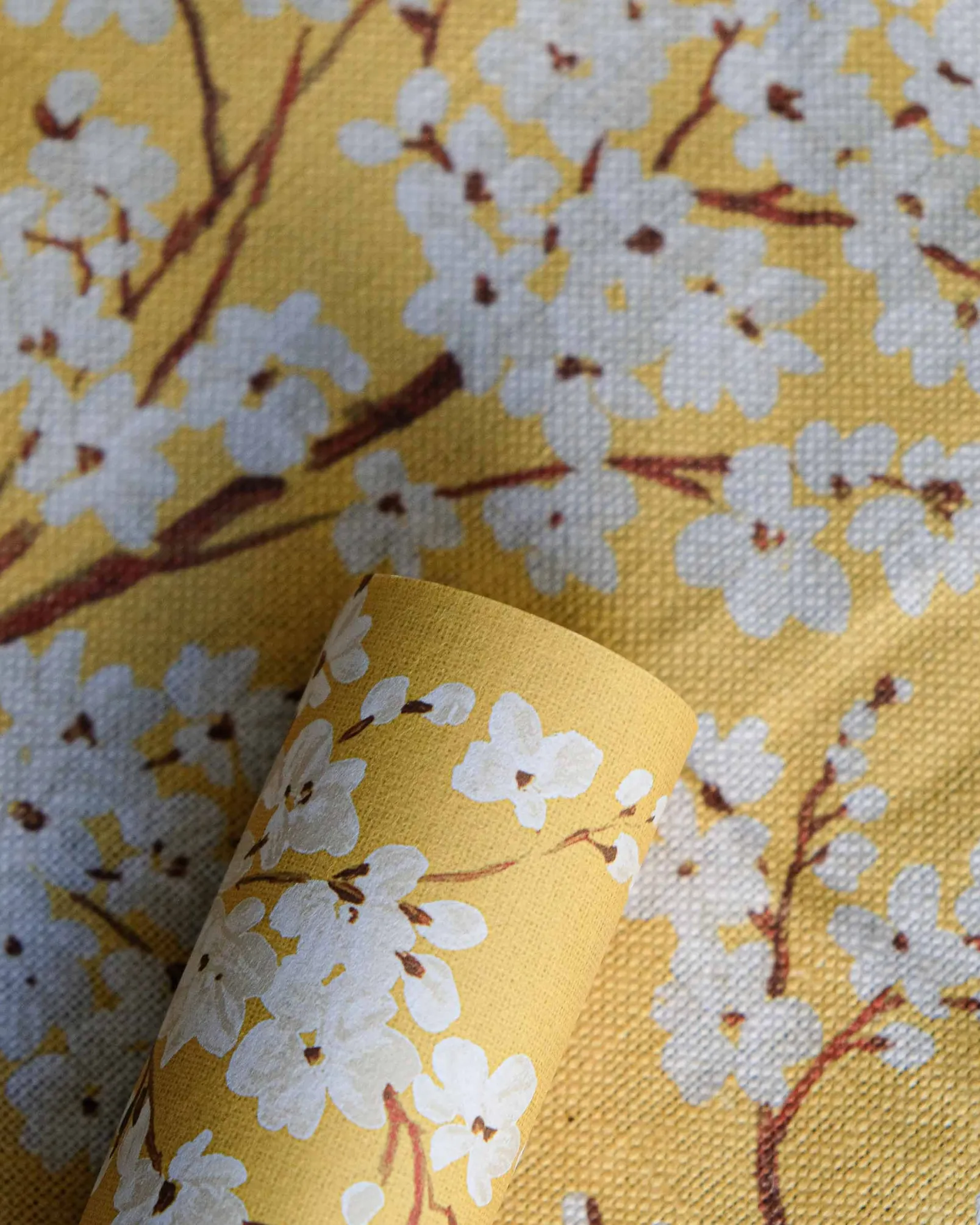 El tejido Cherry Blossom Amber de Coordonné es un diseño floral en amarillo/blanco de la colección Forbidden City Fabrics.