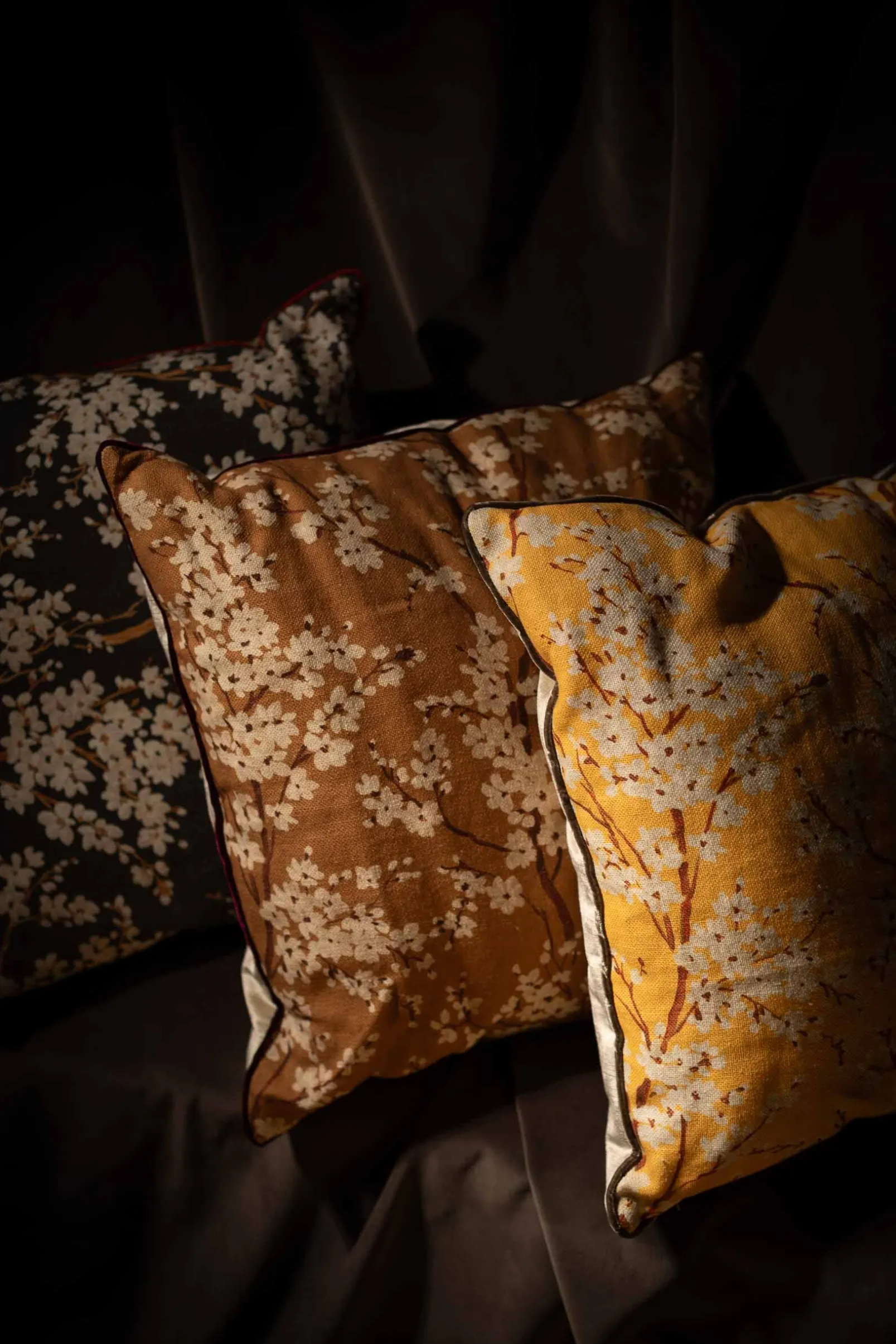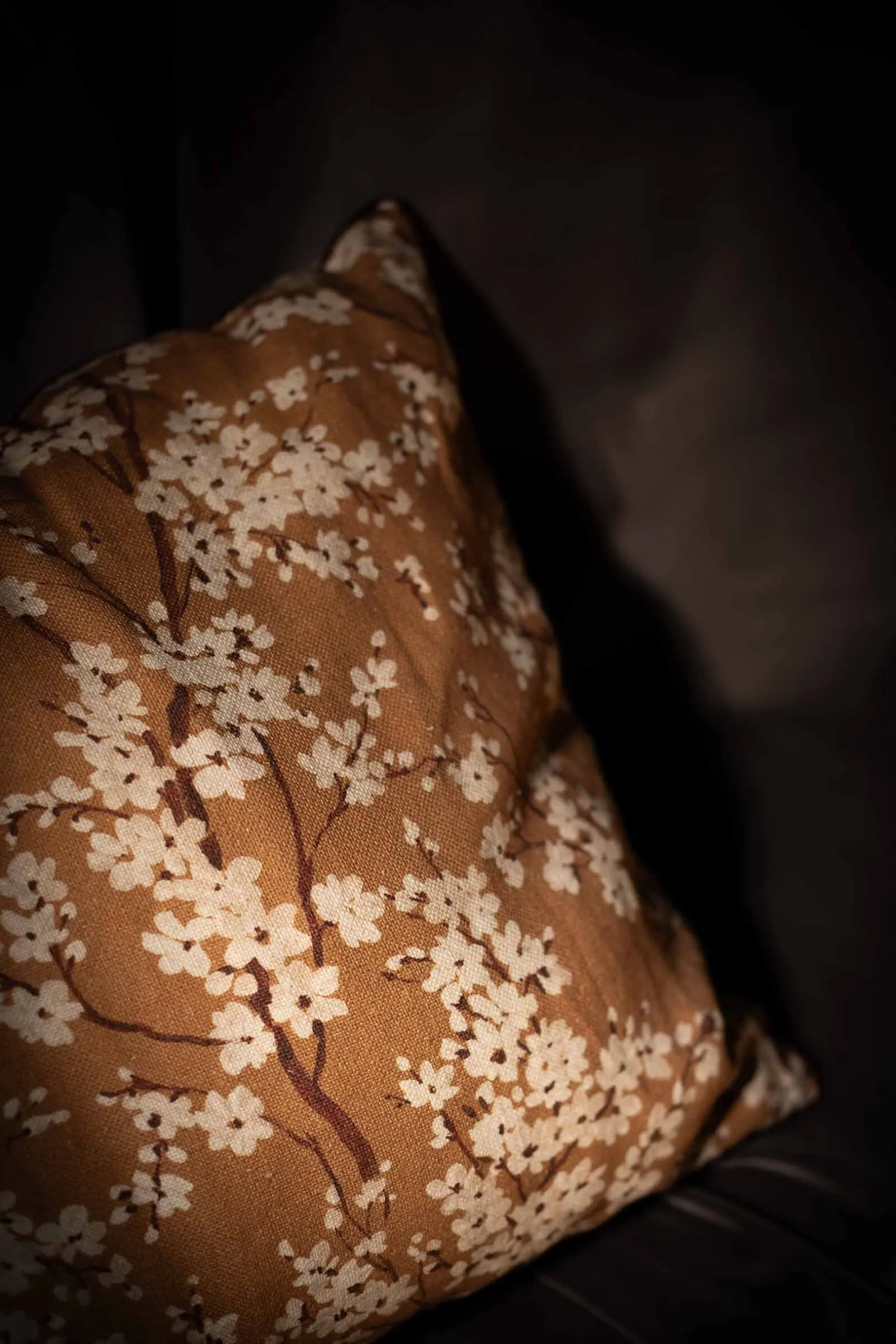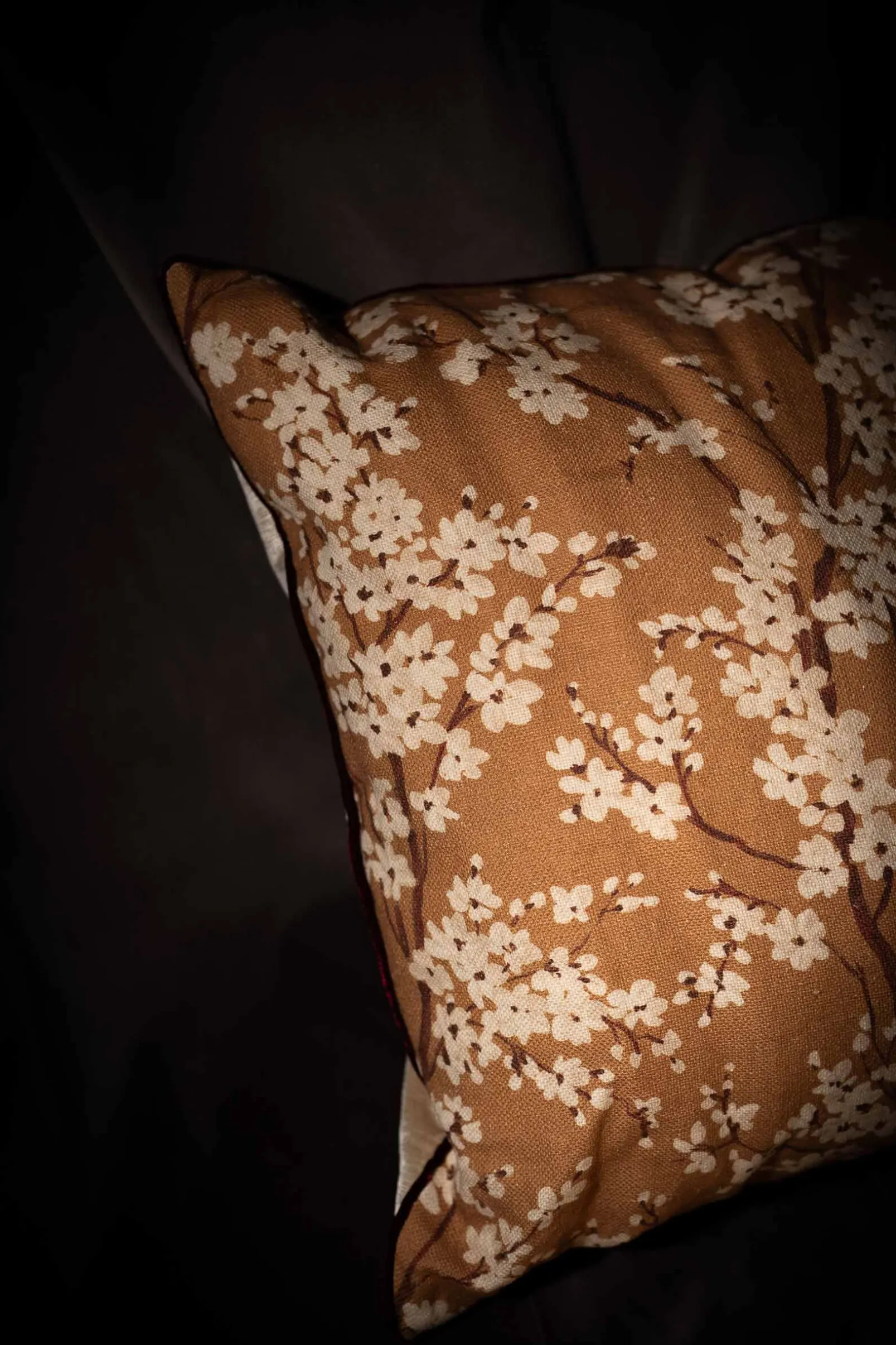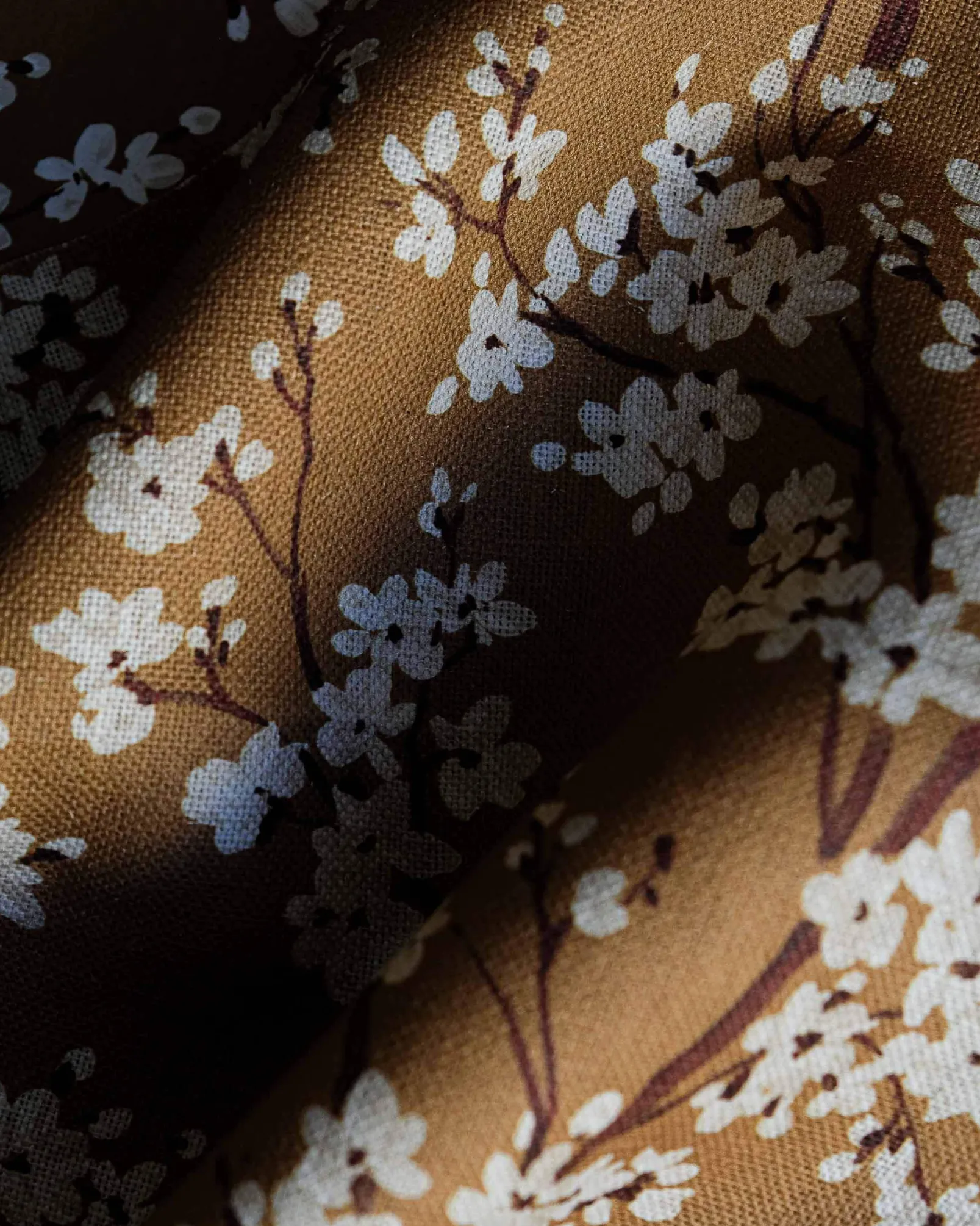 Cherry Blossom Honey de Coordonné es un diseño de inspiración floral en marrón de la colección Forbidden City. Reverso en terciopelo liso tono nácar.
