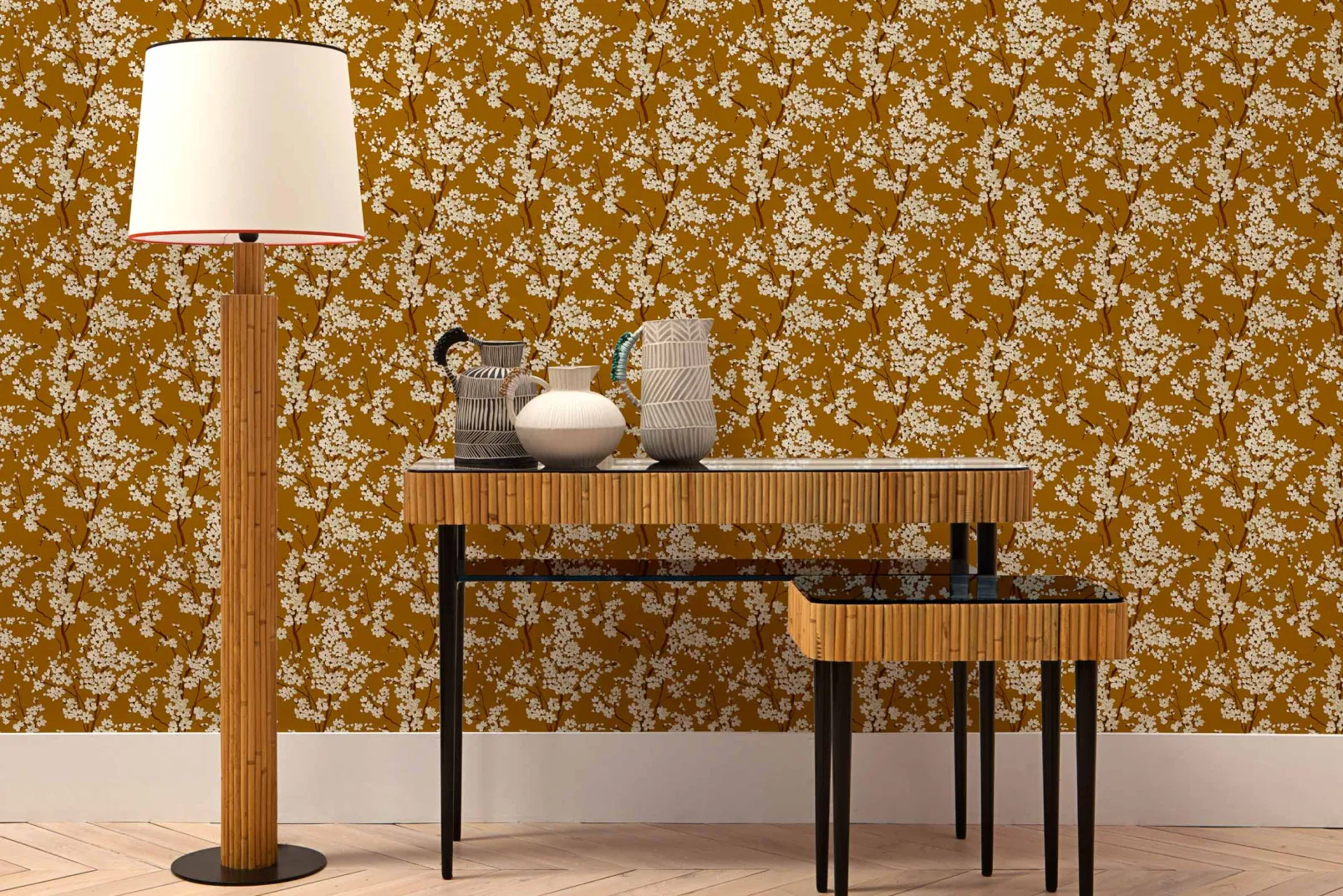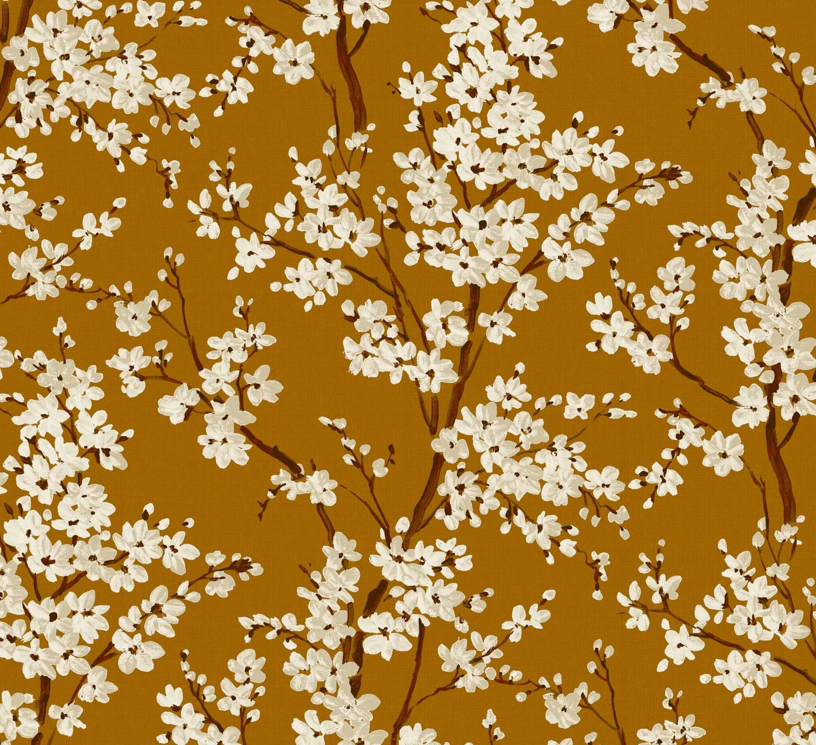 Cherry Blossom Honey de Coordonné es un papel pintado floral de color marrón. Hermosa simbología floral de la Fiesta de la Primavera.