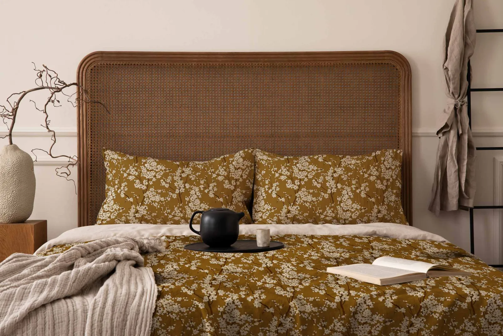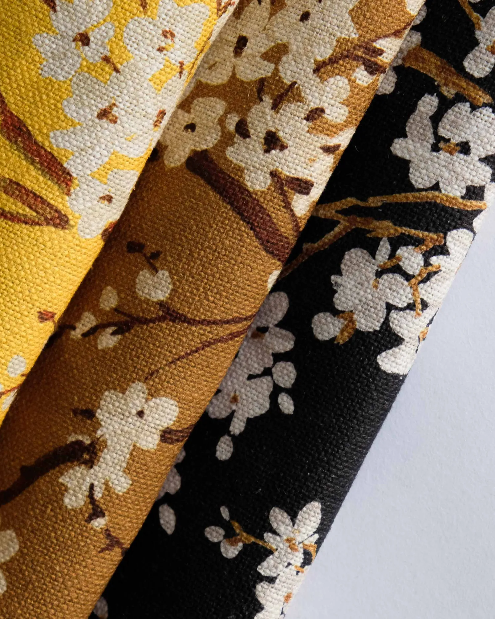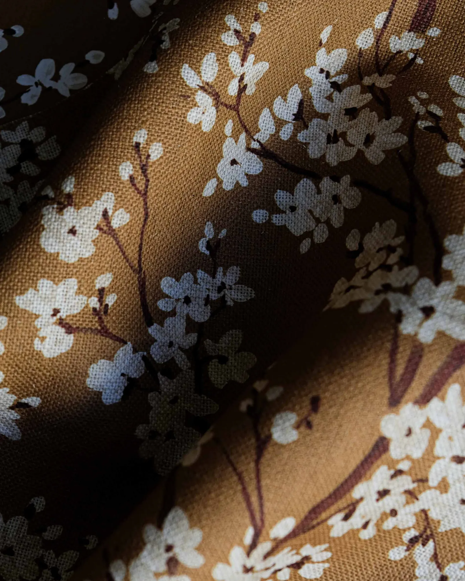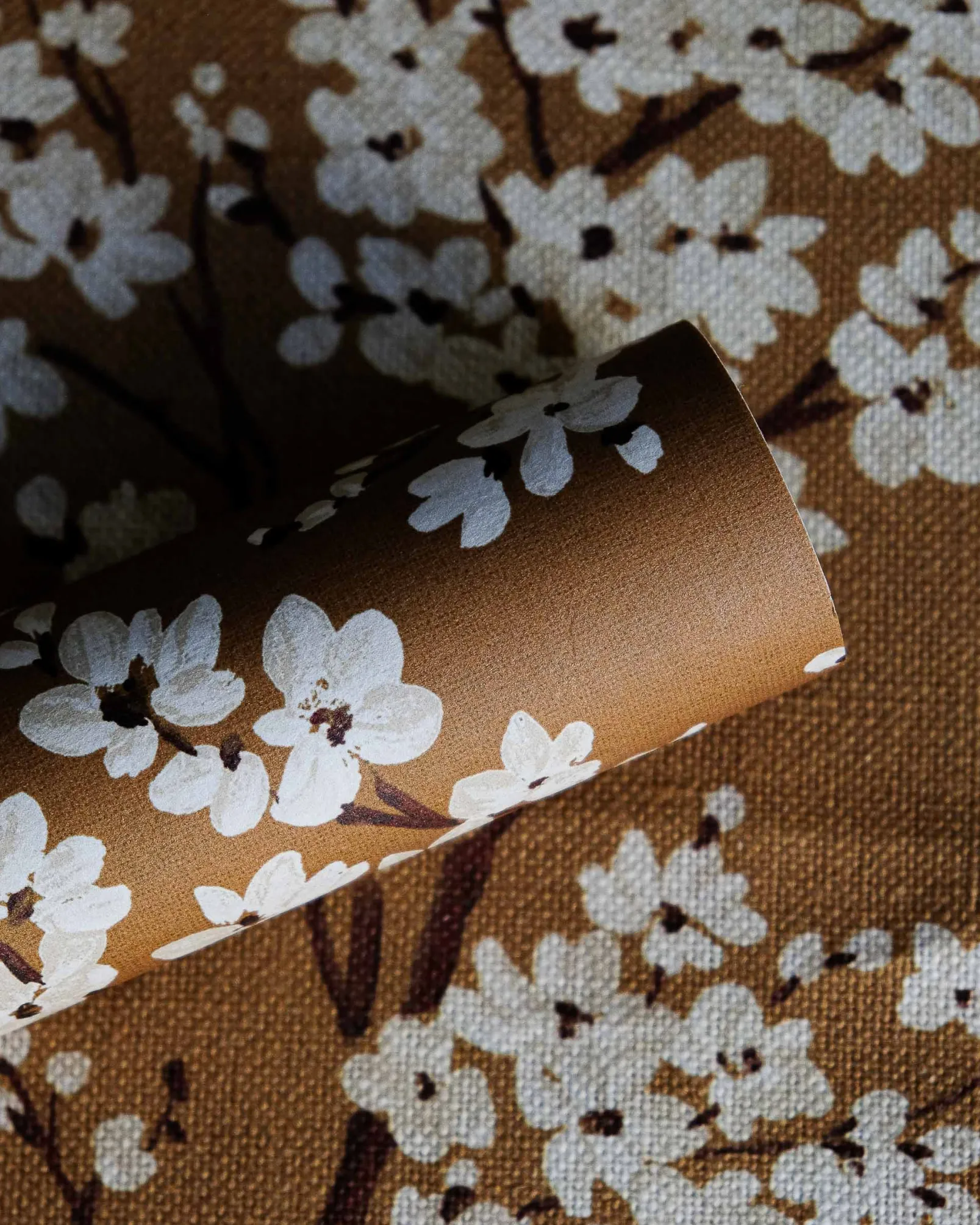 El tejido Cherry Blossom Honey de Coordonné es un diseño floral en miel/blanco de la colección Forbidden City Fabrics.