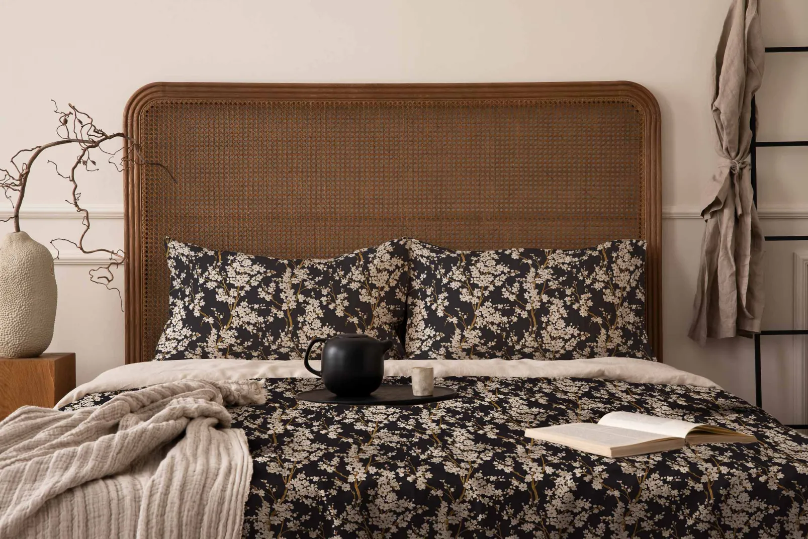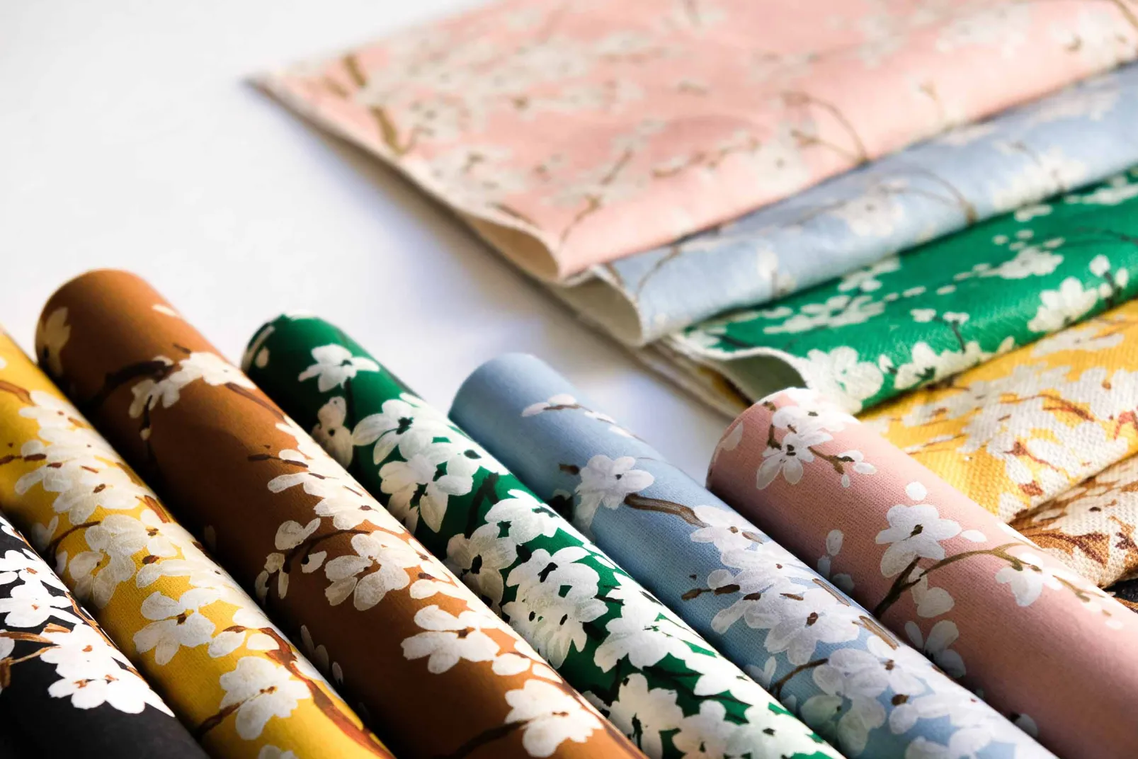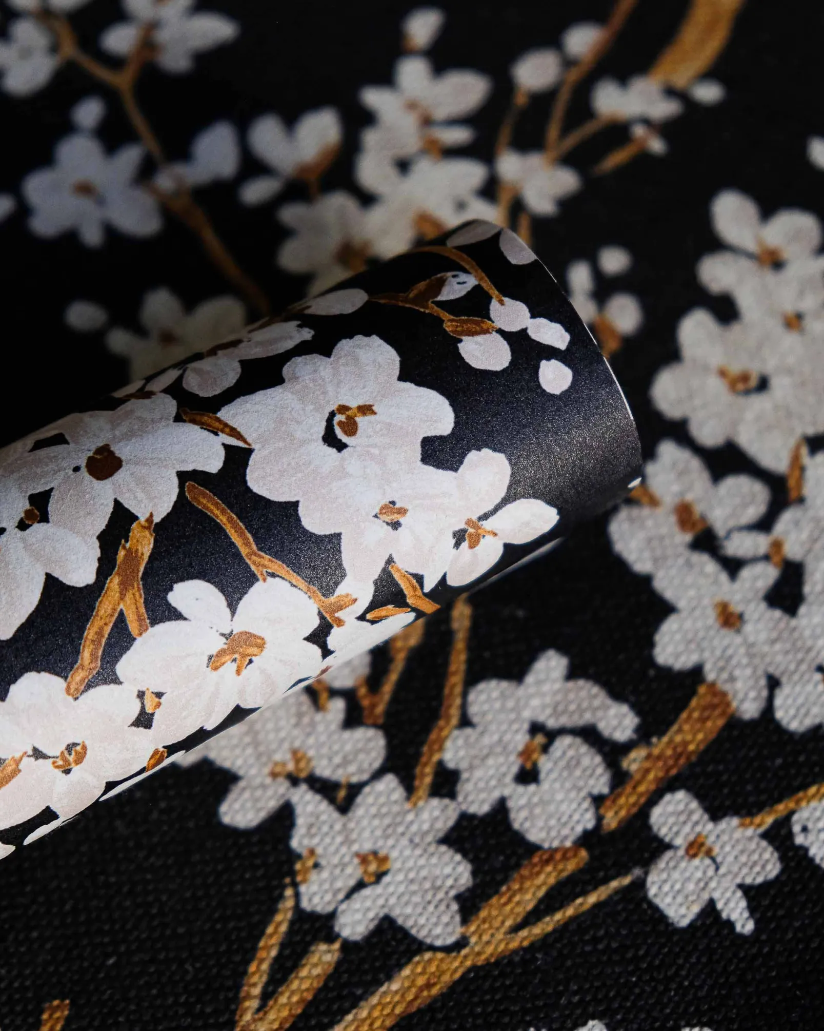 El tejido Cherry Blossom Onyx de Coordonné es un diseño floral en negro/blanco de la colección Forbidden City Fabrics.