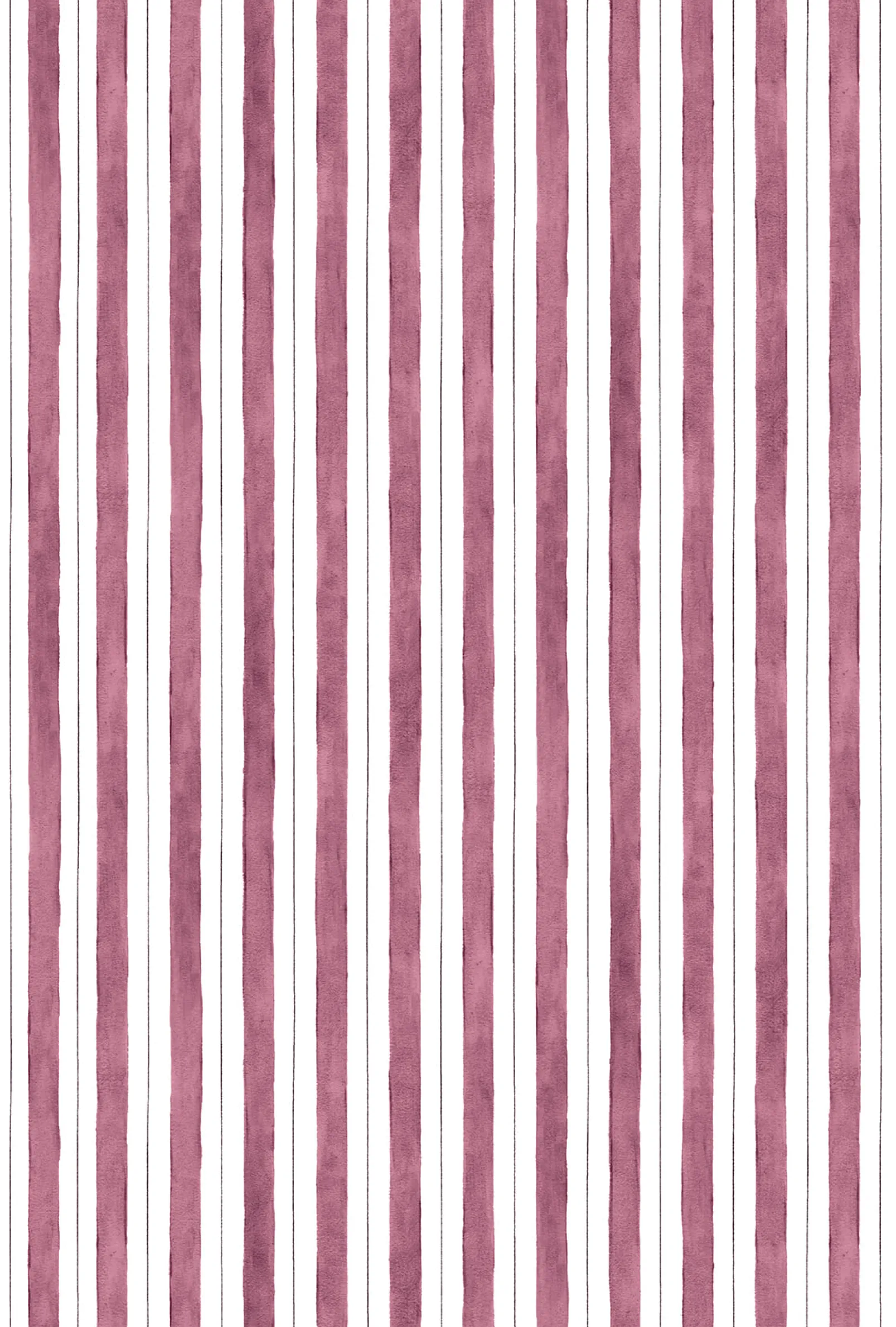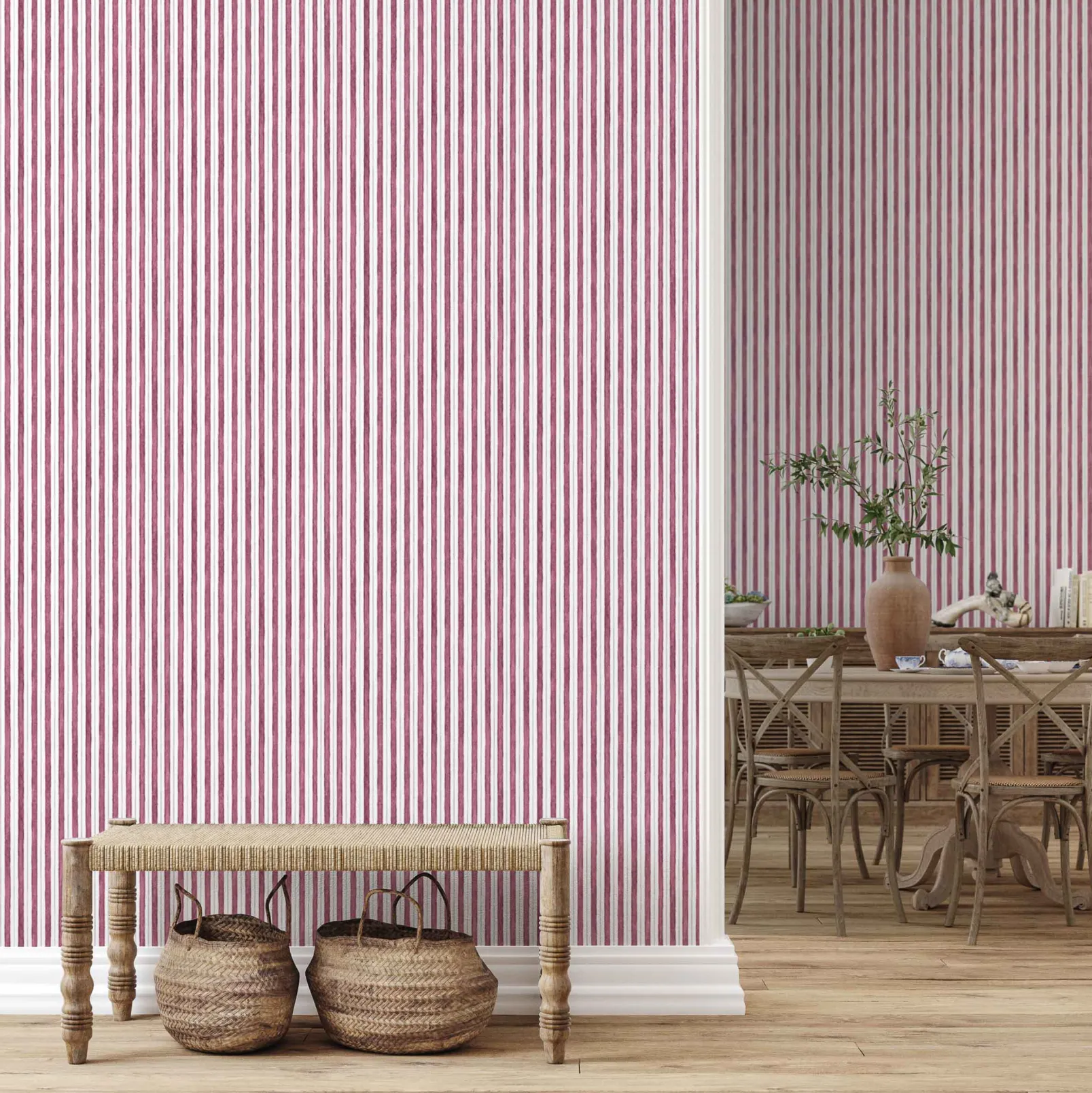 El papel pintado Colonial Cereza de Coordonné es un diseño de rayas en tonos rojo/vino de la colección Indiano.