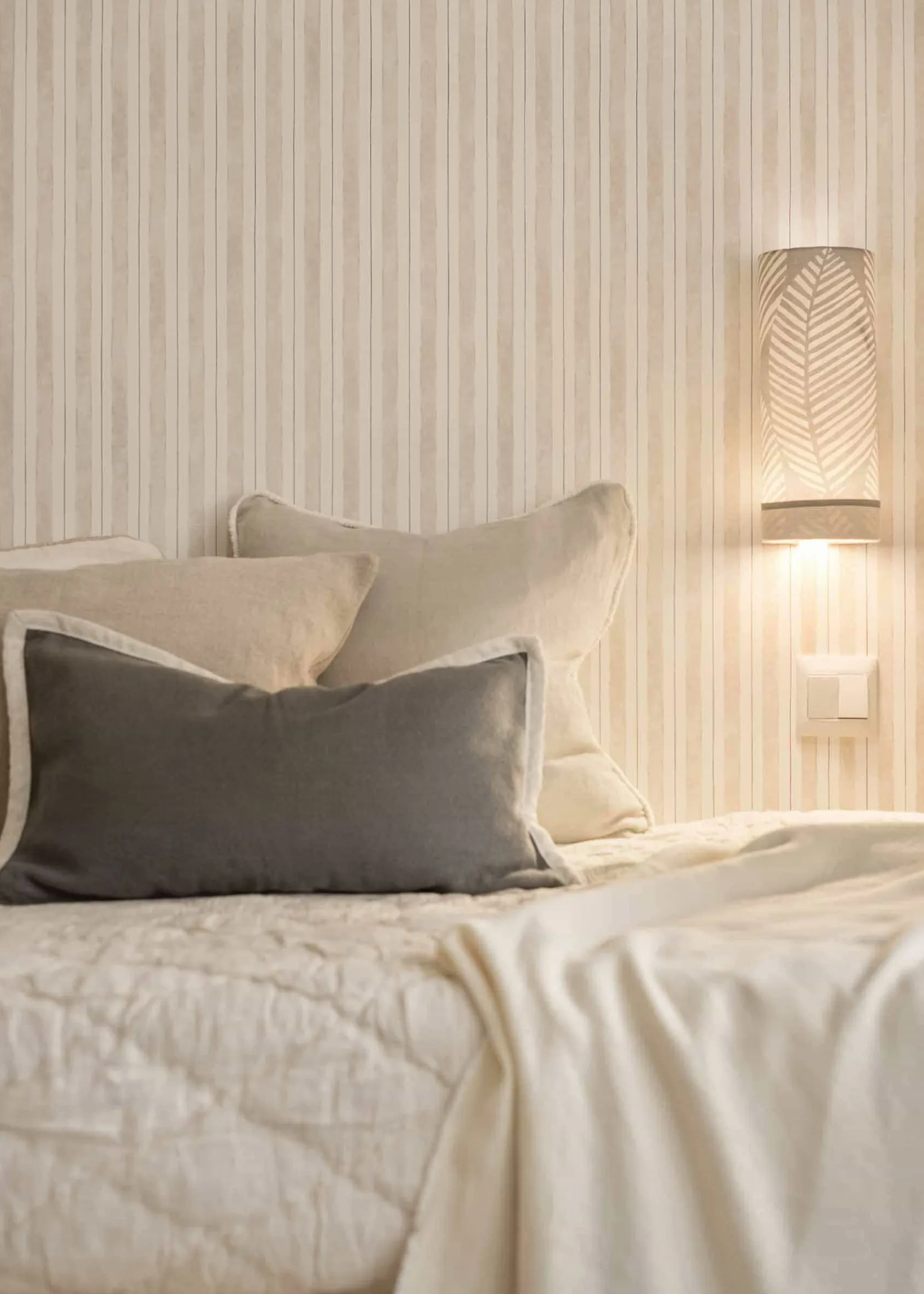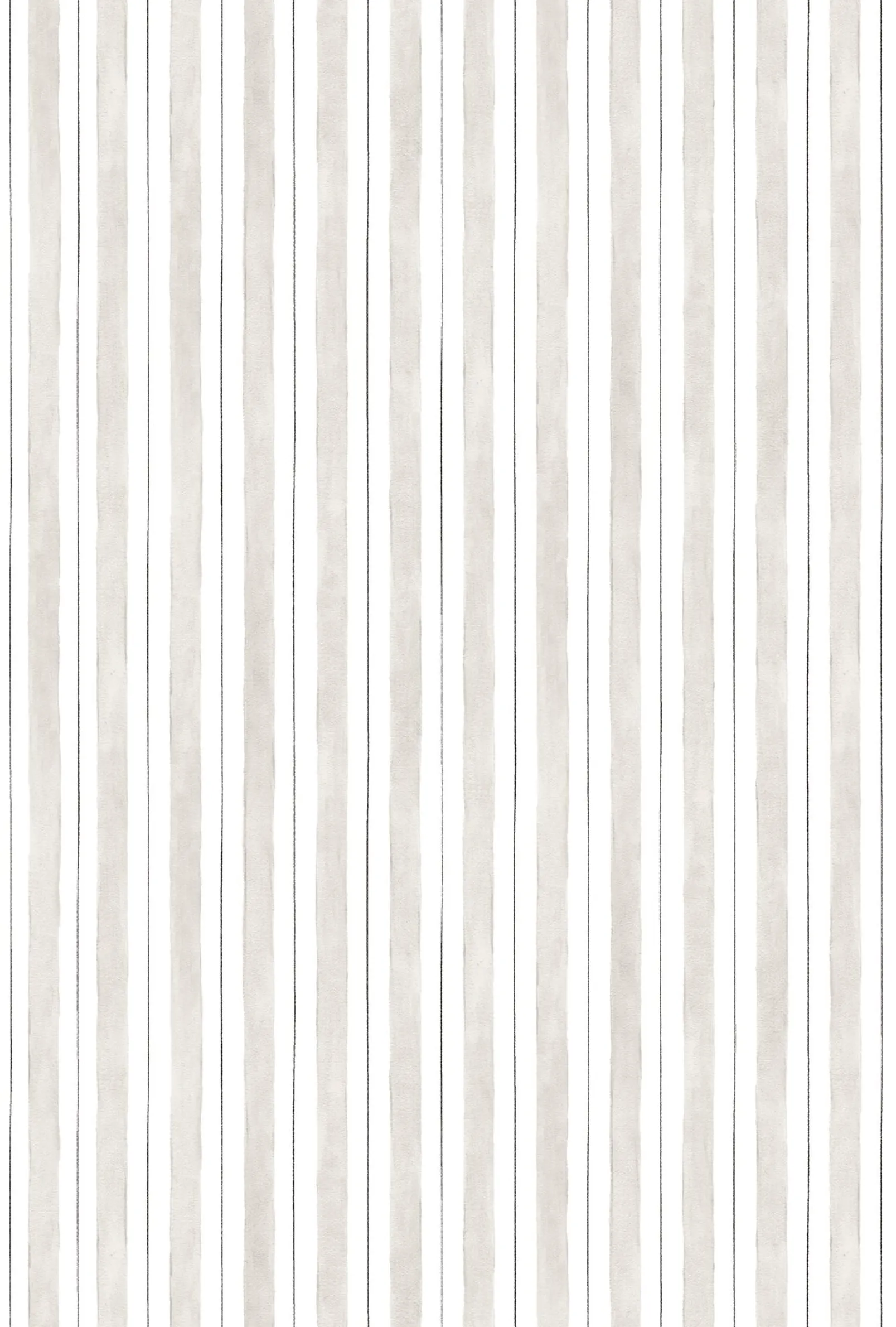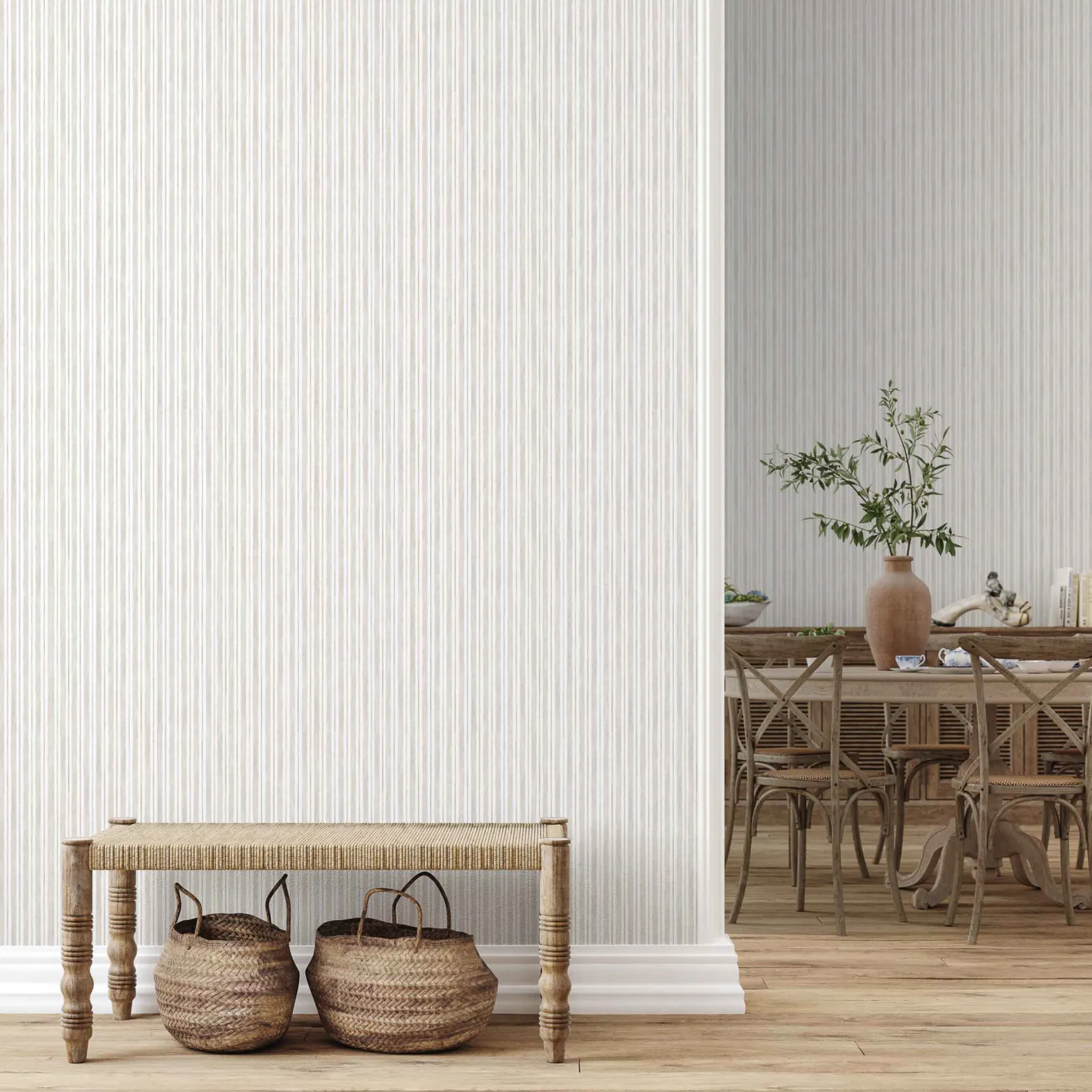 El papel pintado Colonial Piedra de Coordonné es un diseño de rayas en tonos blanco/gris de la colección Indiano.