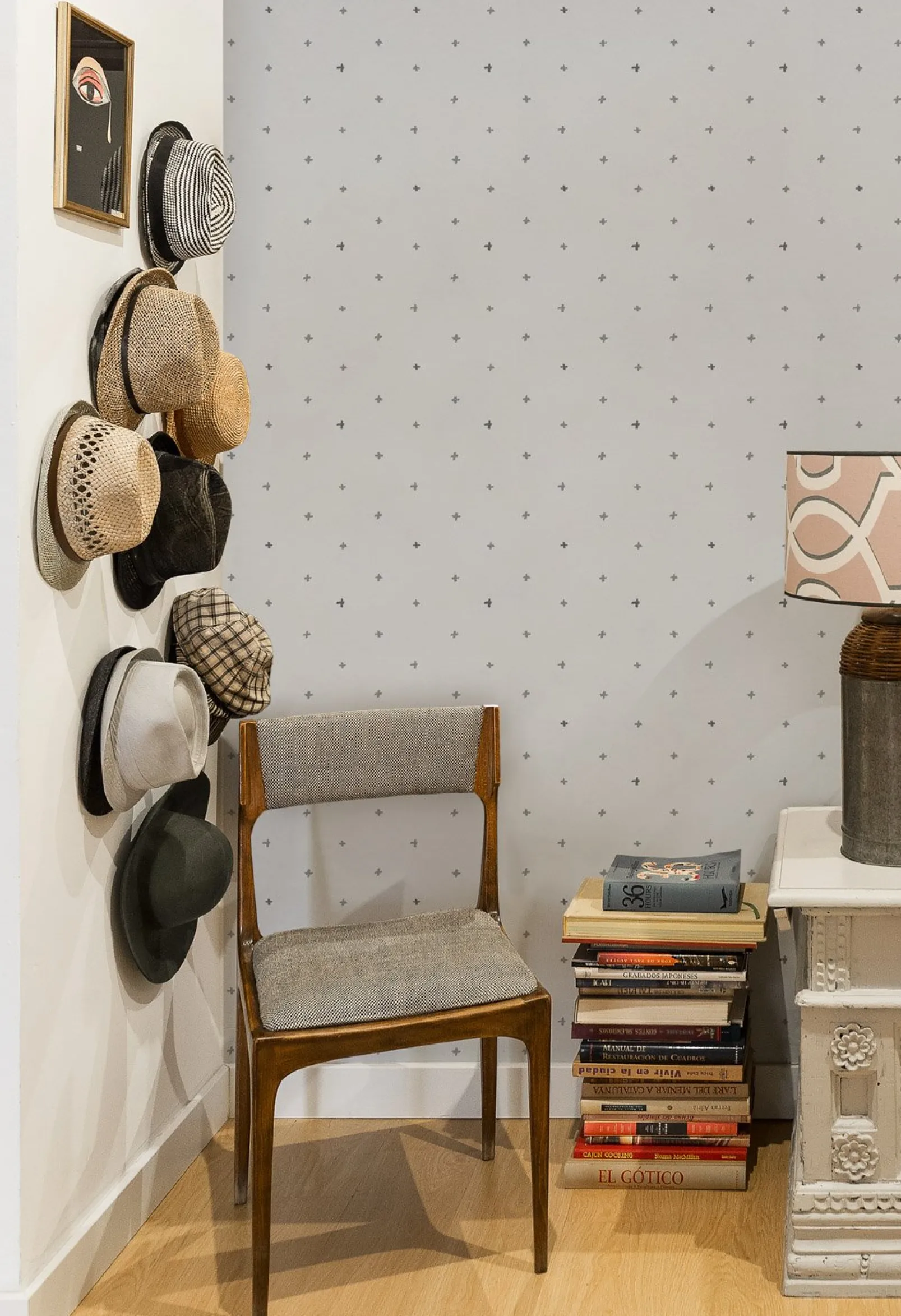 El papel pintado Croix Tailor de Coordonné es un diseño geométrico en tonos blanco/gris de la colección Ines de la Fressange.