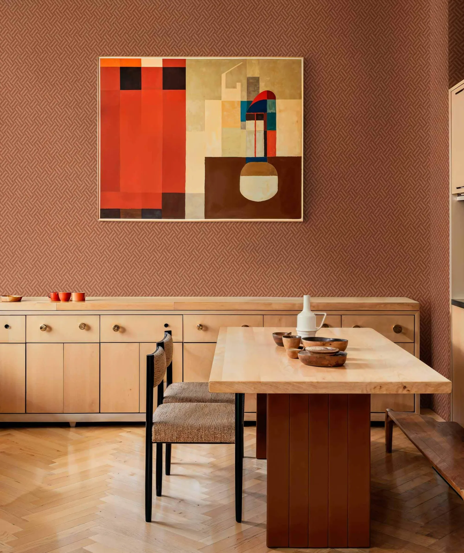 Crosshatch Redwood de Coordonne es un papel pintado de inspiración geométrica en tonos Rojo/Vino de la colección Lattice Geometrics. Paralelismos en diferentes direcciones.
