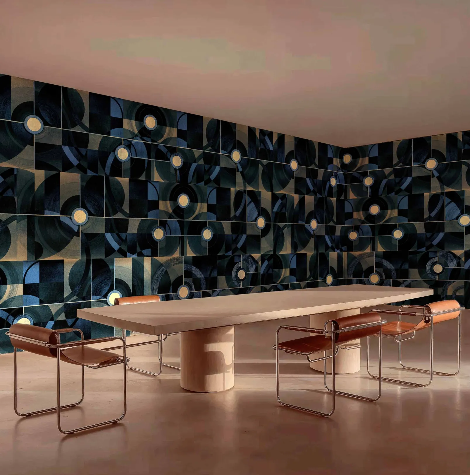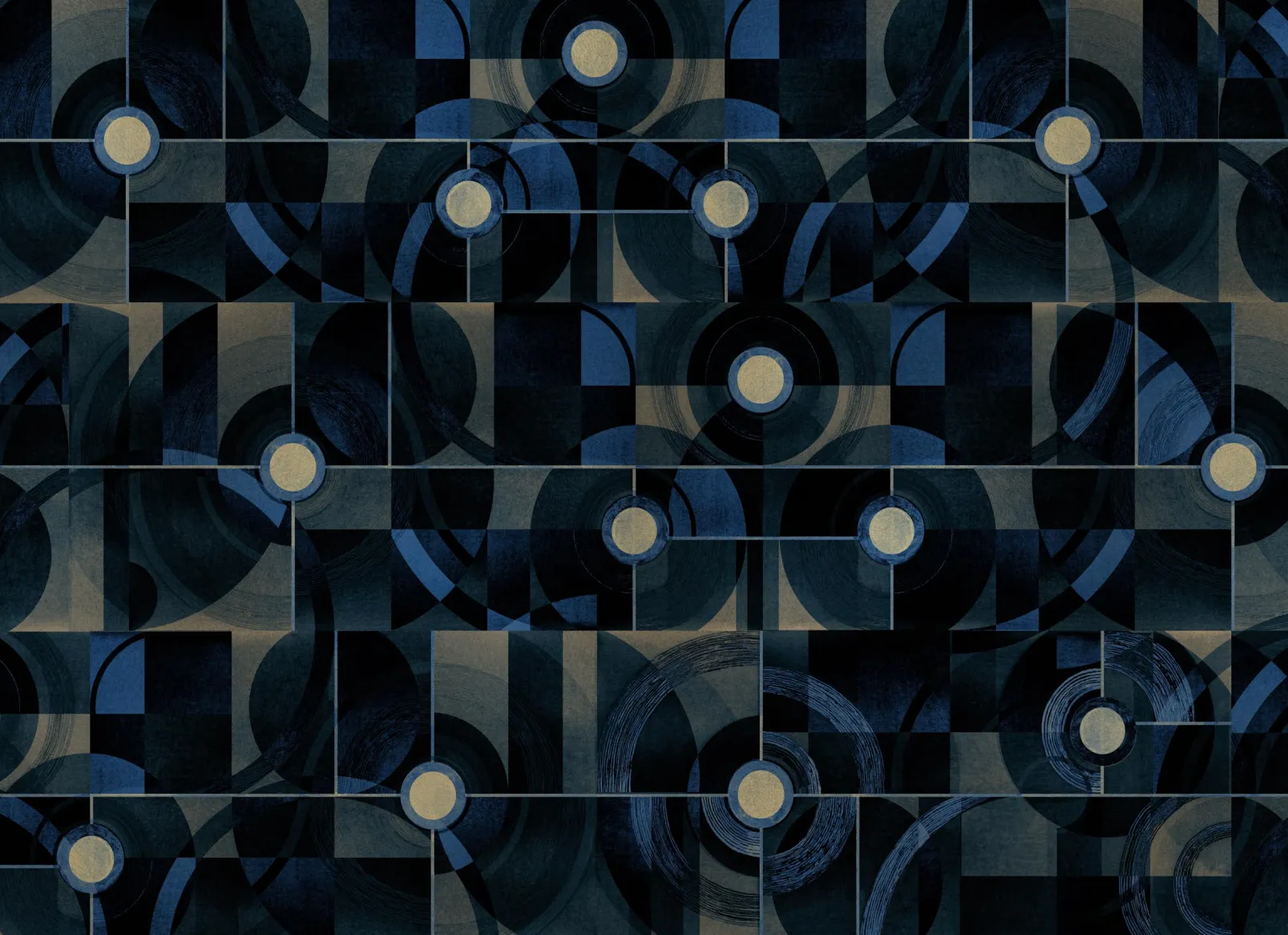 Diagrams Gold de Coordonné es un diseño geométrico en azul/azul marino de la colección Random Metallics II. Una infinidad de círculos que buscan tocarse en medio del caos.