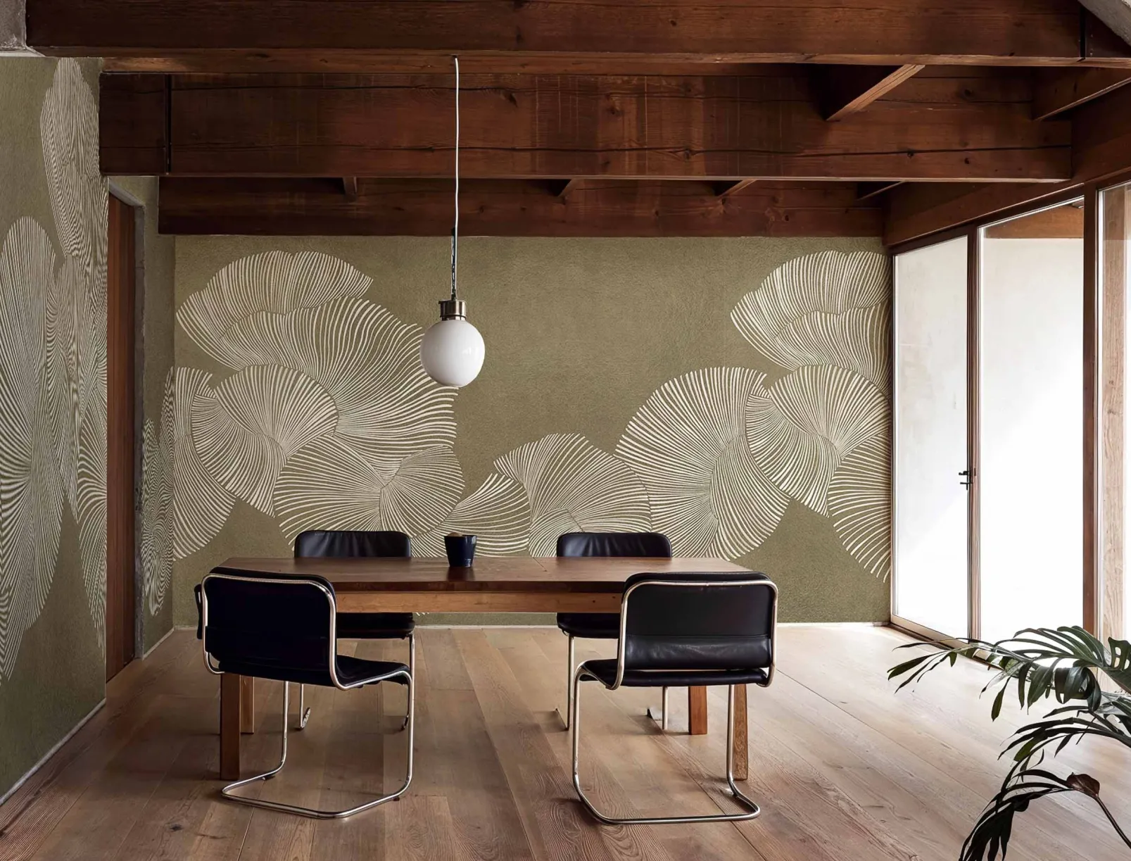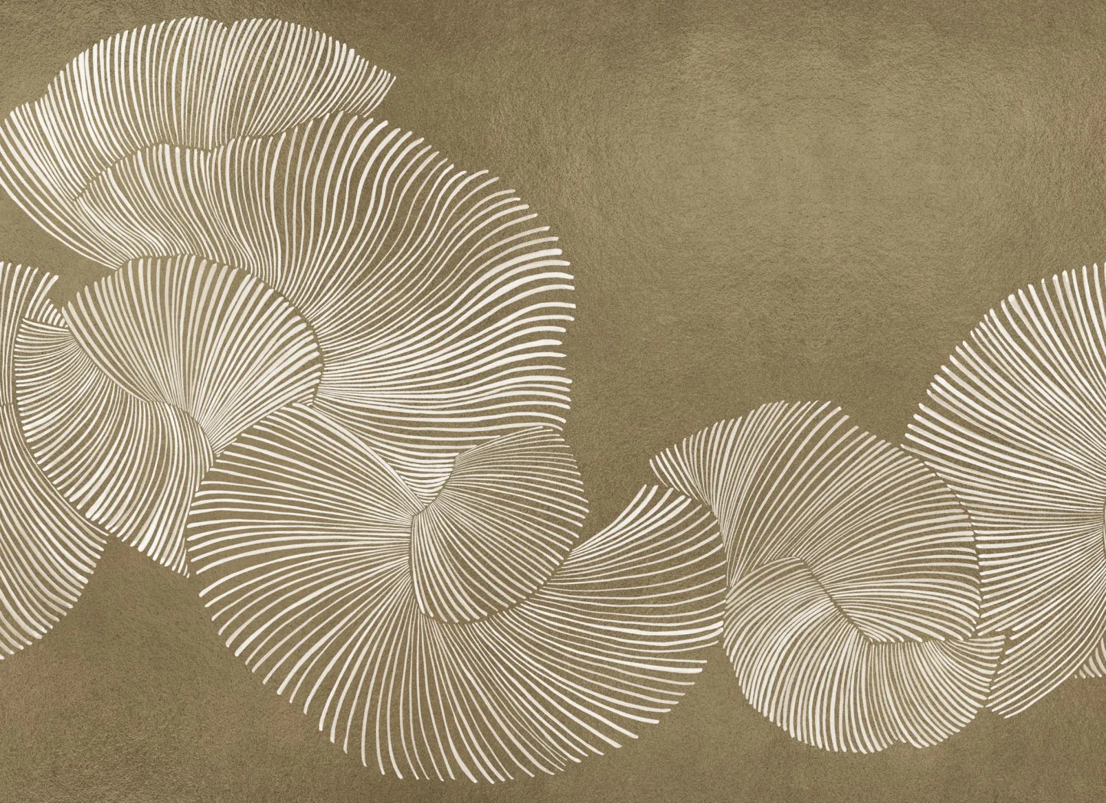Diving moment Gold de Coordonné es un diseño de Texturas en amarillo/naranja de la colección Random Metallics II. Un inquietante fondo marino con algas oscilantes.