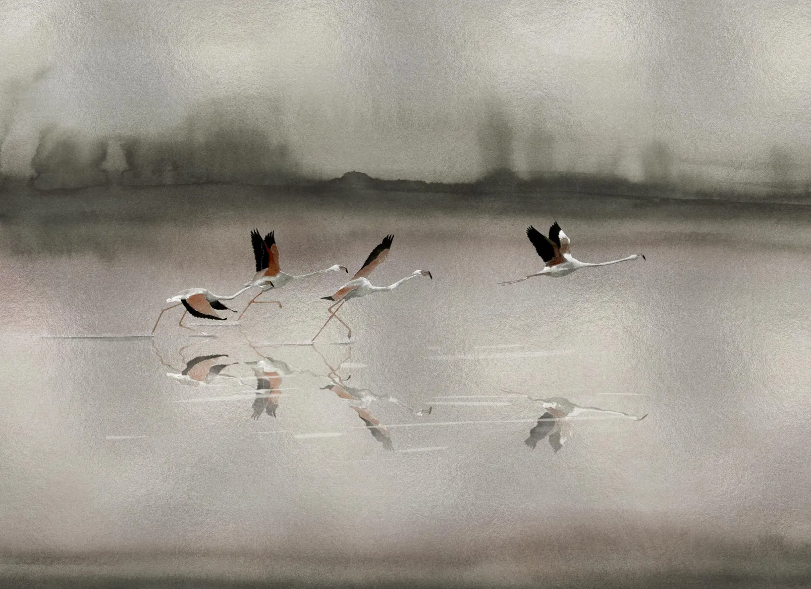 Doñana Silver de Coordonné es un diseño de Animales en blanco/gris de la colección Random Metallics II. El vuelo al amanecer de los pájaros que emprenden su viaje migratorio.