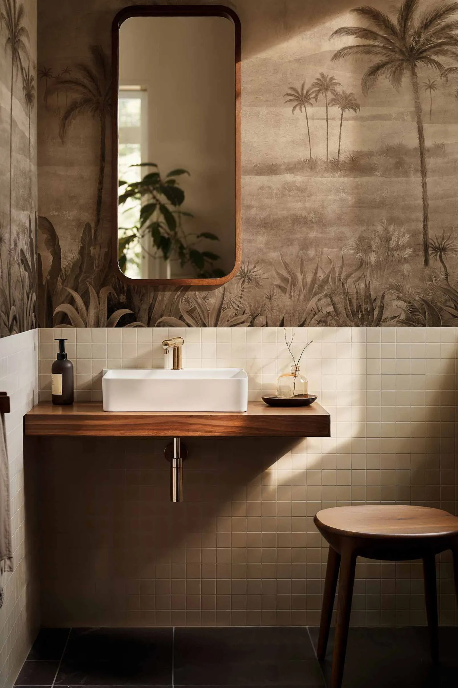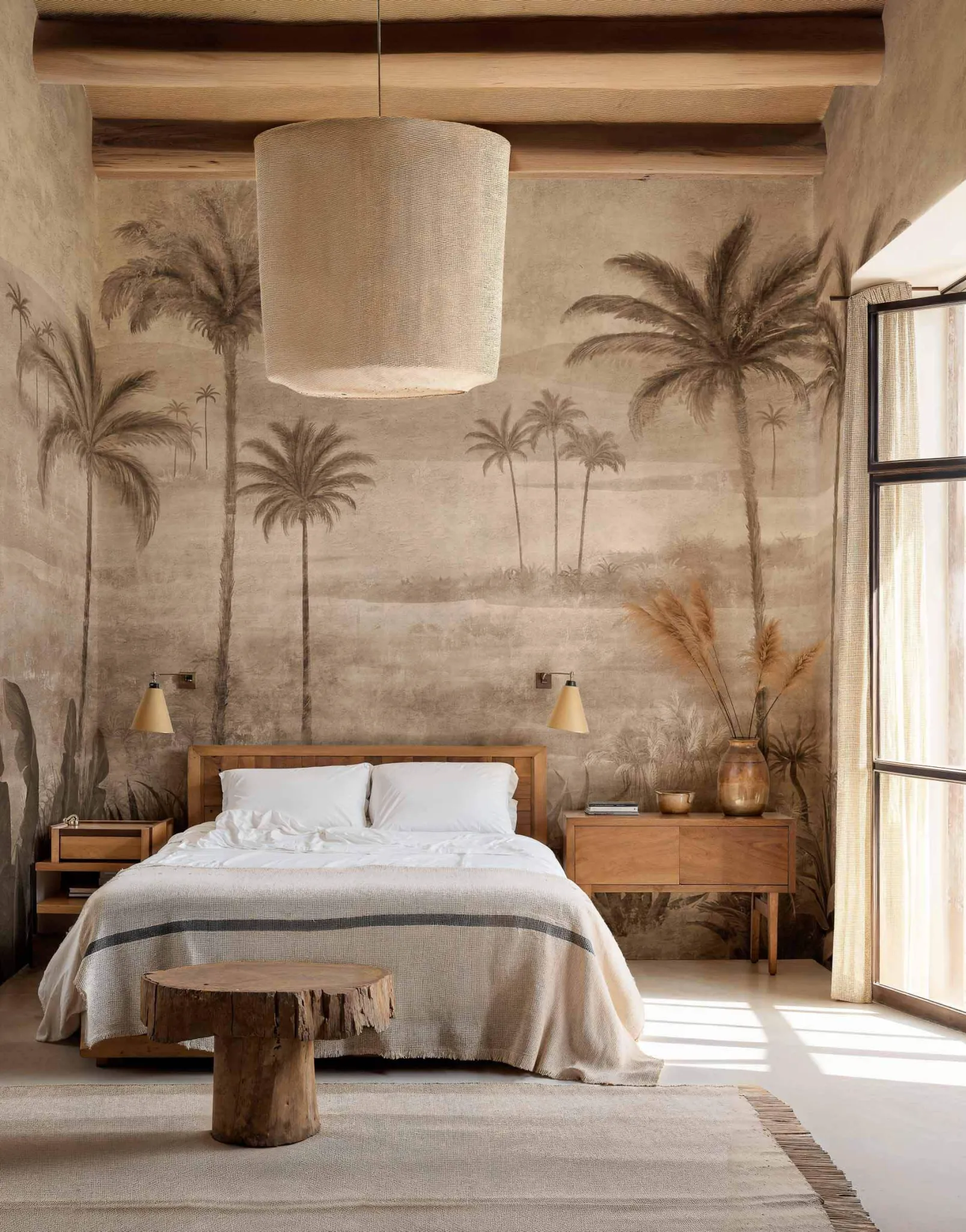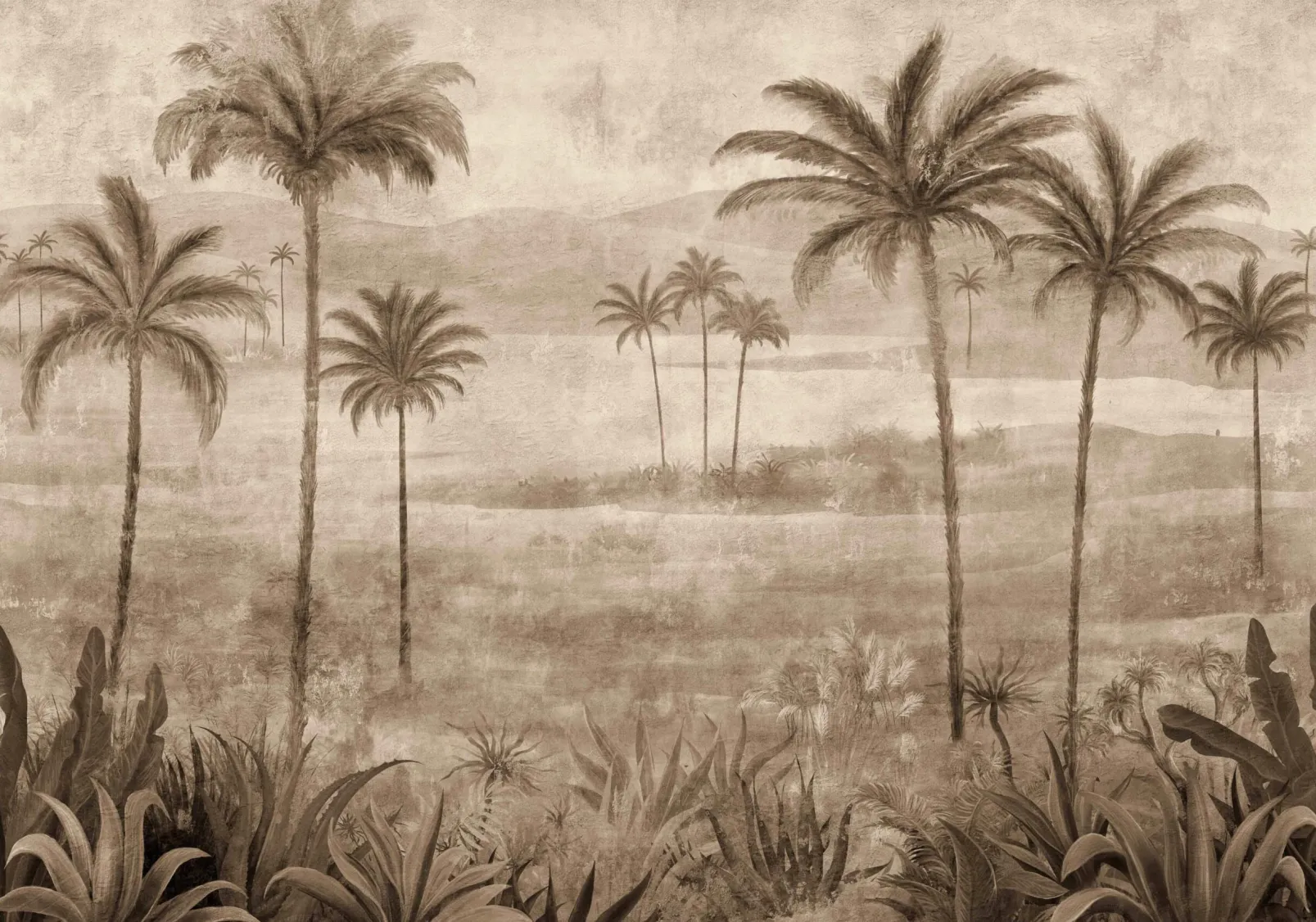 Draa Palms Bone de Coordonne es un papel pintado de inspiración vegetal en tonos Beige/Nude de la colección Bereber. Esbeltas palmeras se mecen bajo el intenso sol de Marrakech.