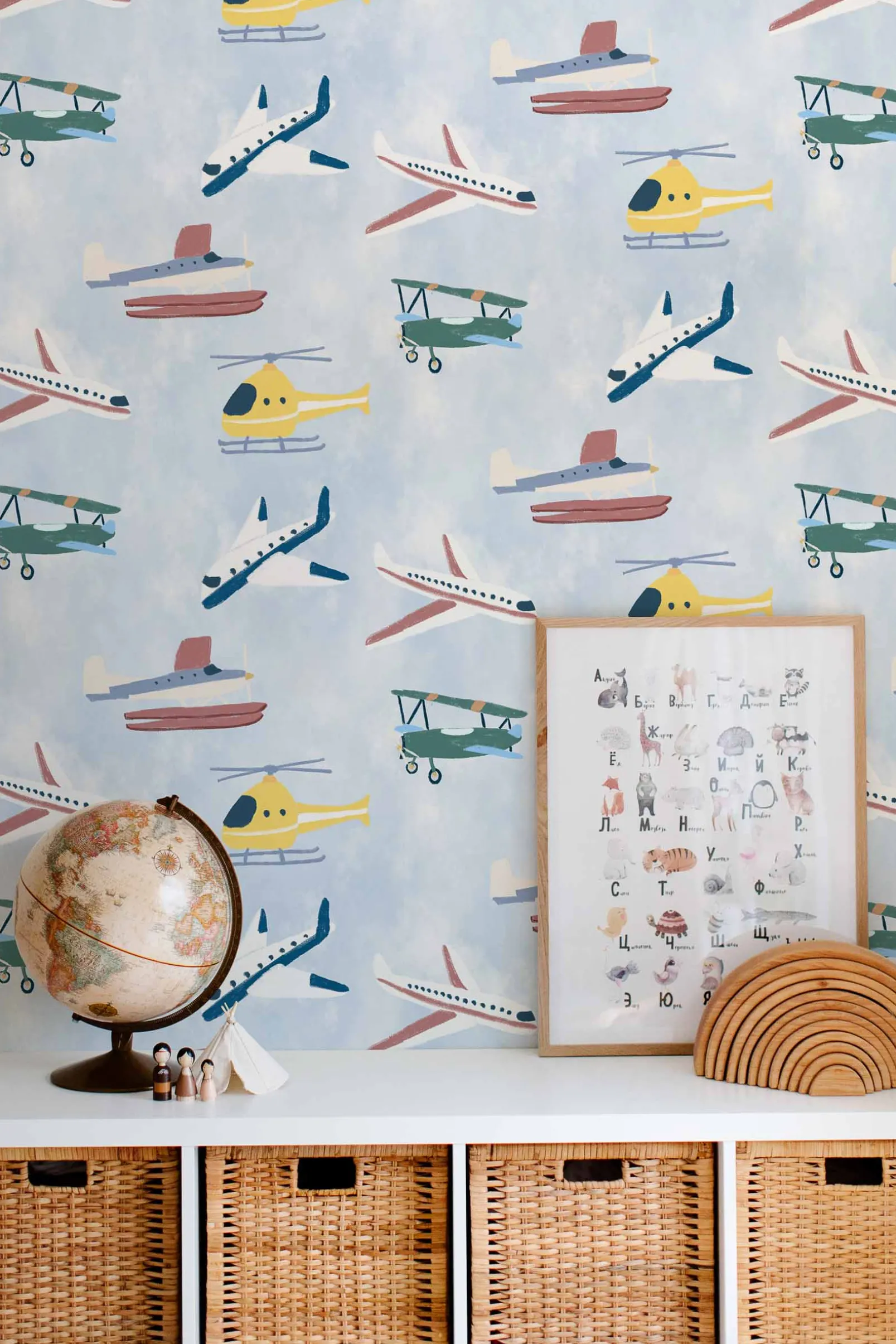 El papel pintado Draft planes Sky de Coordonné es un objeto diseñado en tonos azul/marino de la colección Random Kids.