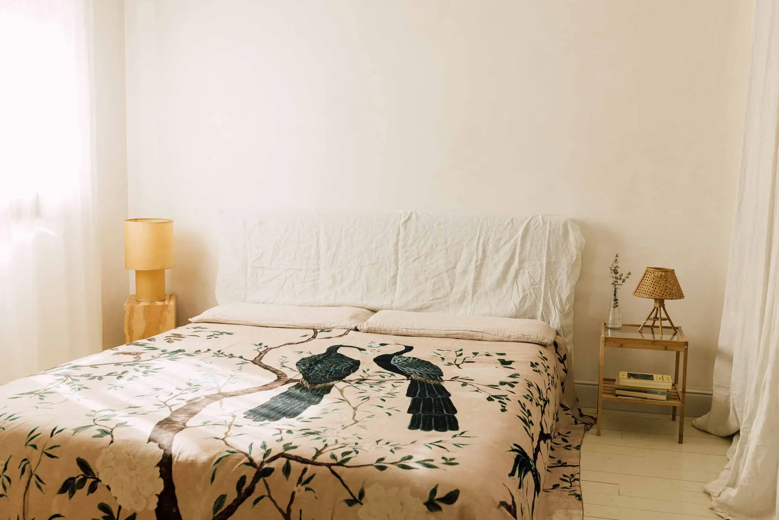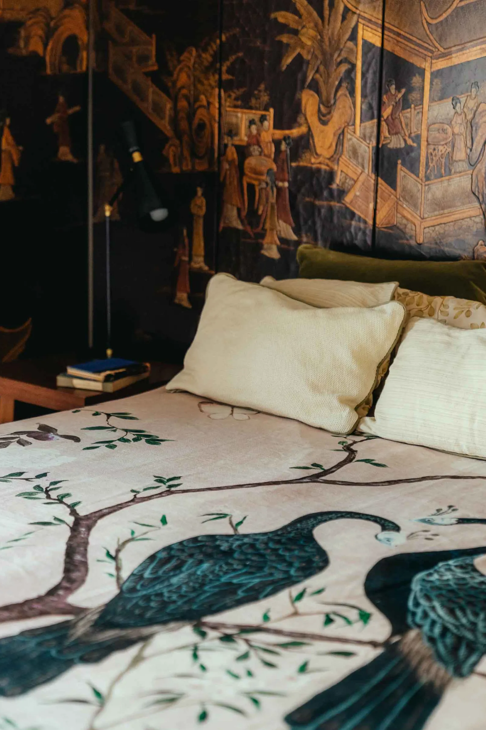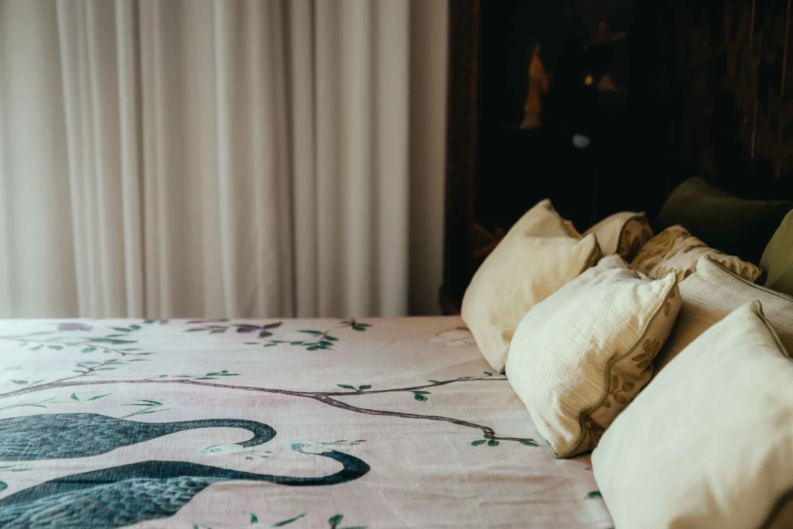 La suavidad del rosa pálido realza el plumaje de los pavos reales.