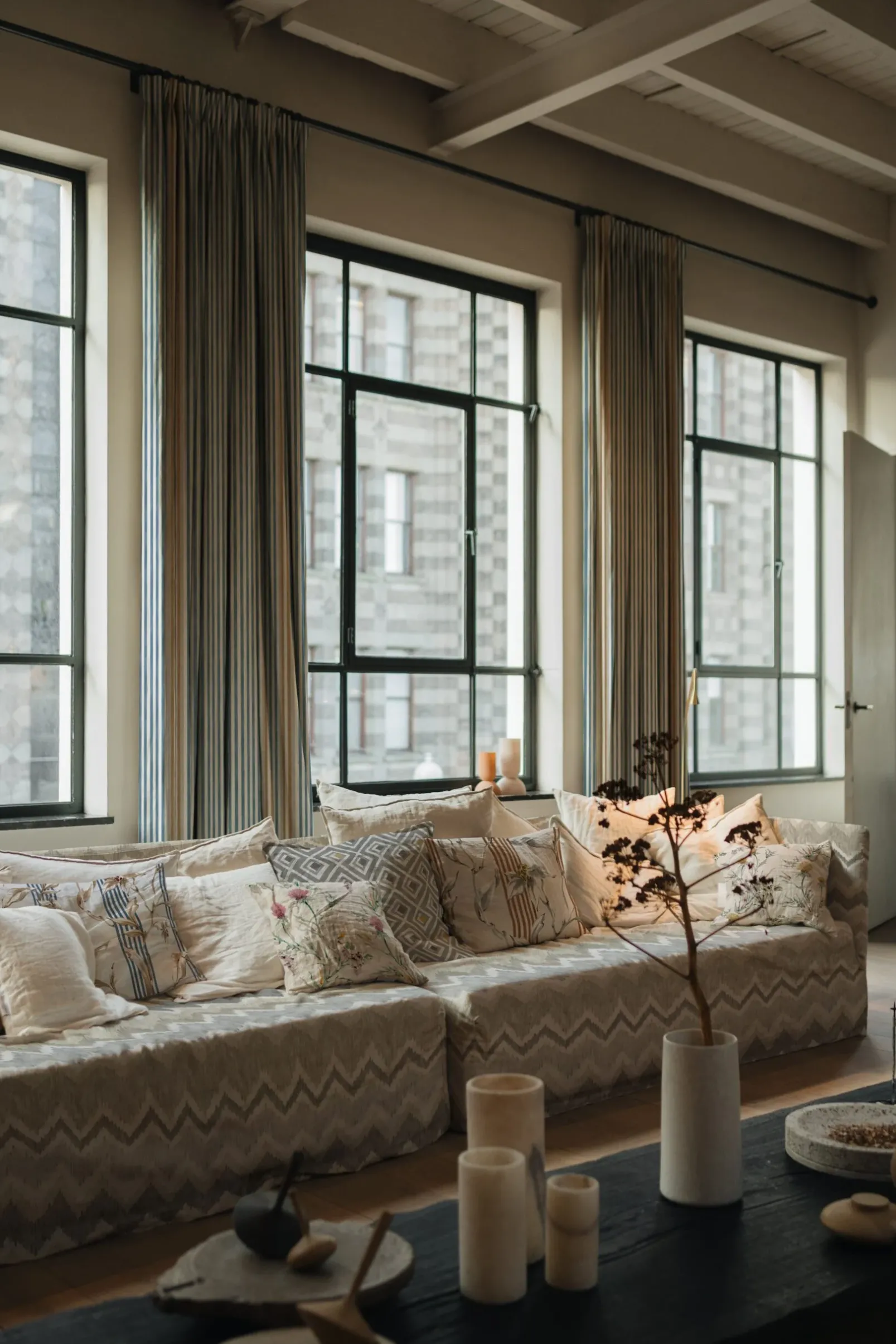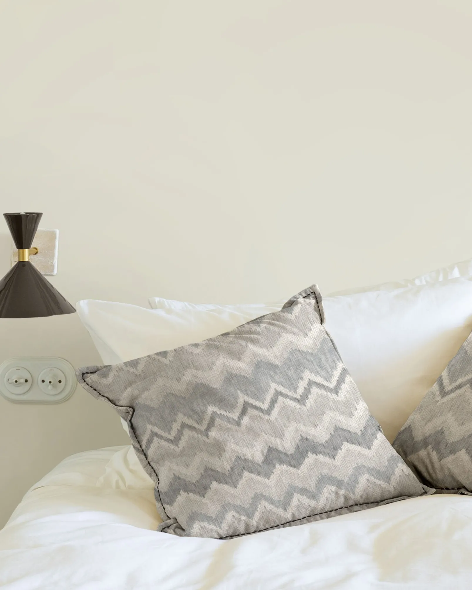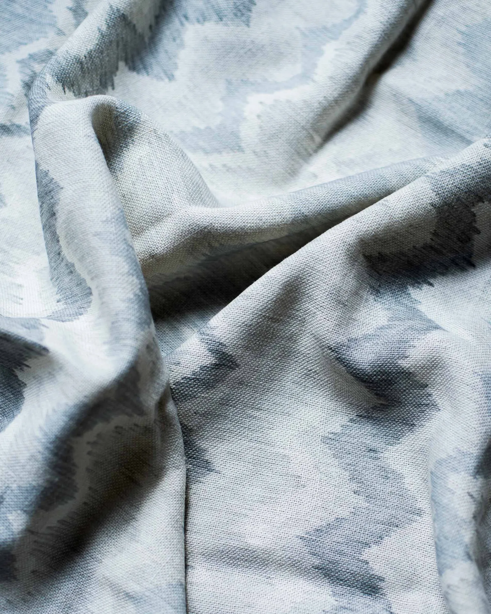 La tela Estanque Nube de Coordonné es un diseño de inspiración geométrica en azul/gris de la colección Palacio de Cristal Fabrics.