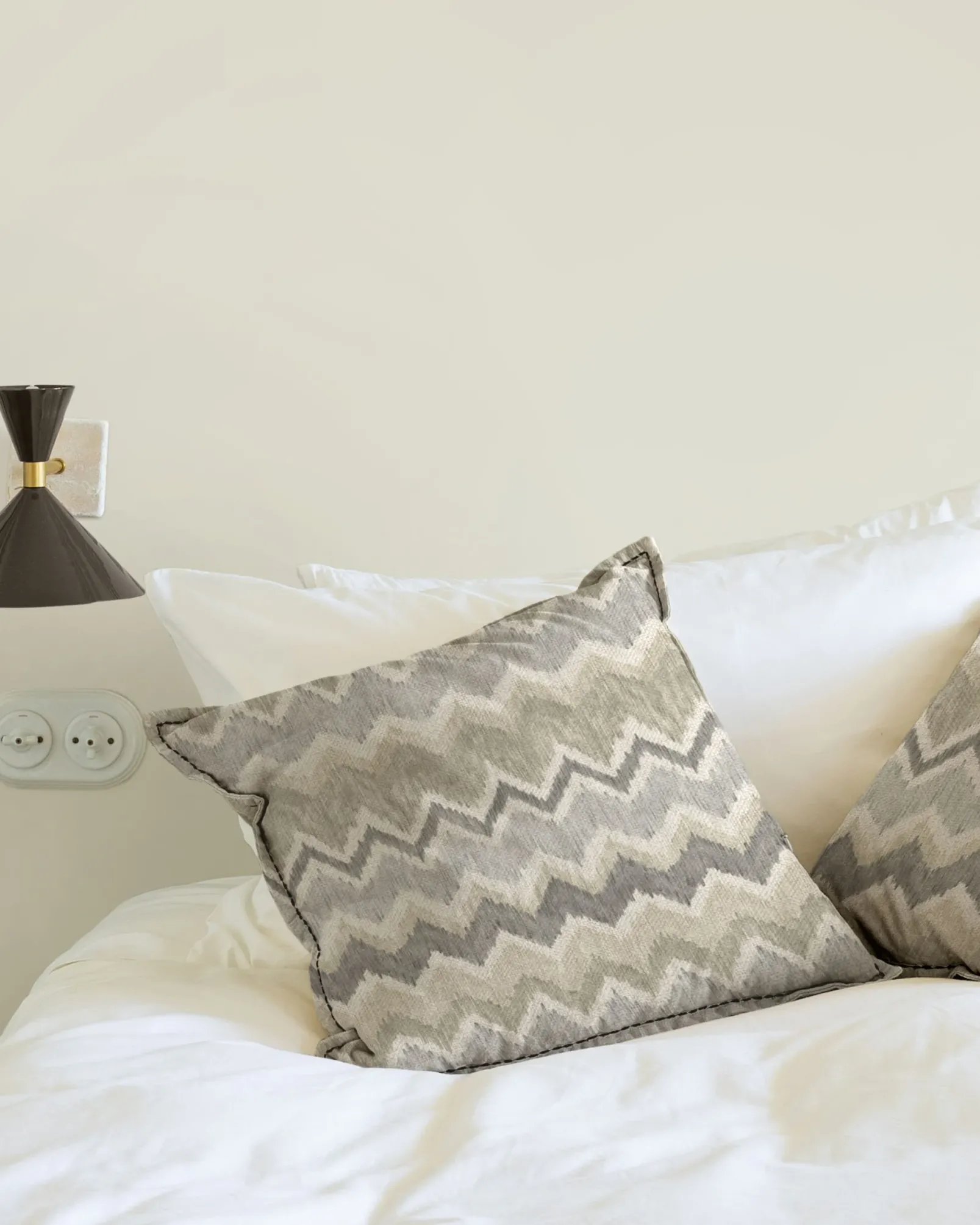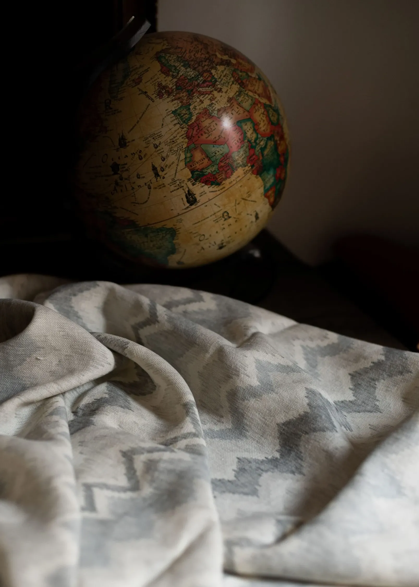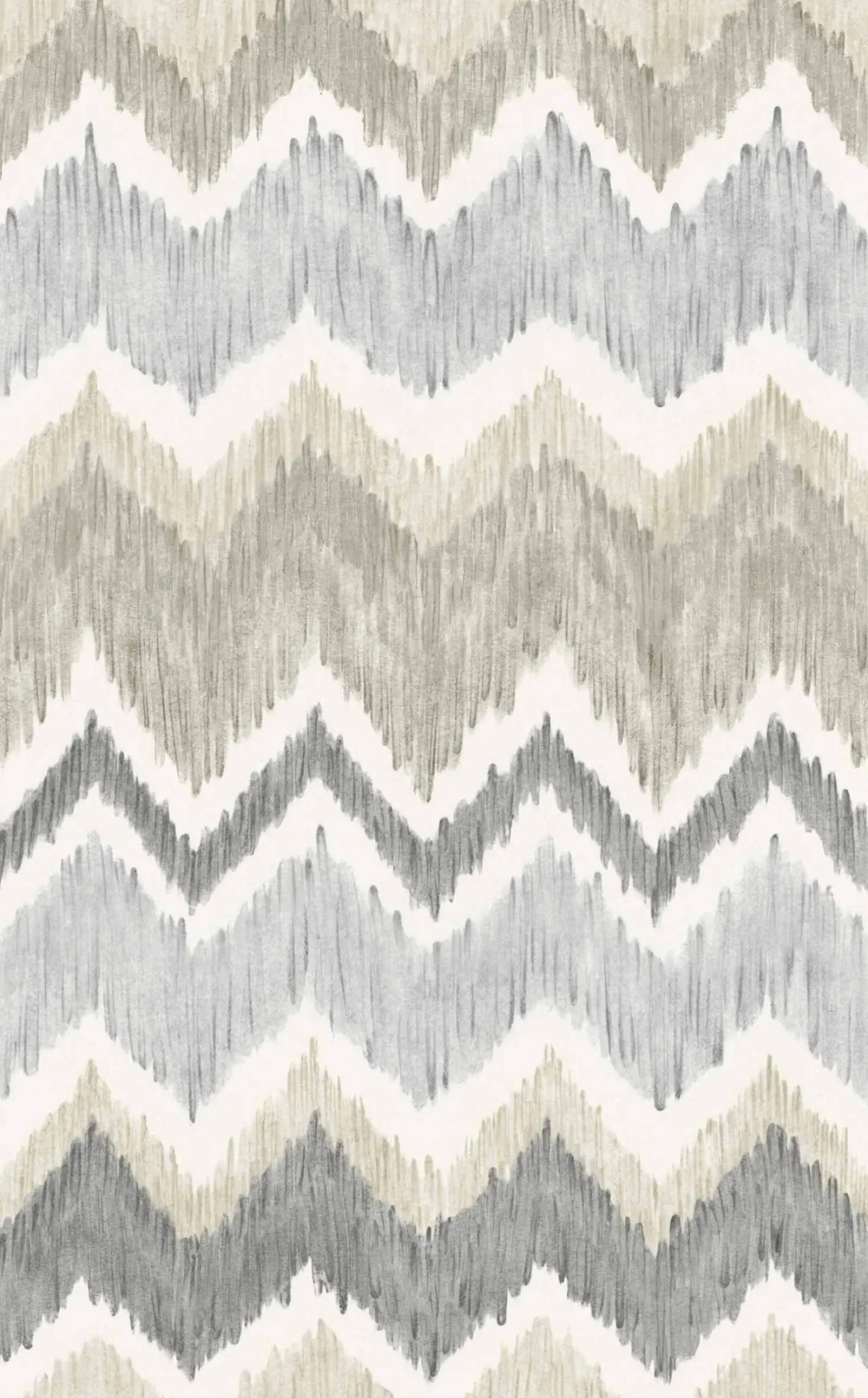 La tela Estanque Papiro de Coordonné es un diseño de inspiración geométrica en marrón/gris de la colección Palacio de Cristal Fabrics.