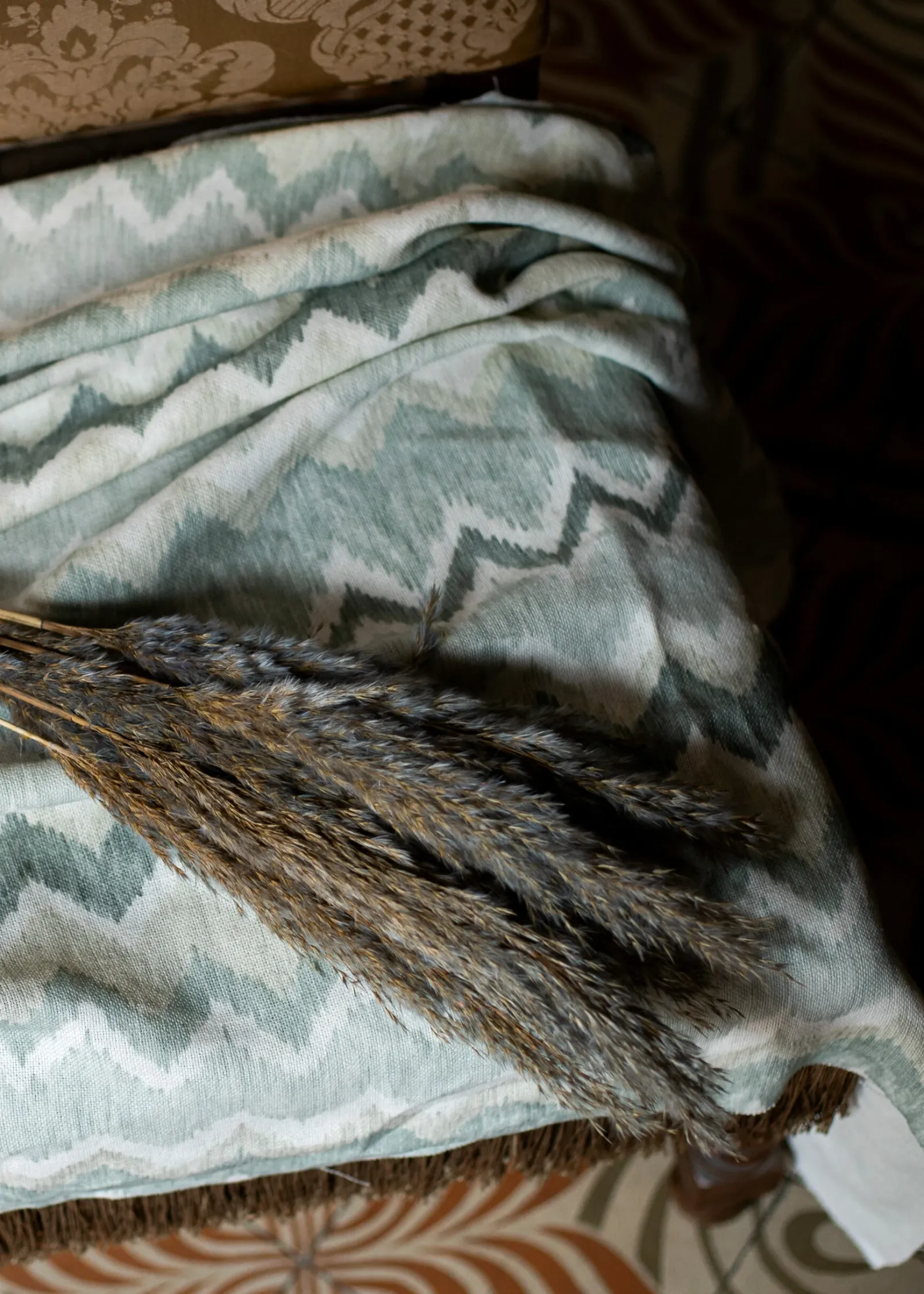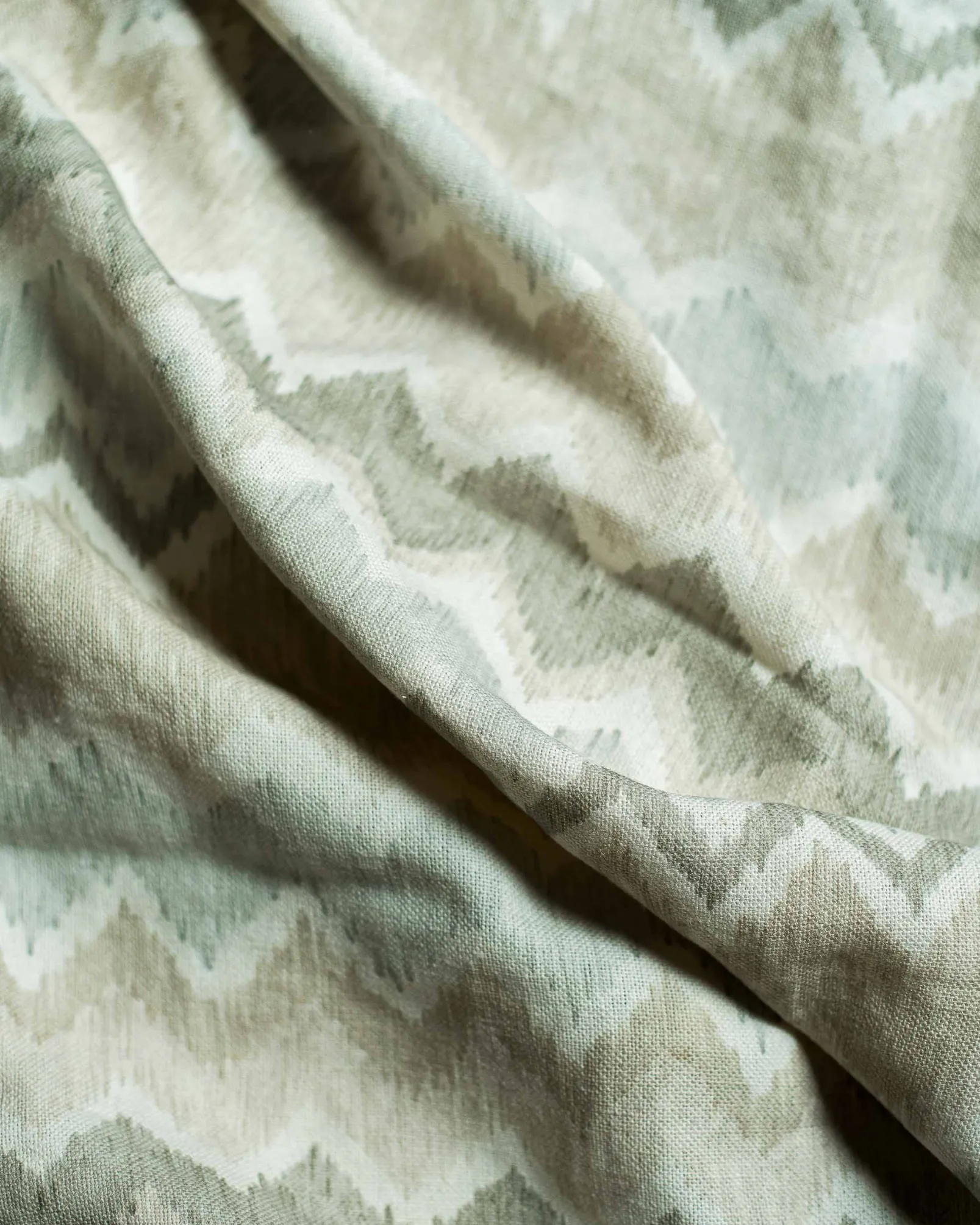 La tela Estanque Sage de Coordonné es un diseño de inspiración geométrica en verde/gris de la colección Palacio de Cristal Fabrics.