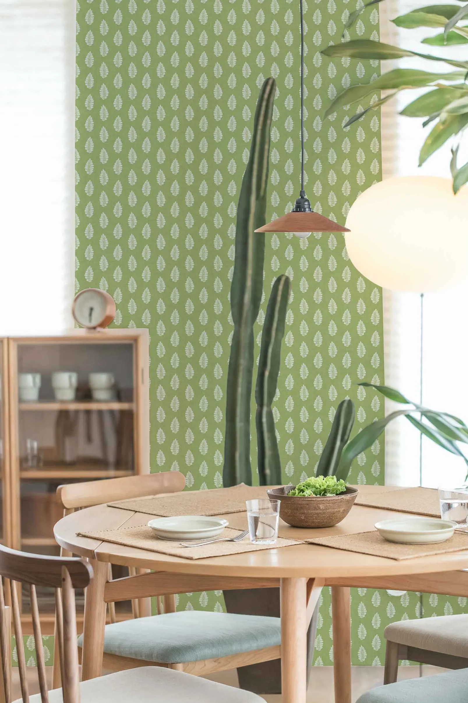 El papel pintado Feather Parade Mint de Coordonné es un diseño vegetal en tonos verdes de la colección Enchanted.