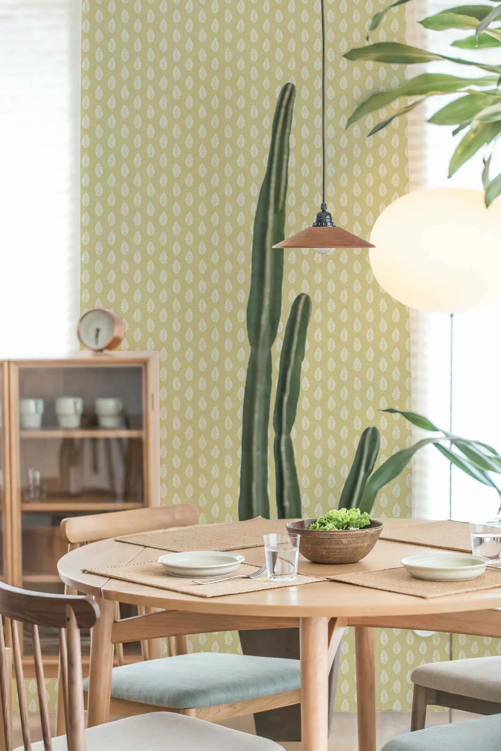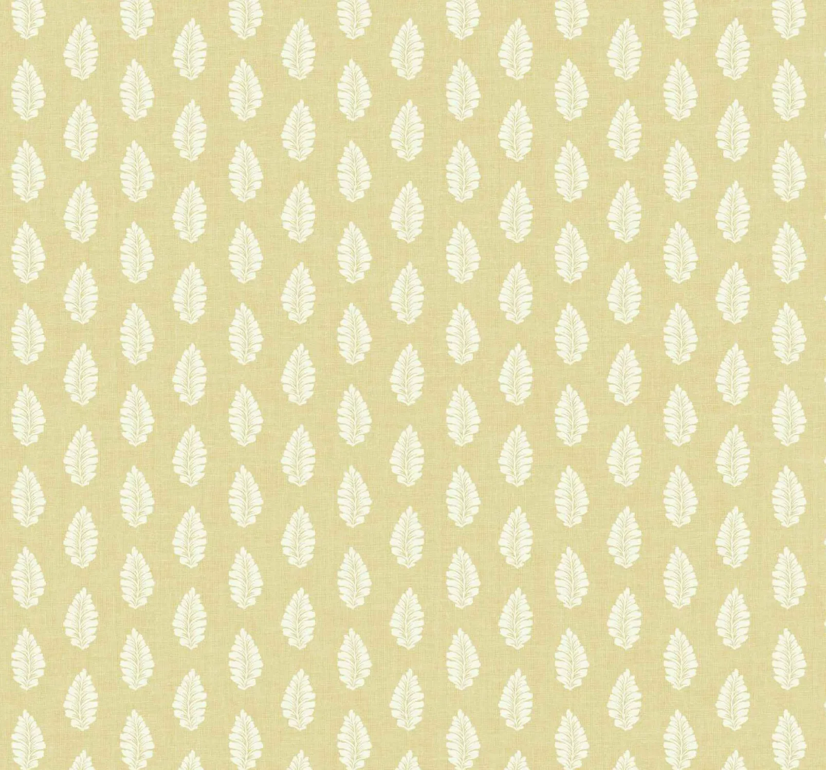 El papel pintado Feather Parade Vainilla de Coordonné es un diseño vegetal en tonos amarillo/naranja de la colección Enchanted.
