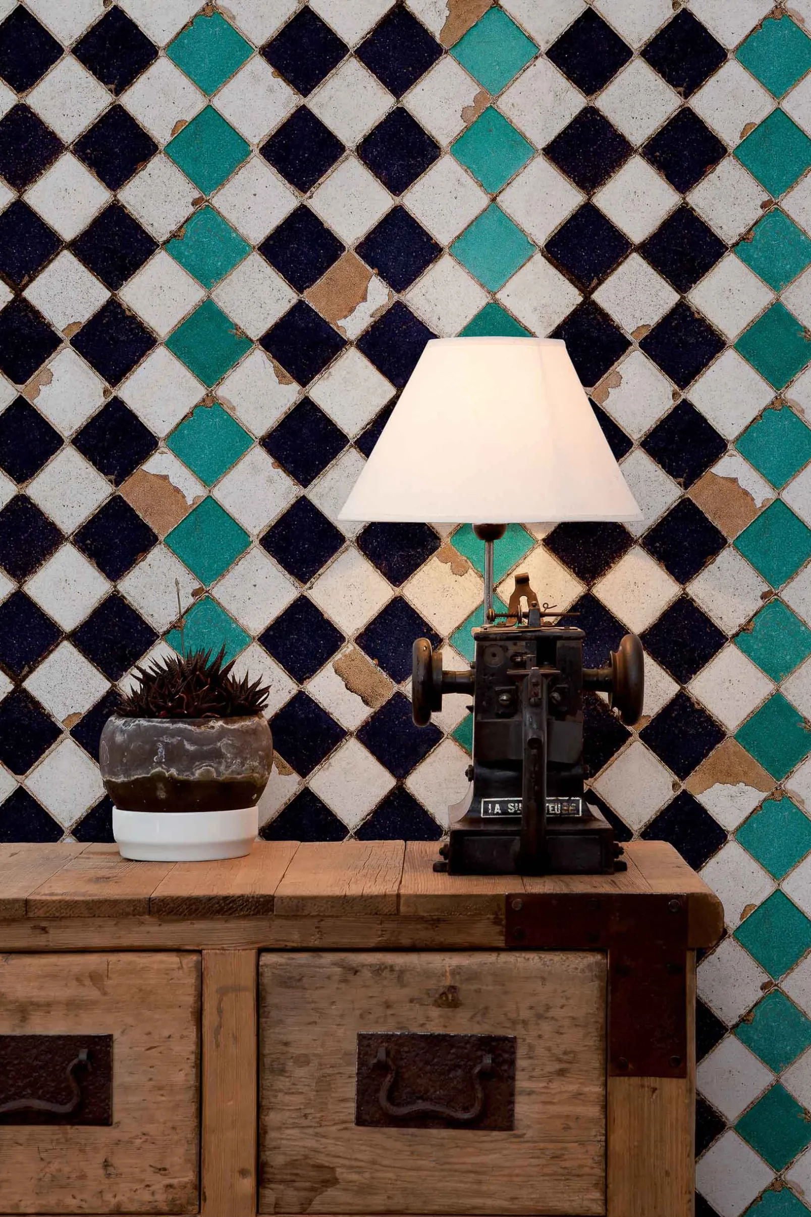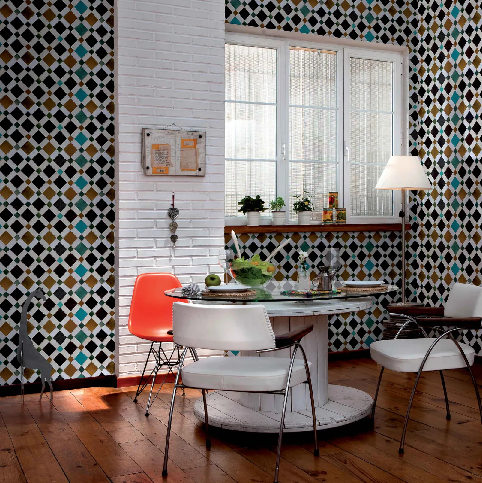 El papel pintado Feria de Coordonné es un diseño geométrico en tonos verdes de la colección Tiles.