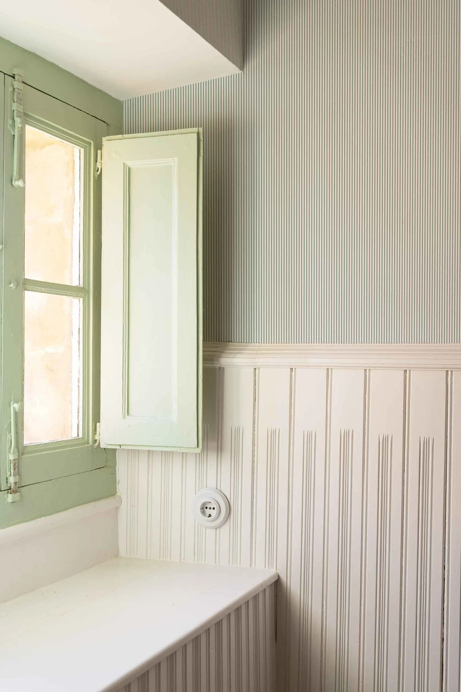 Fermín Celadón de Coordonné es un diseño de rayas en verde y blanco de la colección Feria. Fresco multirayas bicolor.
