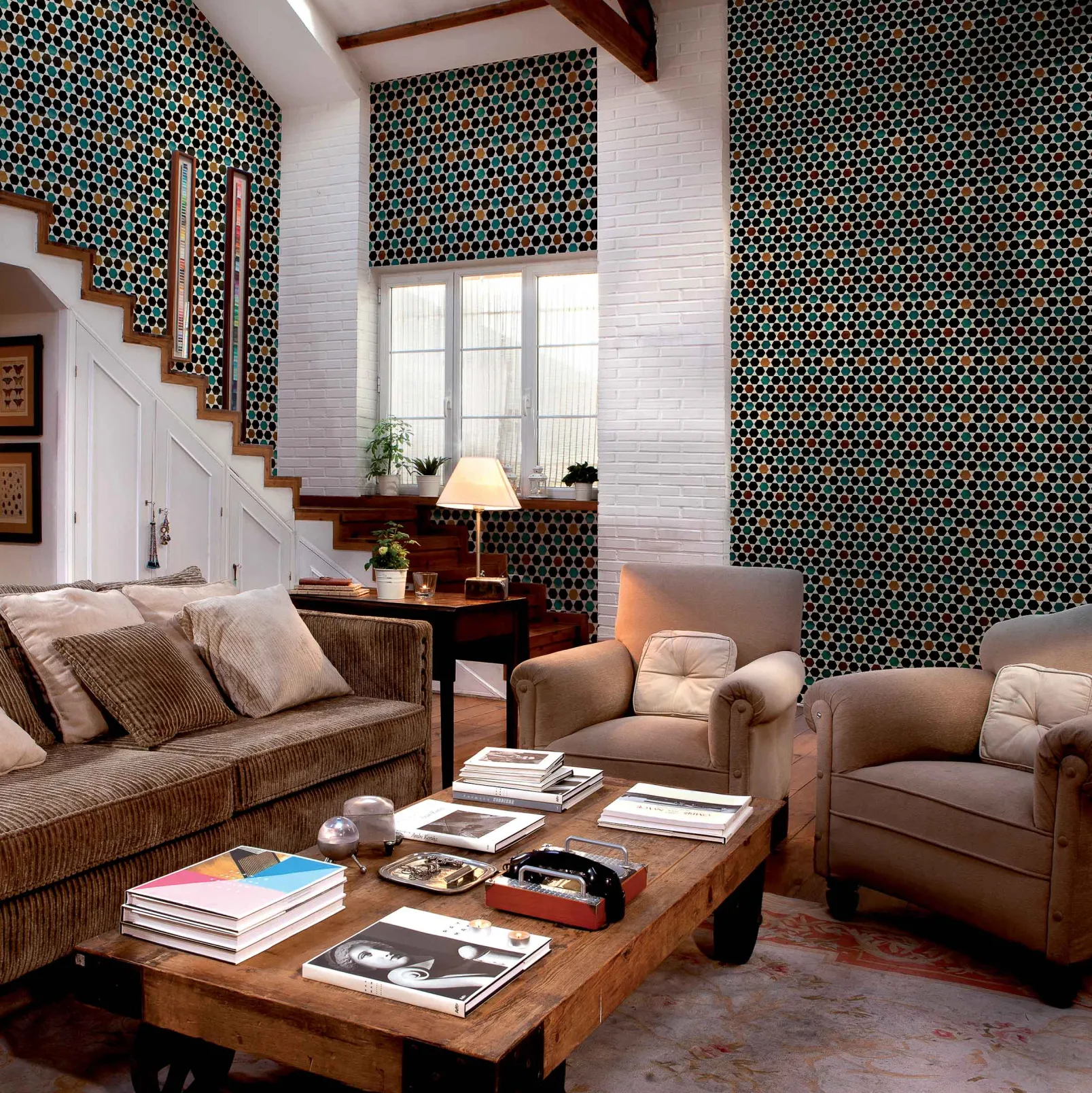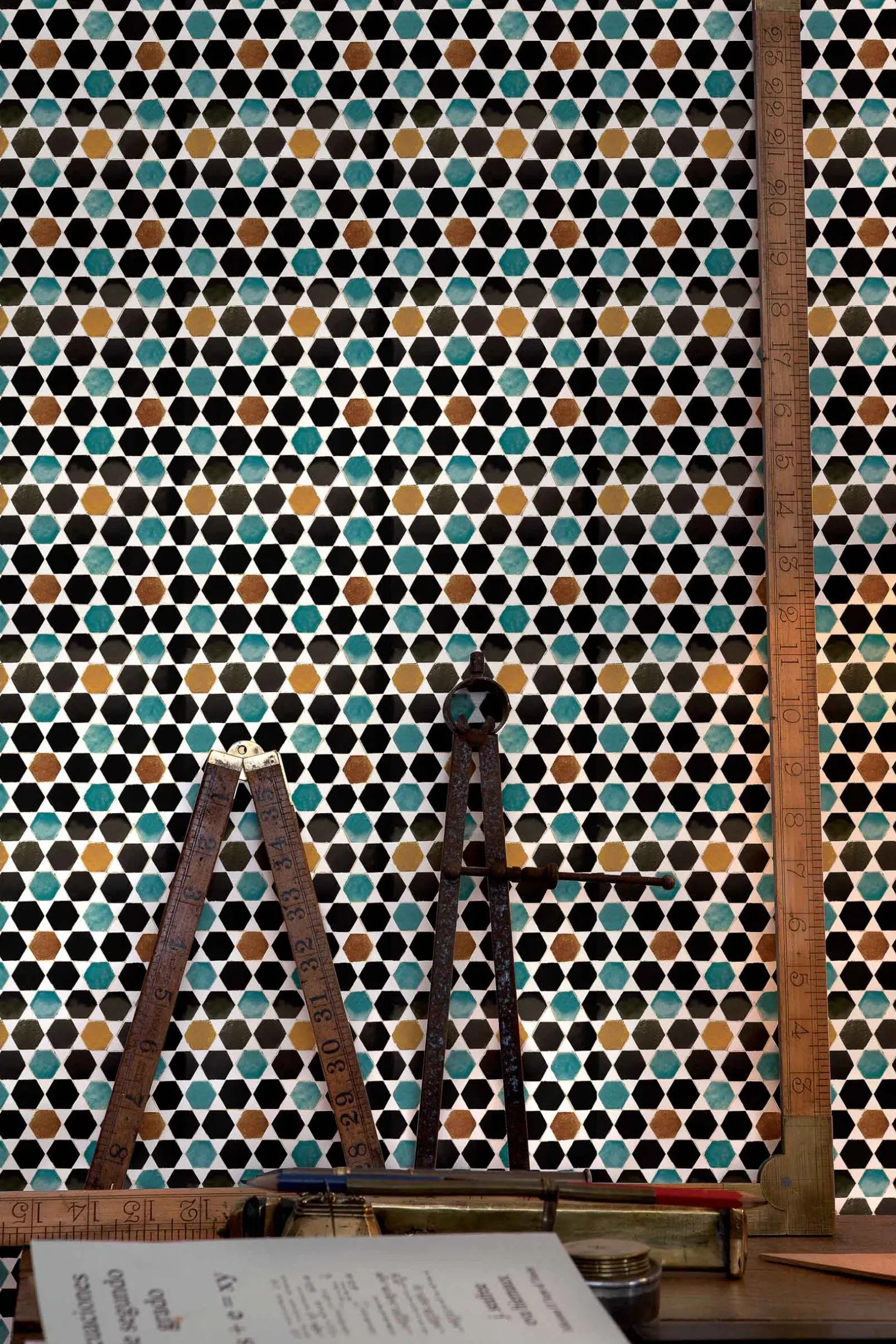 El papel pintado Flamenco de Coordonné es un diseño geométrico en tonos verdes de la colección Tiles.