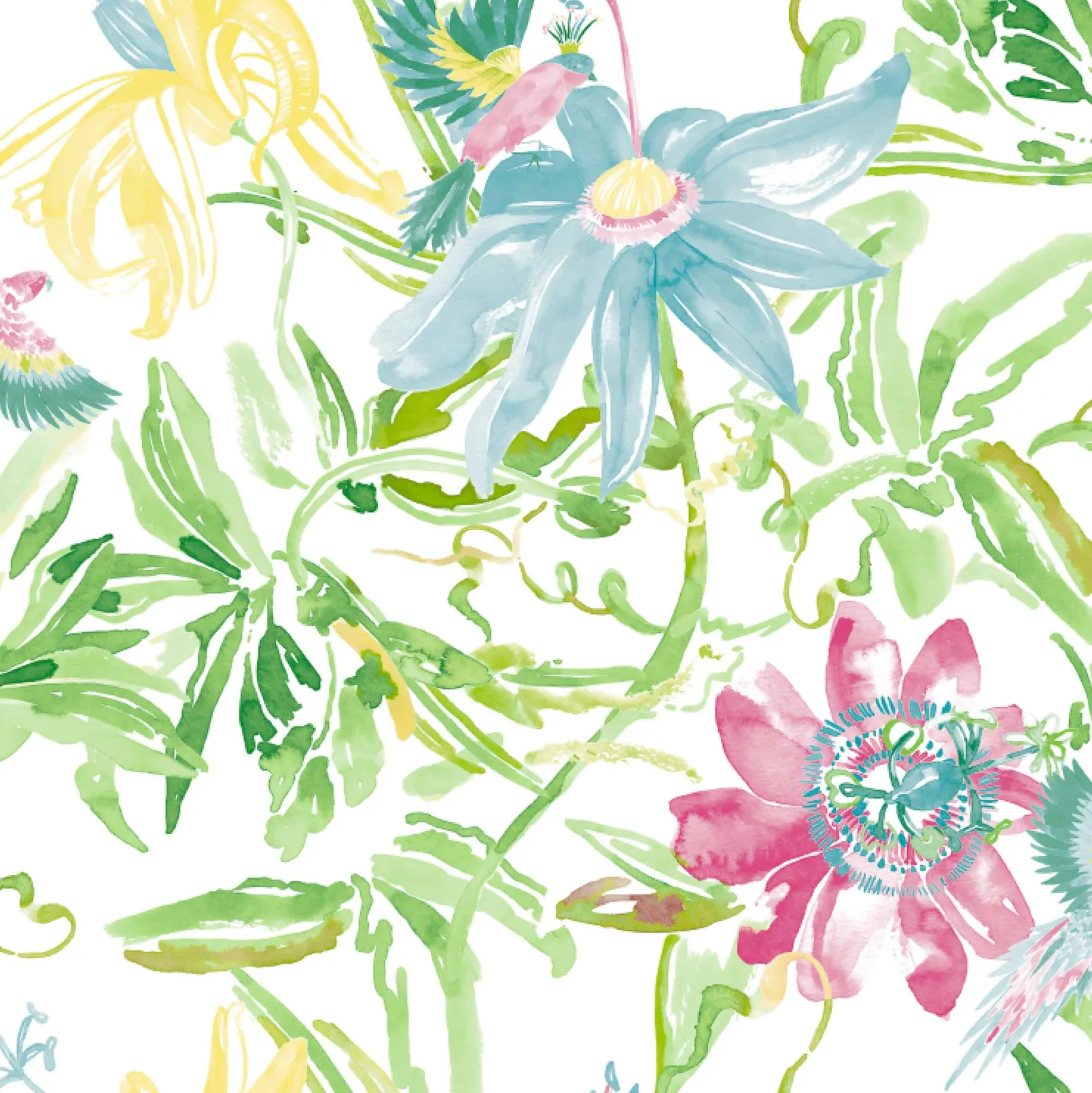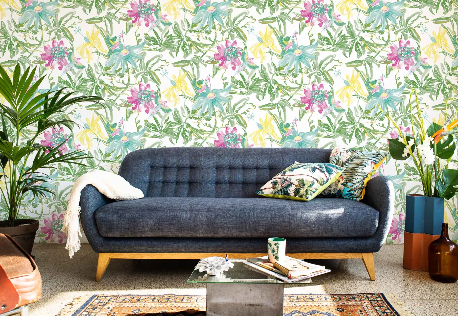 El papel pintado Flowers fresh de Coordonné es un diseño floral en tonos azules/azules de la colección Lara Costafreda.