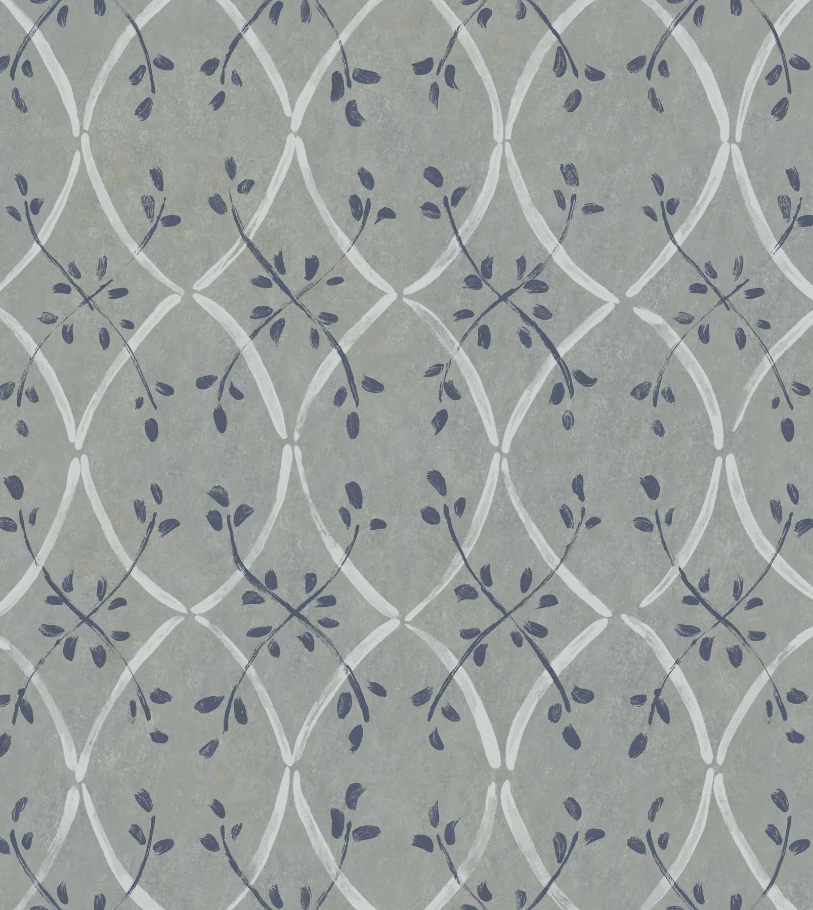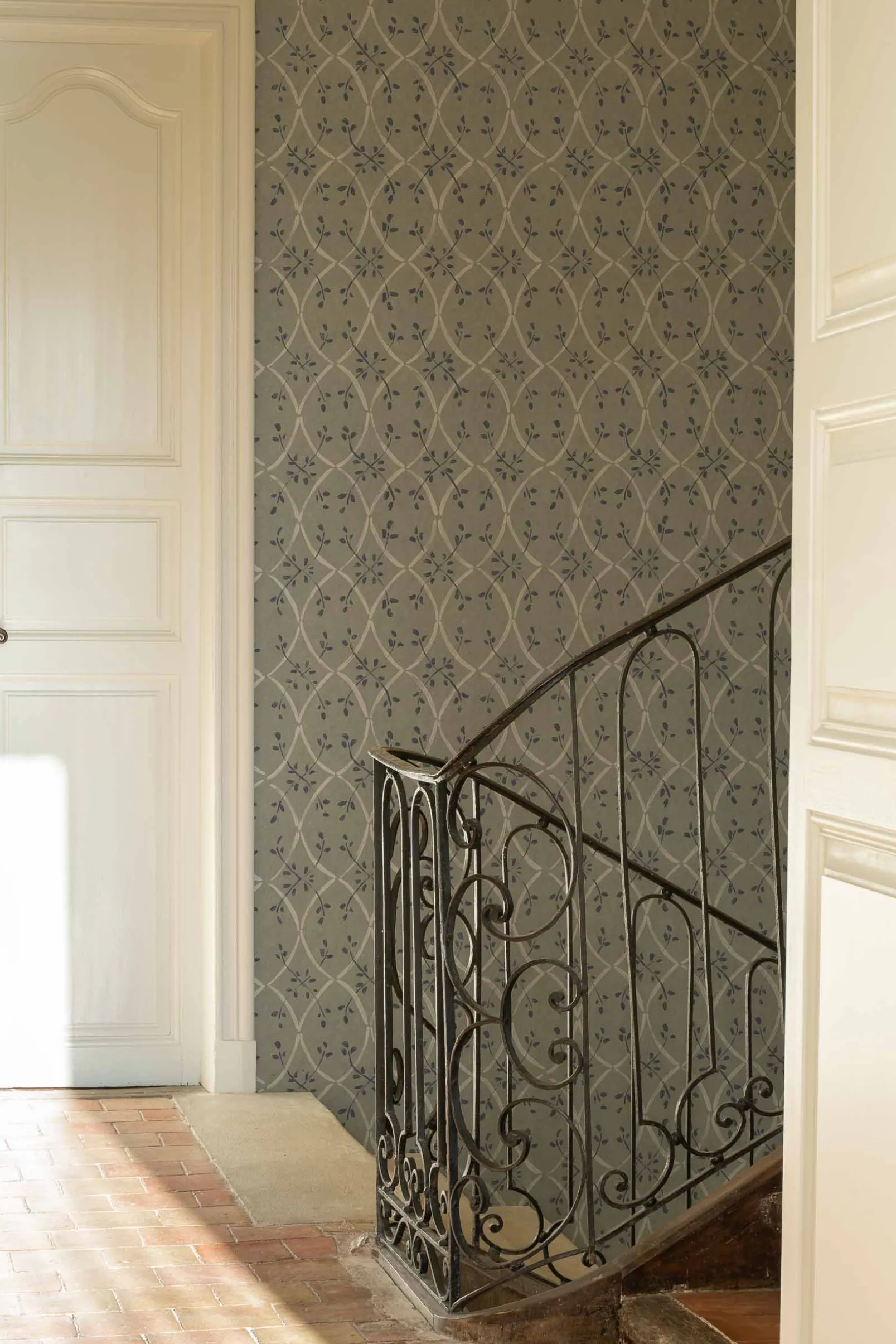 Forja Avio de Coordonn es un papel pintado de inspiración vegetal en tonos azules/azules marinos. Hierro forjado ovalado que sostiene valientes jazmines italianos.