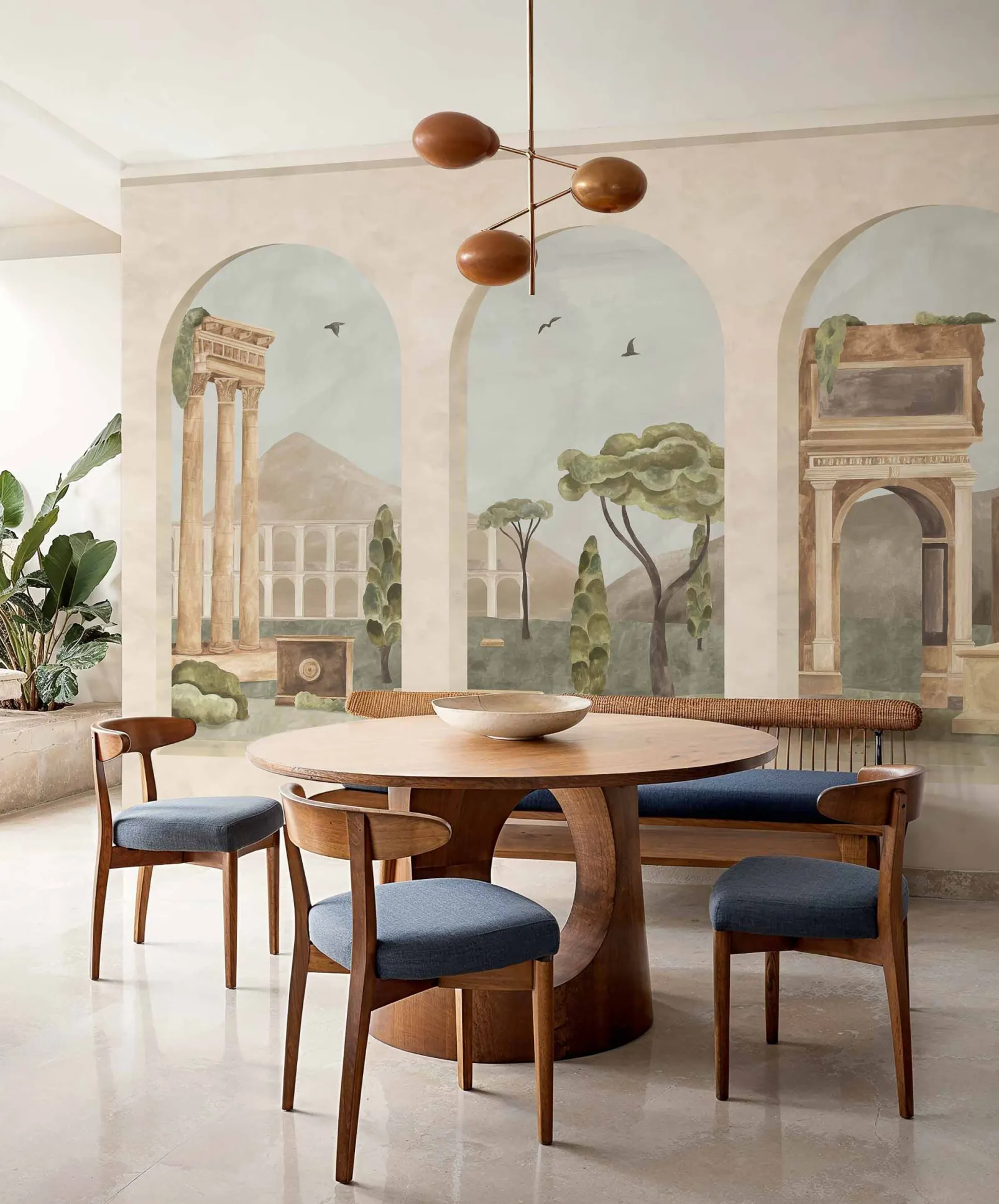 Forum Summer de Coordonné es un diseño de Paisajes en Beige/Nude de la colección Pompei. La vista entre arcos de los vestigios de una vida pública ajetreada y caótica.