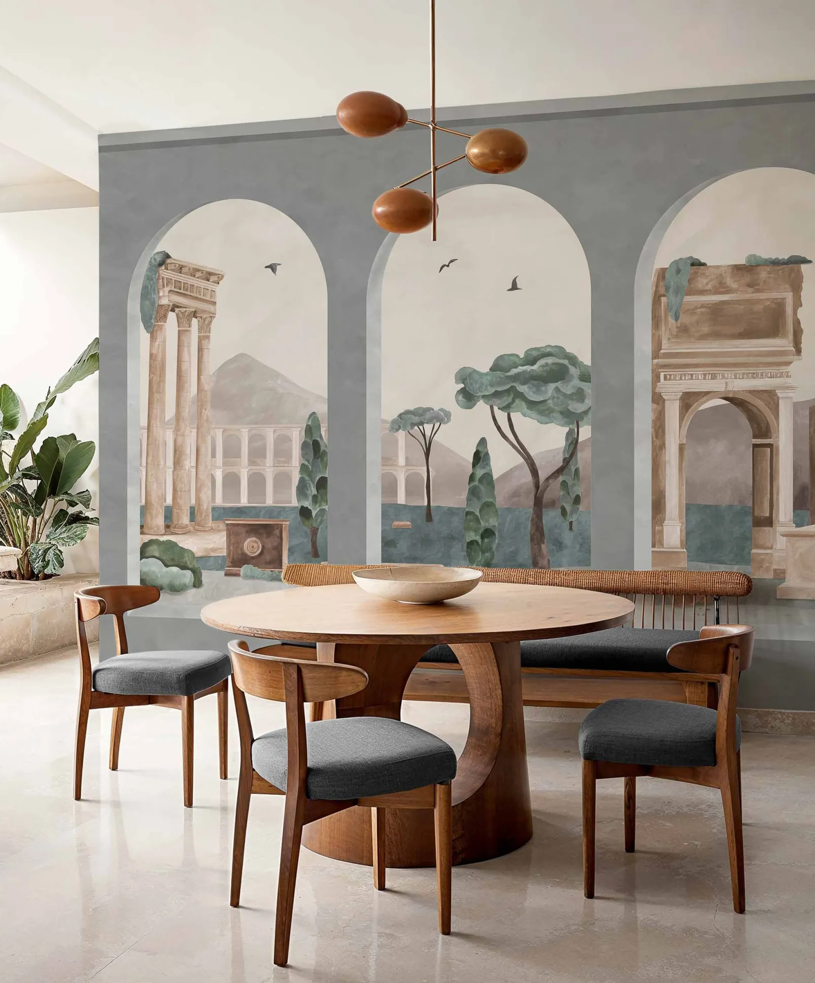 Forum Winter de Coordonné es un diseño de Paisajes en azul/azul marino de la colección Pompei. La vista entre arcos de los vestigios de una vida pública ajetreada y caótica.