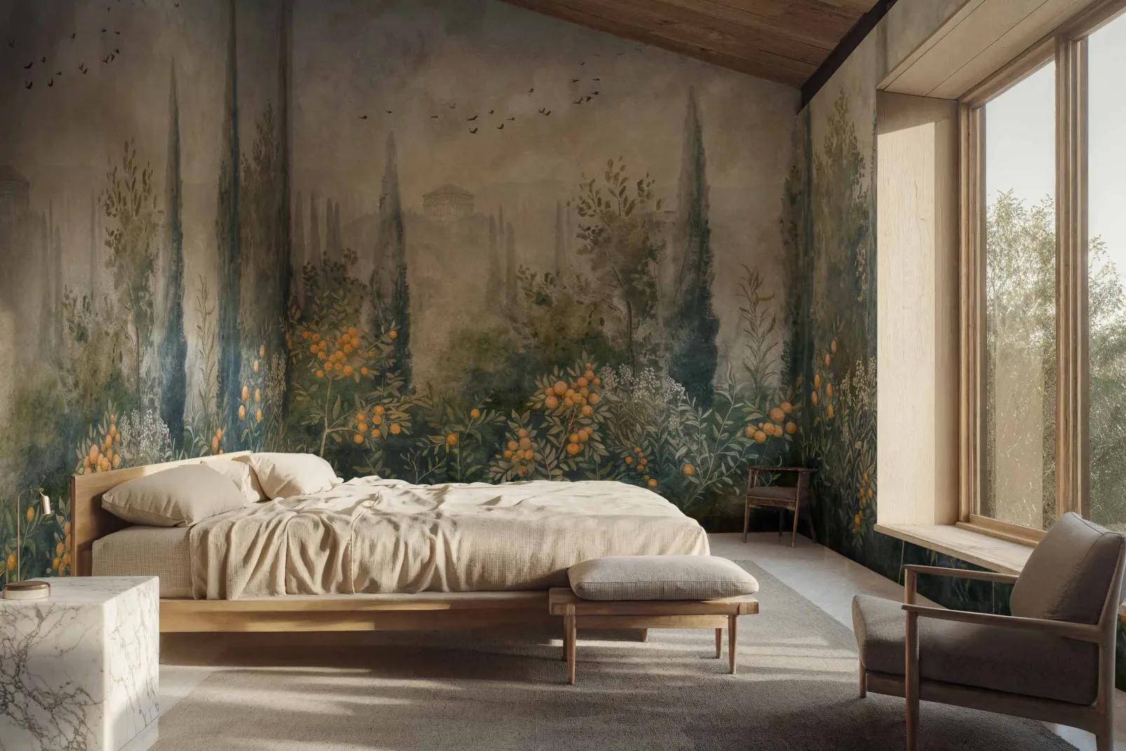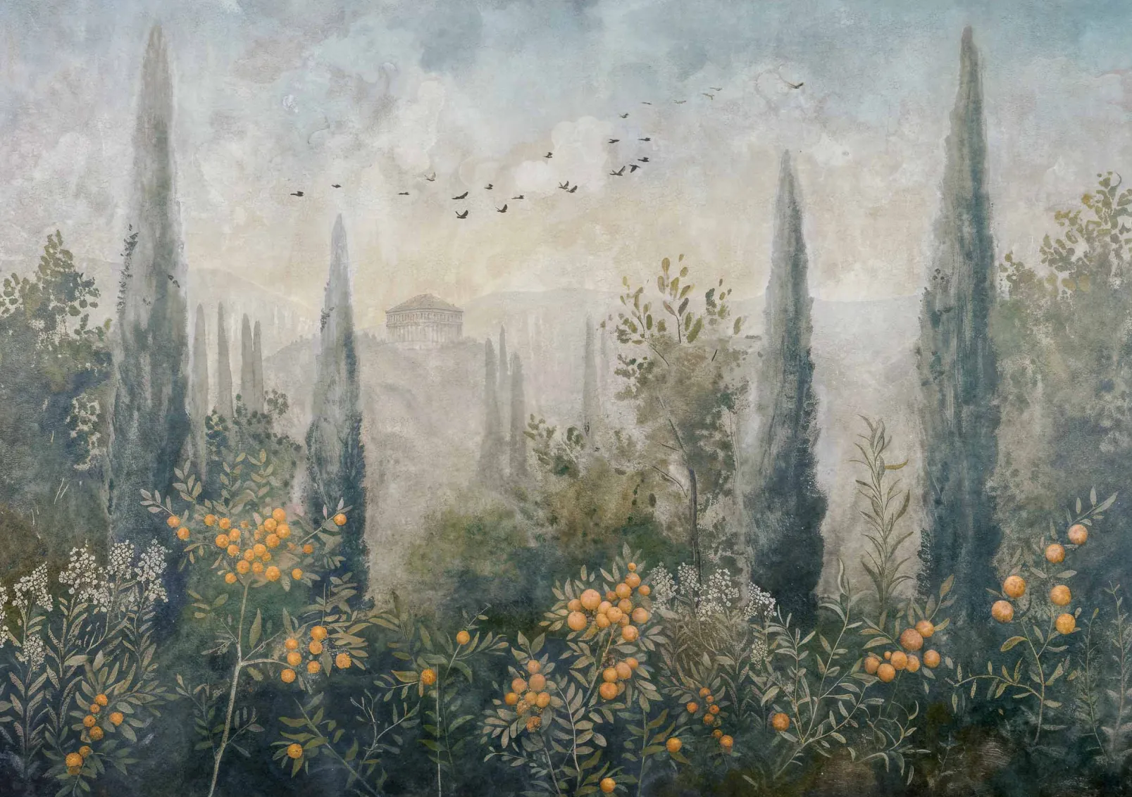 Frutetto Winter de Coordonné es un diseño de Paisajes en azul/azul marino de la colección Pompei. Un edén de granados y naranjos, coronado por pájaros y cipreses que evocan la fertilidad.