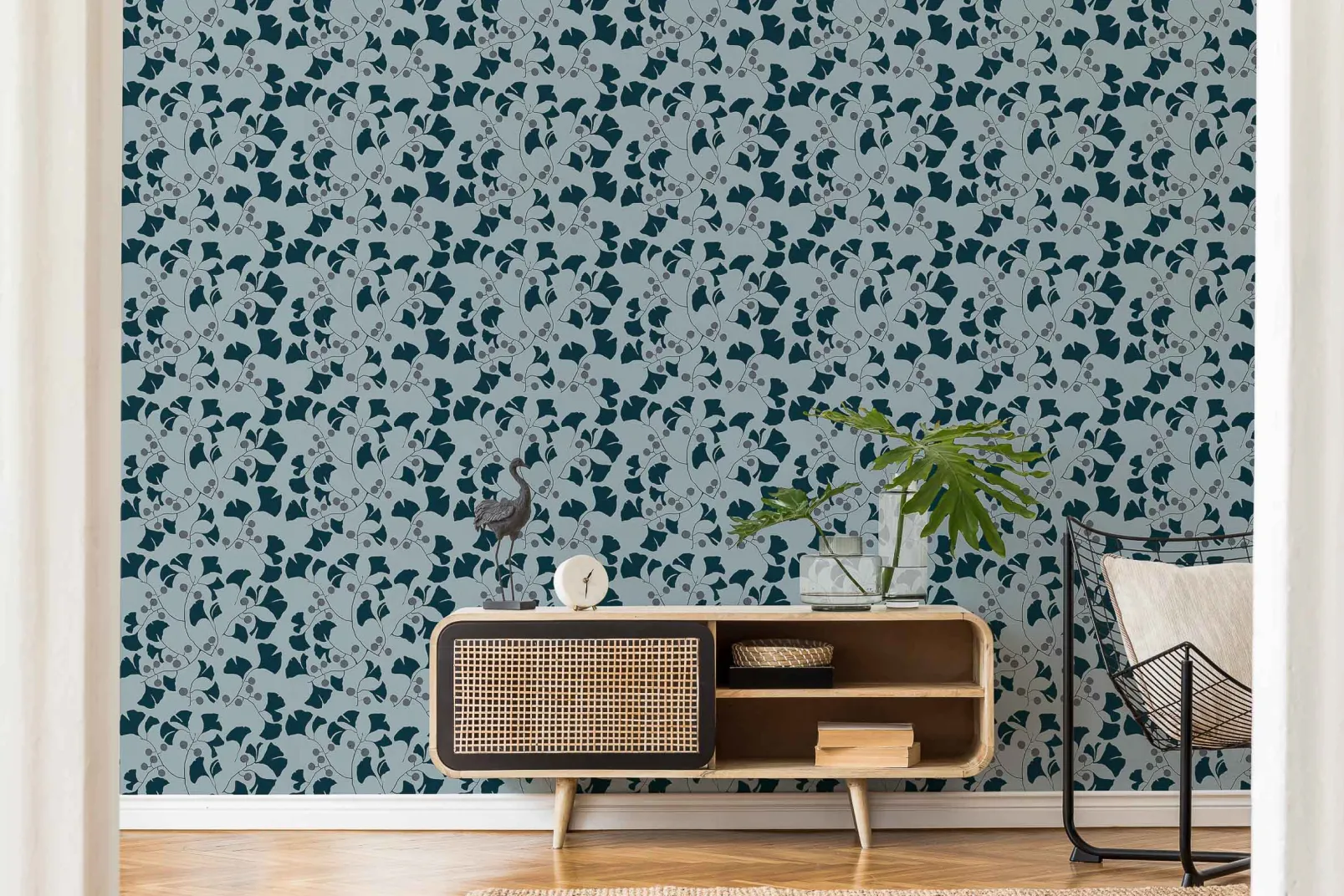 El papel pintado Furoshiki Sea de Coordonné es un diseño vegetal en tonos azul/marino de la colección Wander.