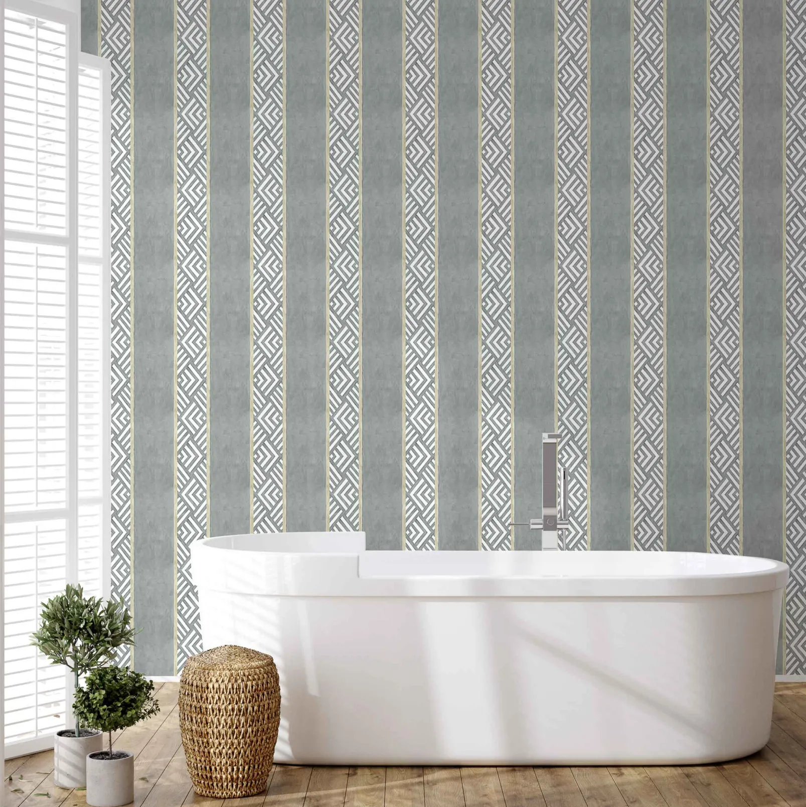 El papel pintado Galería Pistacho de Coordonné es un diseño de rayas en tonos blanco/gris de la colección Indiano.