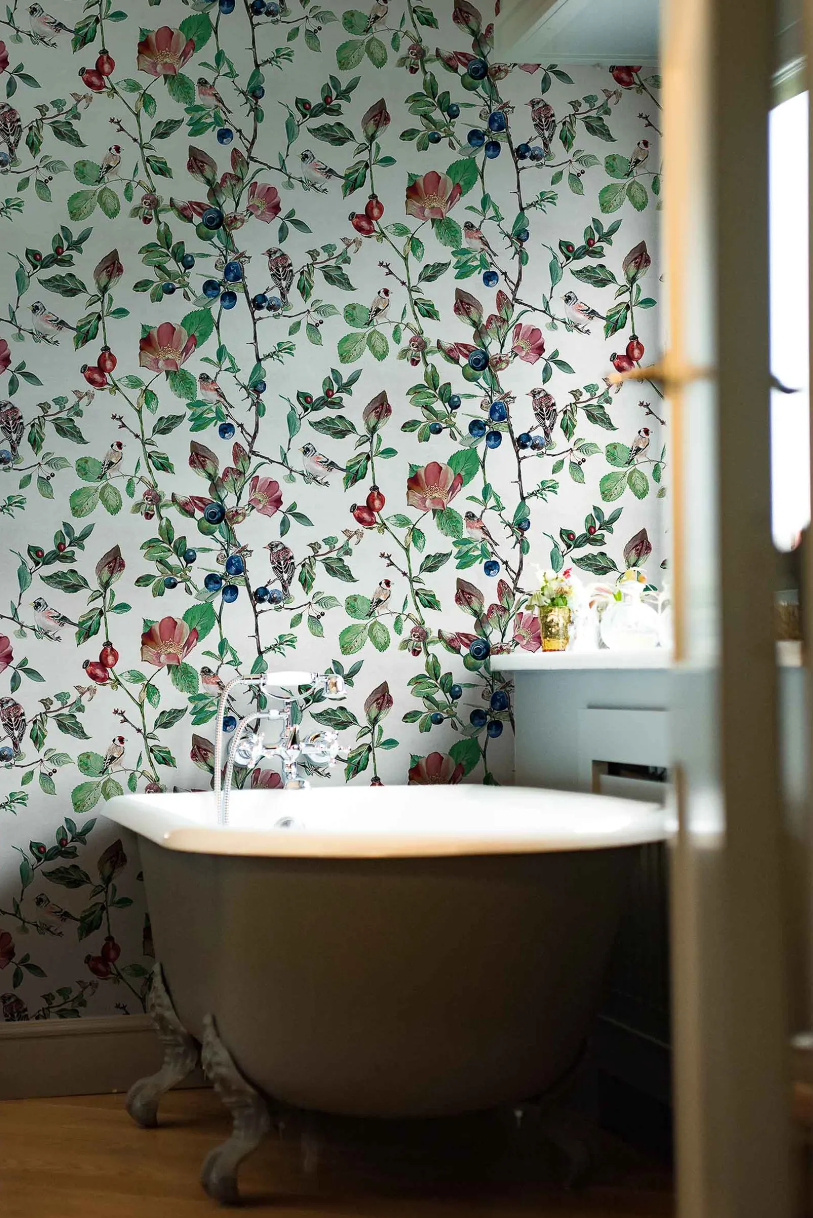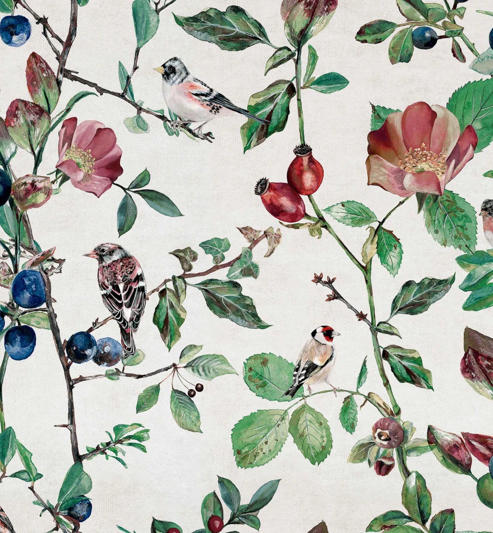 El papel pintado de algodón Goldfinch Song de Coordonné es un diseño floral en tonos blanco/gris de la colección Naturae.
