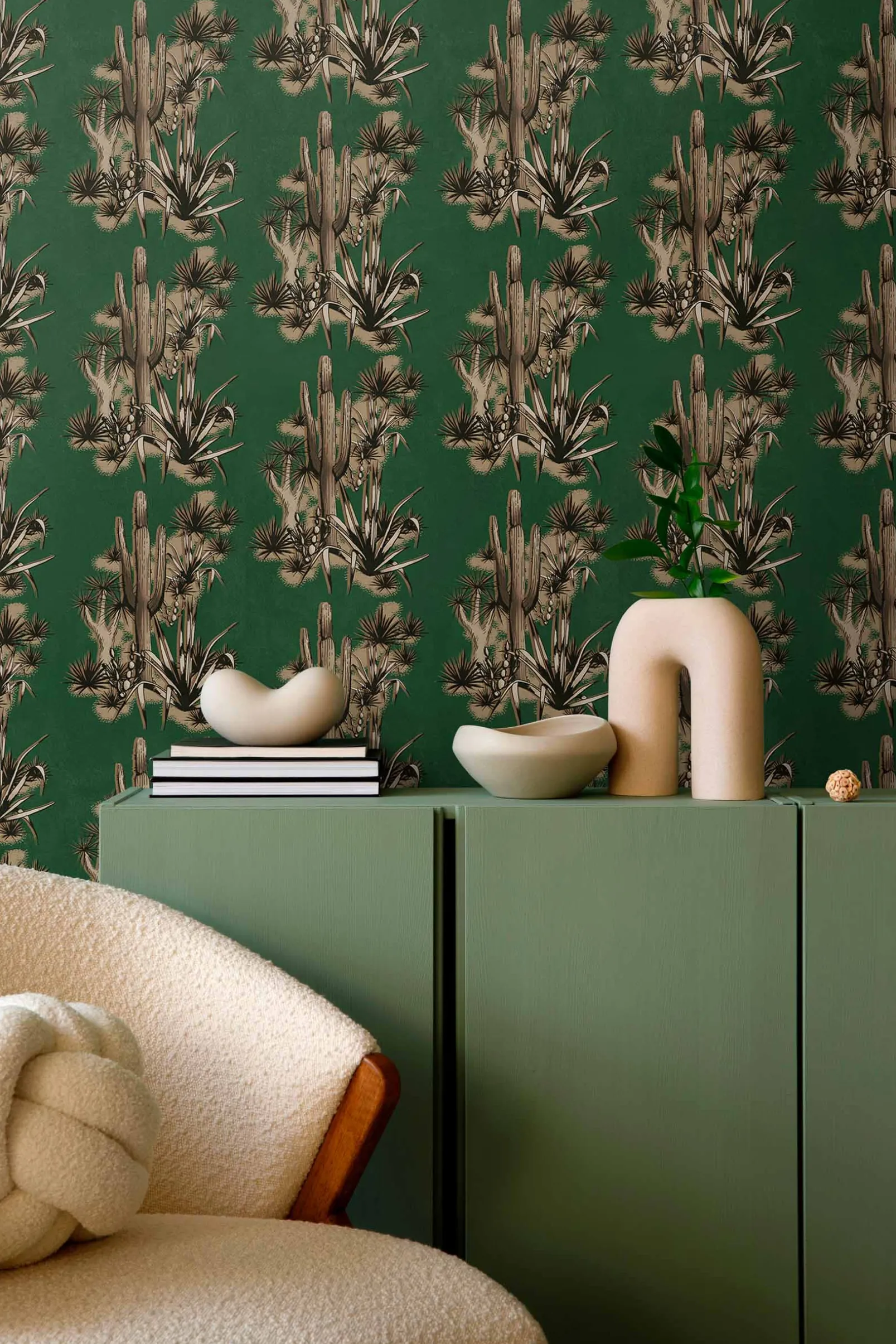 El papel pintado Grand Canyon Green de Coordonné es un diseño vegetal en tonos verdes de la colección Central Saint Martins – Rest Time. El Cañón del Colorado y los páramos desérticos me transmiten buenas vibraciones; me dan algo más que buenos recuerdos.