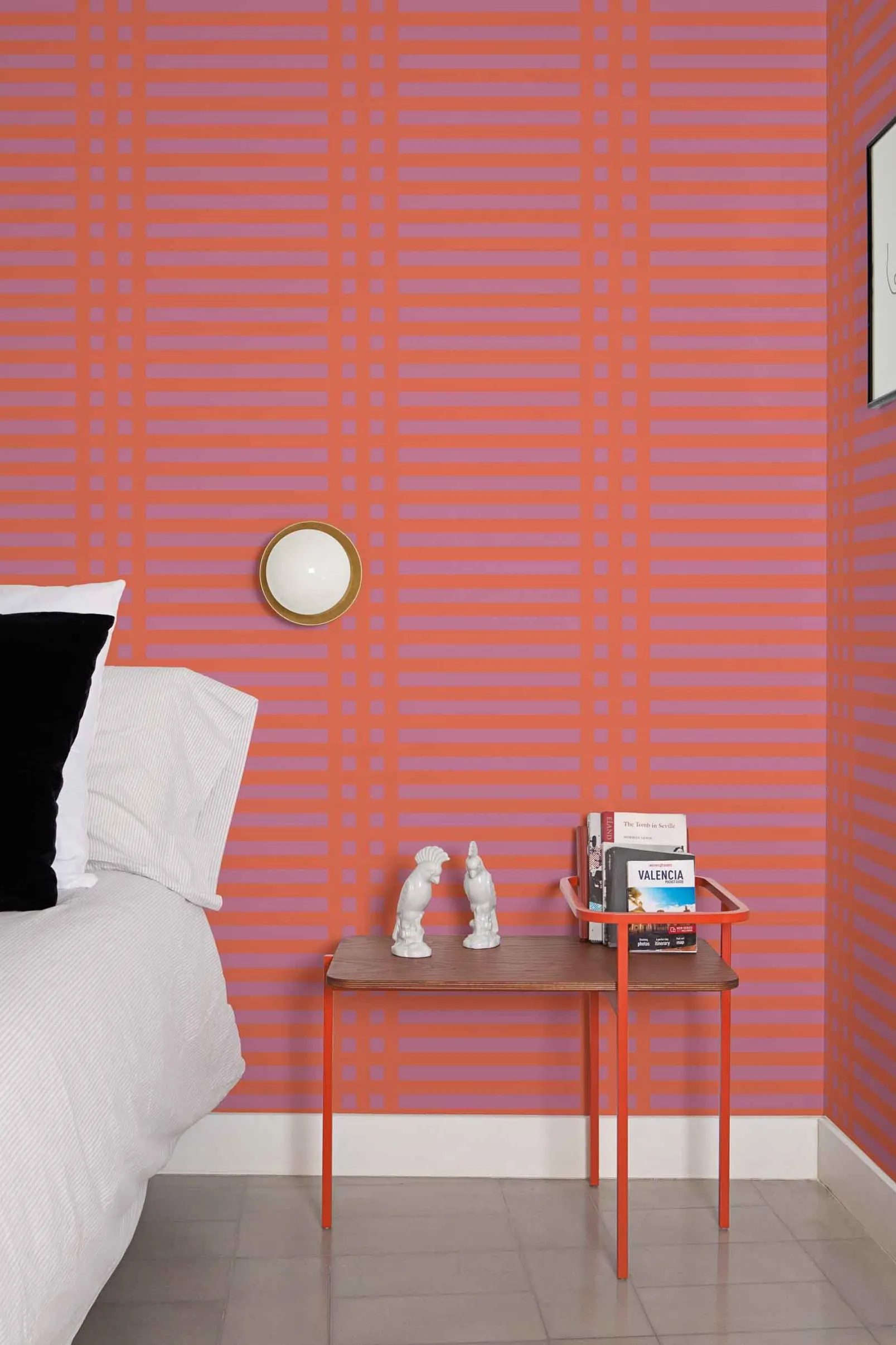 Papel pintado Grids Light Coordonné de la colección 40 aniversario con diseño de rayas en tonos rosa/lila.