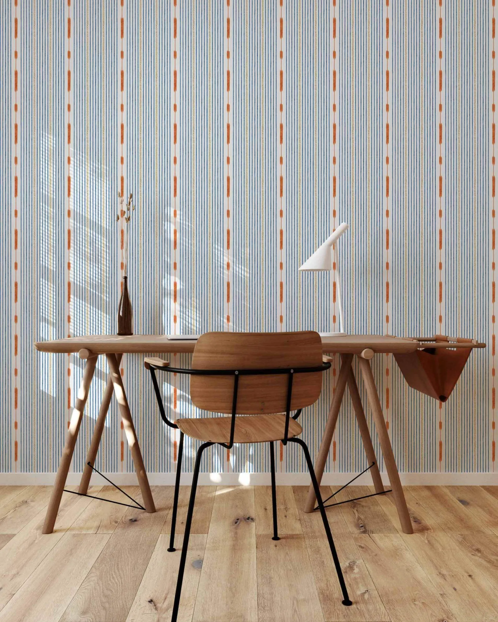 El papel pintado Huipil Blue de Coordonné es un diseño de rayas en tonos azules/azules marinos. La colorida vestimenta de las mujeres indígenas de Centroamérica.