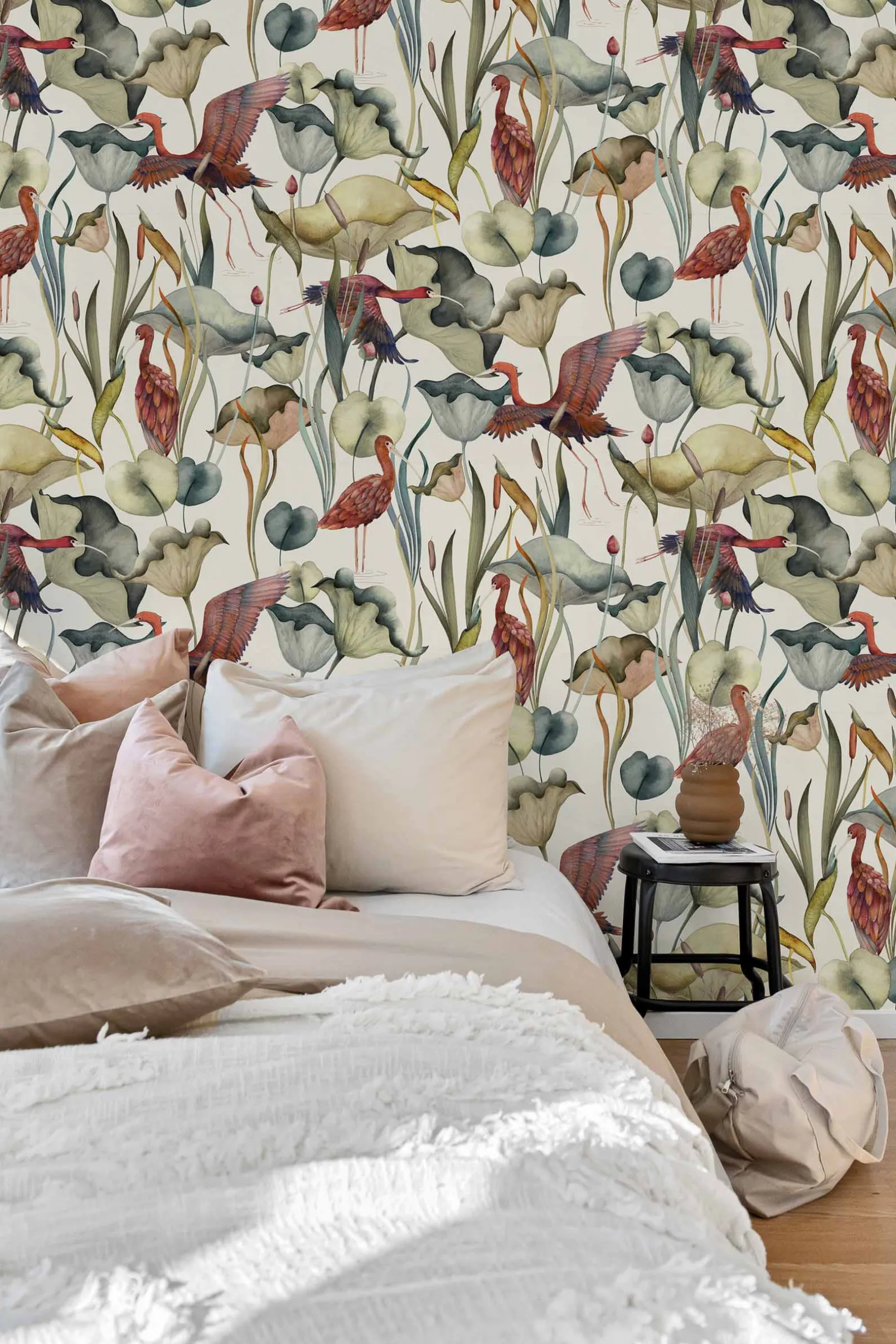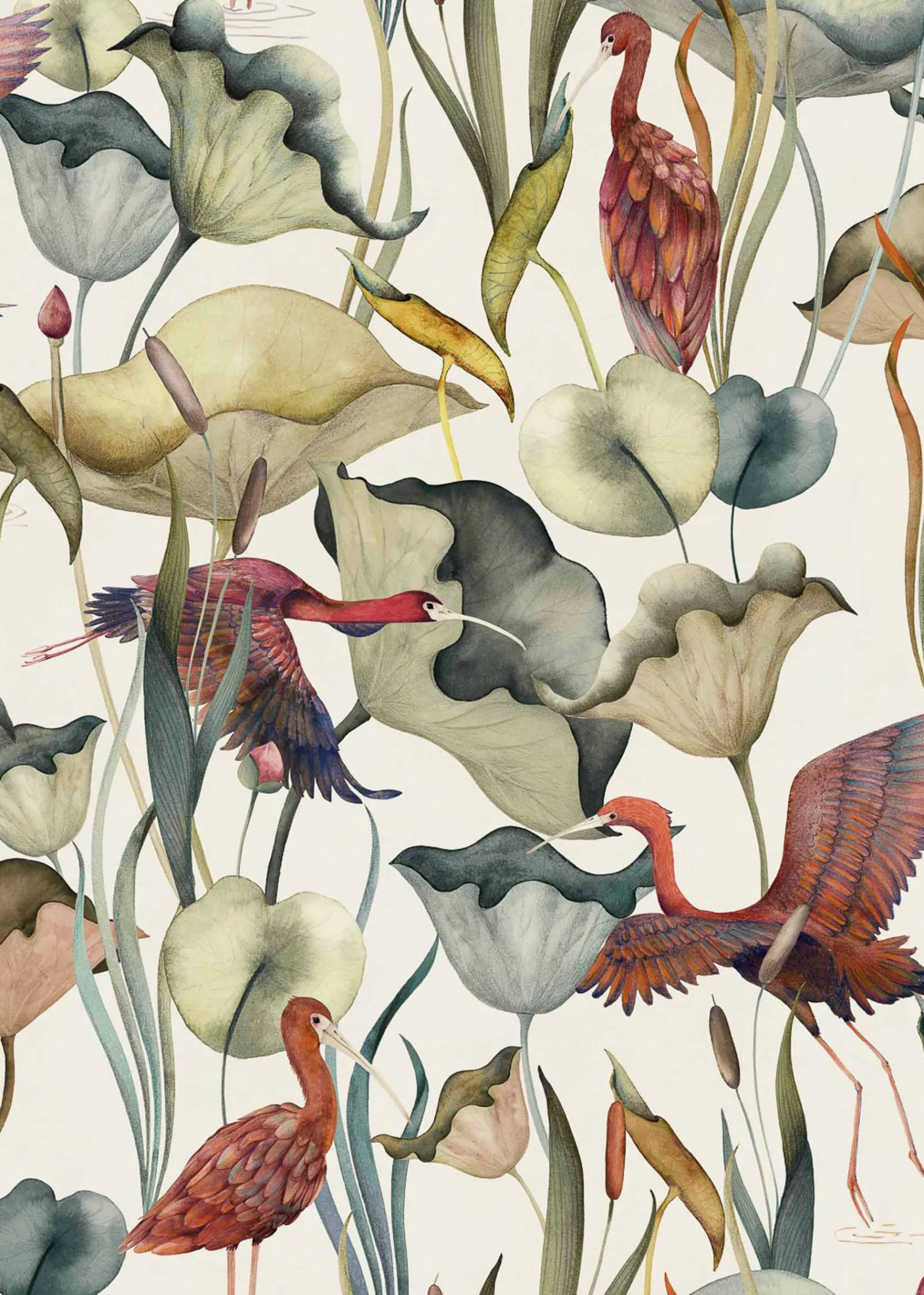 El papel pintado Humedales Algodón de Coordonné es un diseño de animales en tonos blanco/gris. Estanque lleno de elegantes ibis jugando entre lotos y nenúfares.