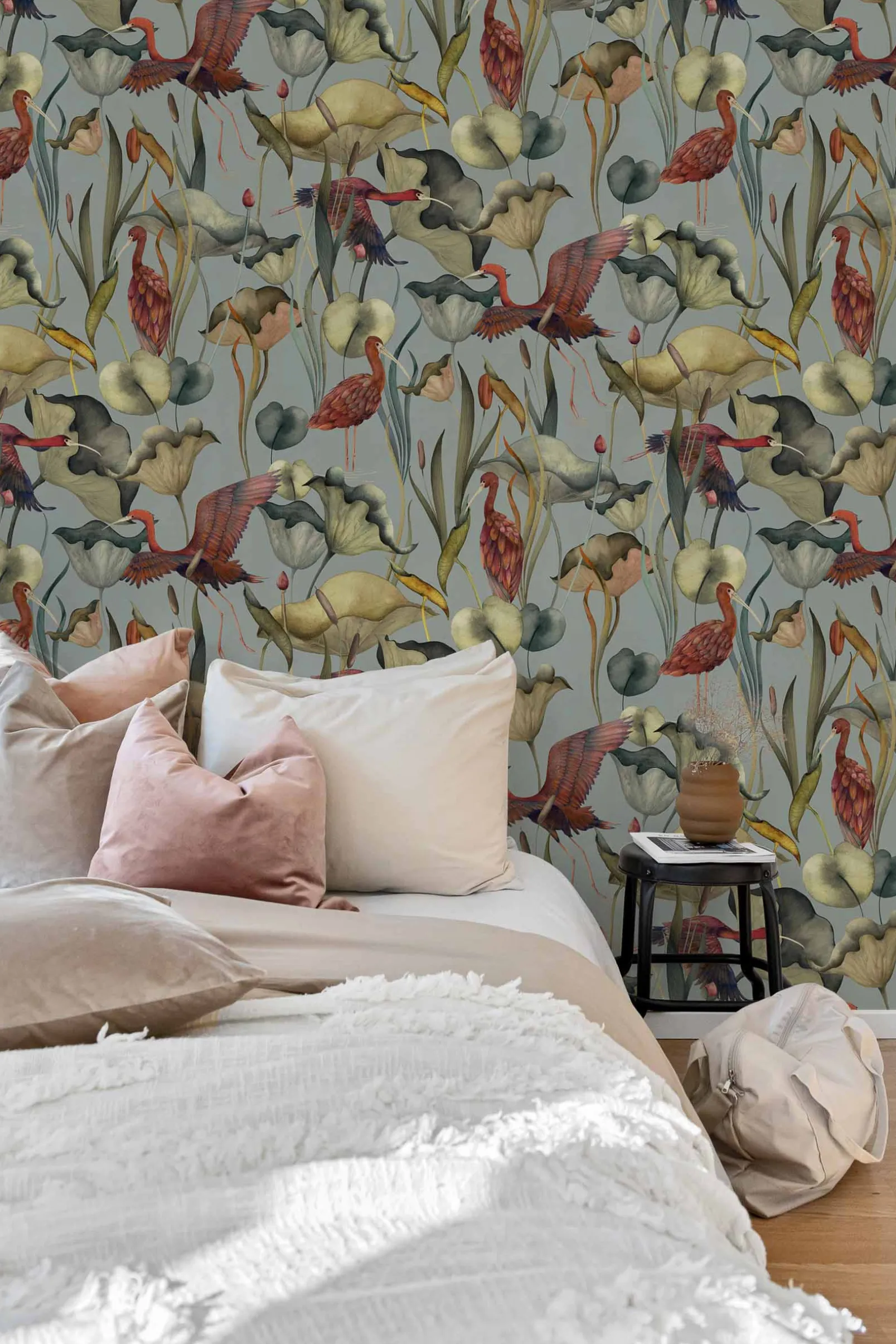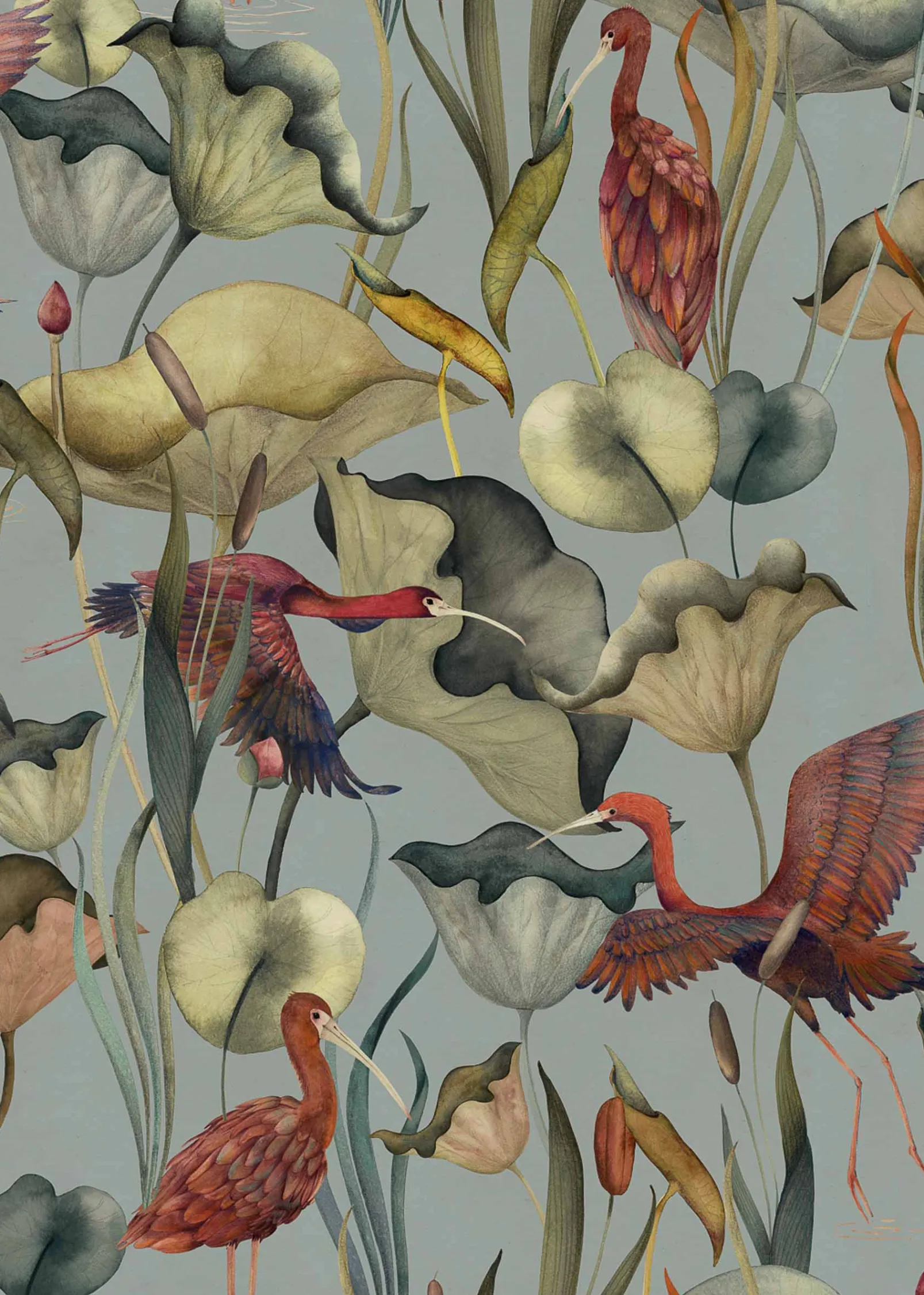 El papel pintado Humedales Celeste de Coordonné es un diseño de animales en tonos azules/azules marinos. Estanque lleno de elegantes ibis jugando entre lotos y nenúfares.