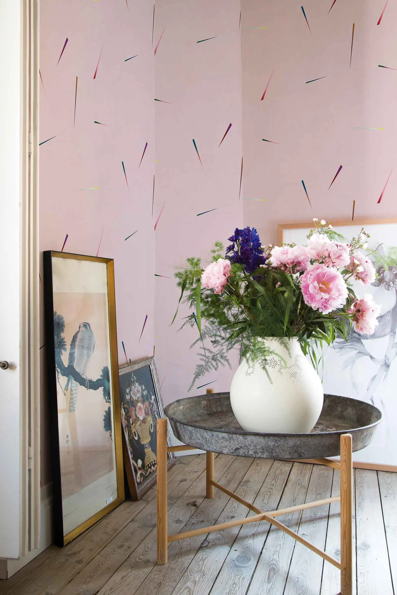 El papel pintado IkeyaSeki Rosa de Coordonné es un diseño geométrico en tonos rosa/lila de la colección Anima.