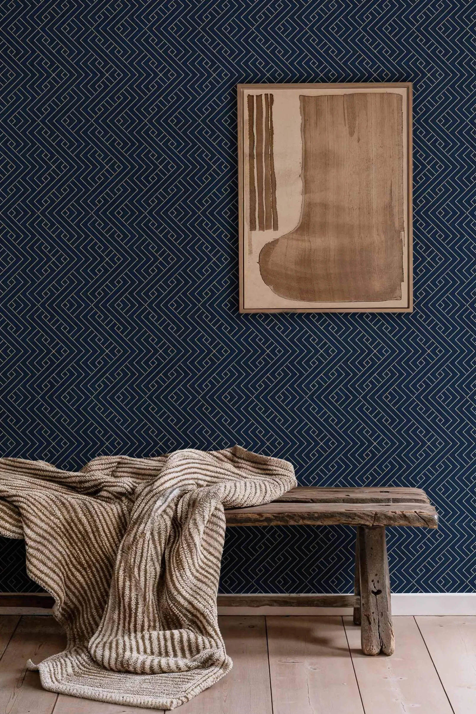 Interwoven Ultramarine de Coordonne es un papel pintado de inspiración geométrica en tonos Azul/Azul Marino de la colección Lattice Geometrics. Un entrecruzado denso y compacto.