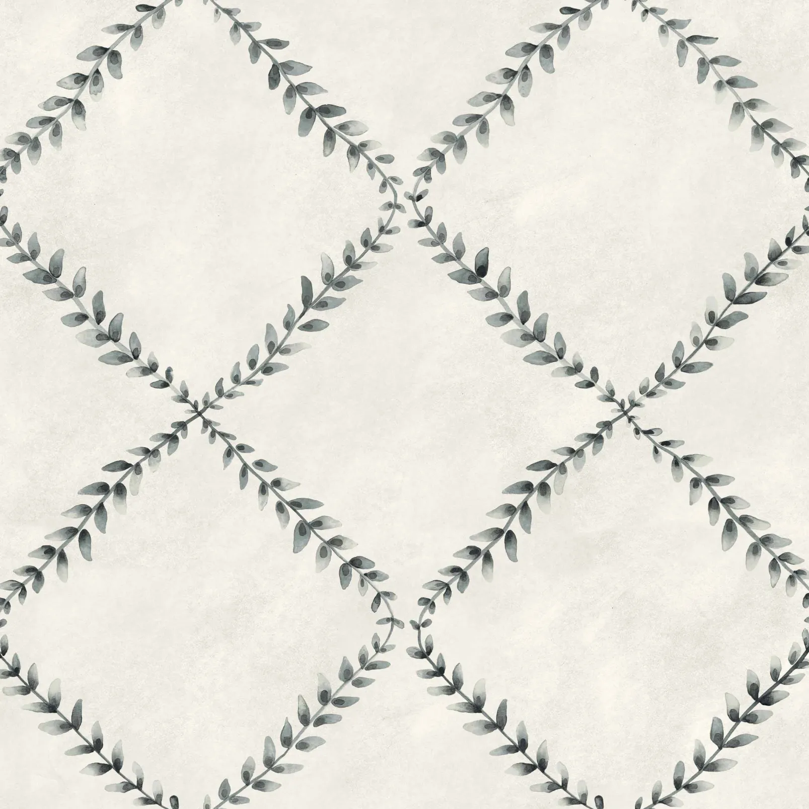 Ivy-Garland Aqua de Coordonné es un diseño vegetal en blanco/gris de la colección Cotswolds. Intrincadas guirnaldas de hojas brillantes trepan por las casas de Bibury.