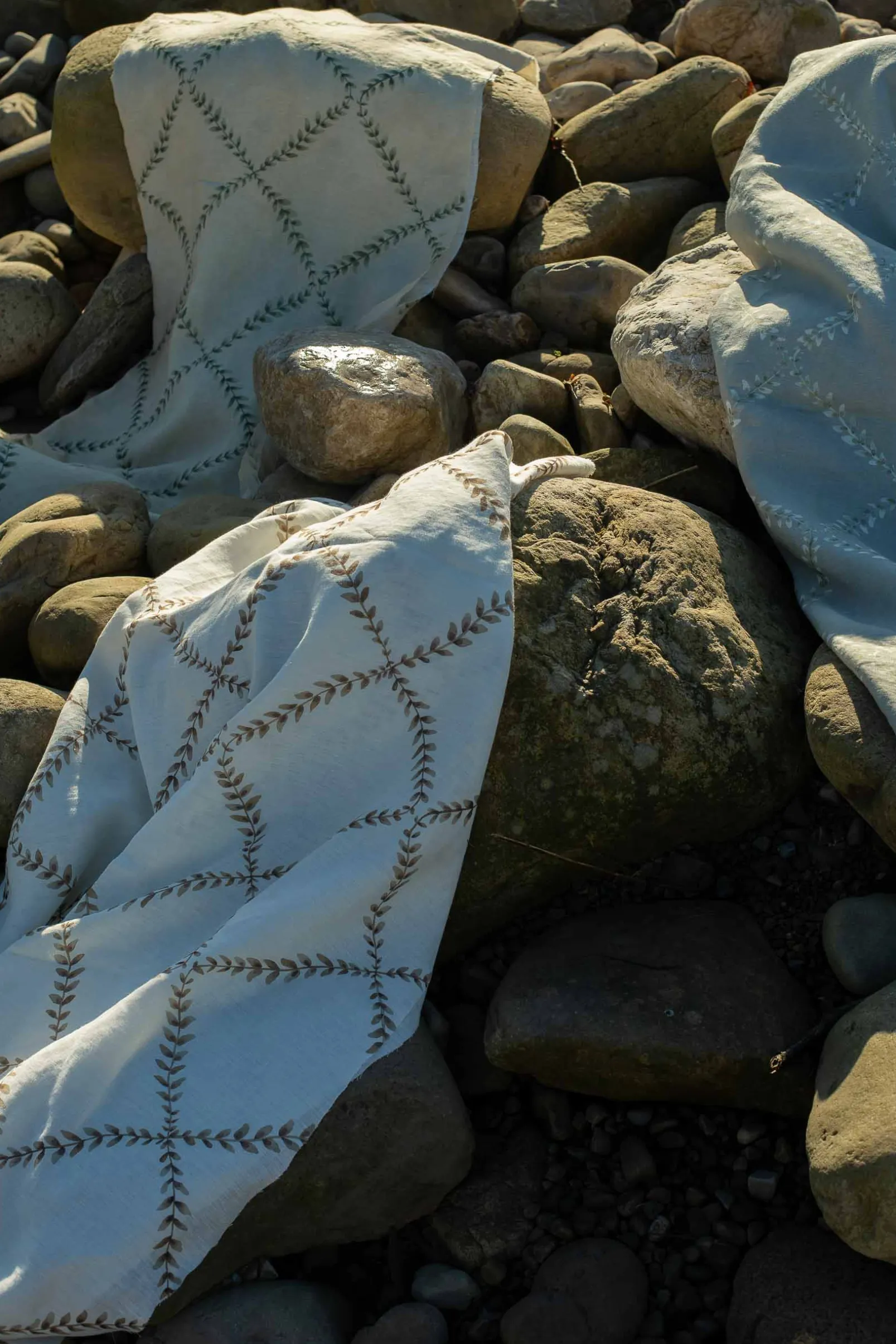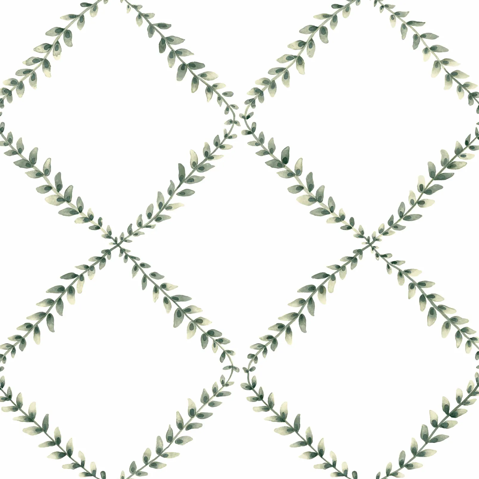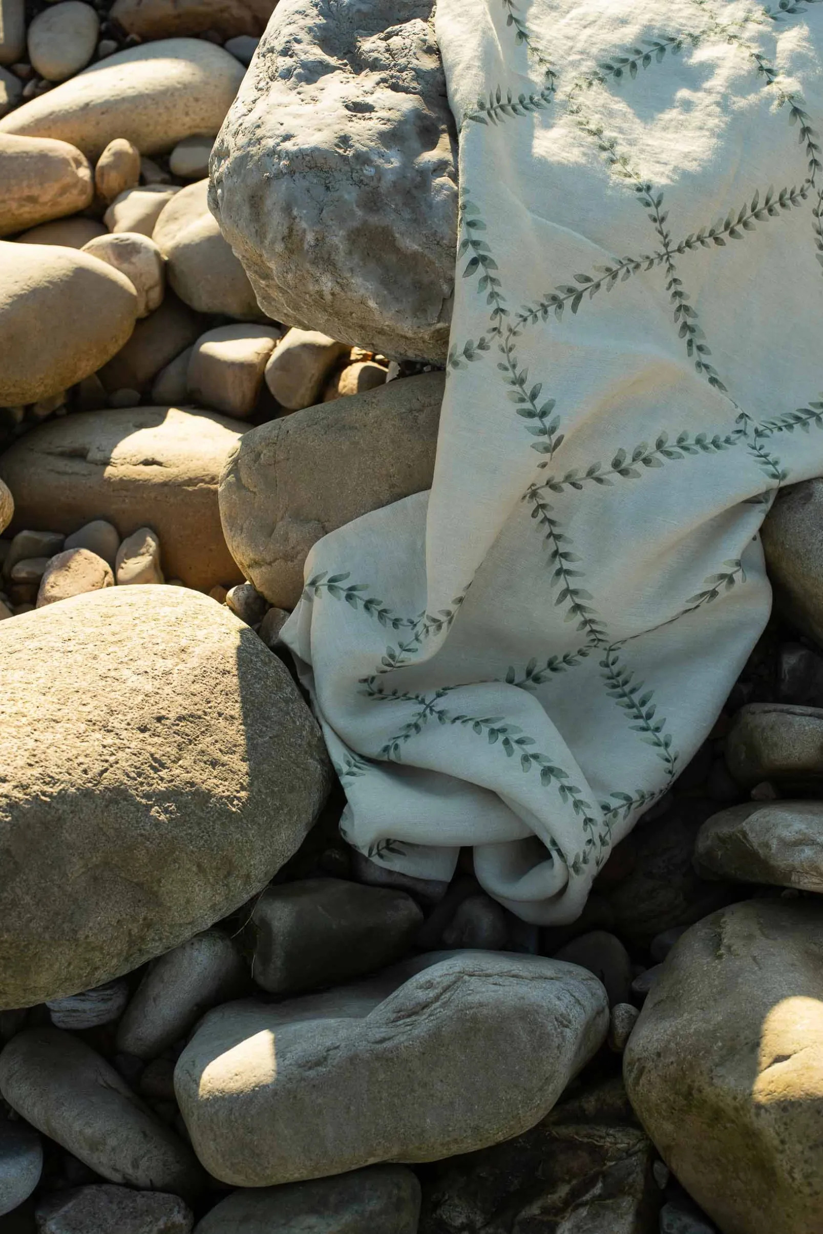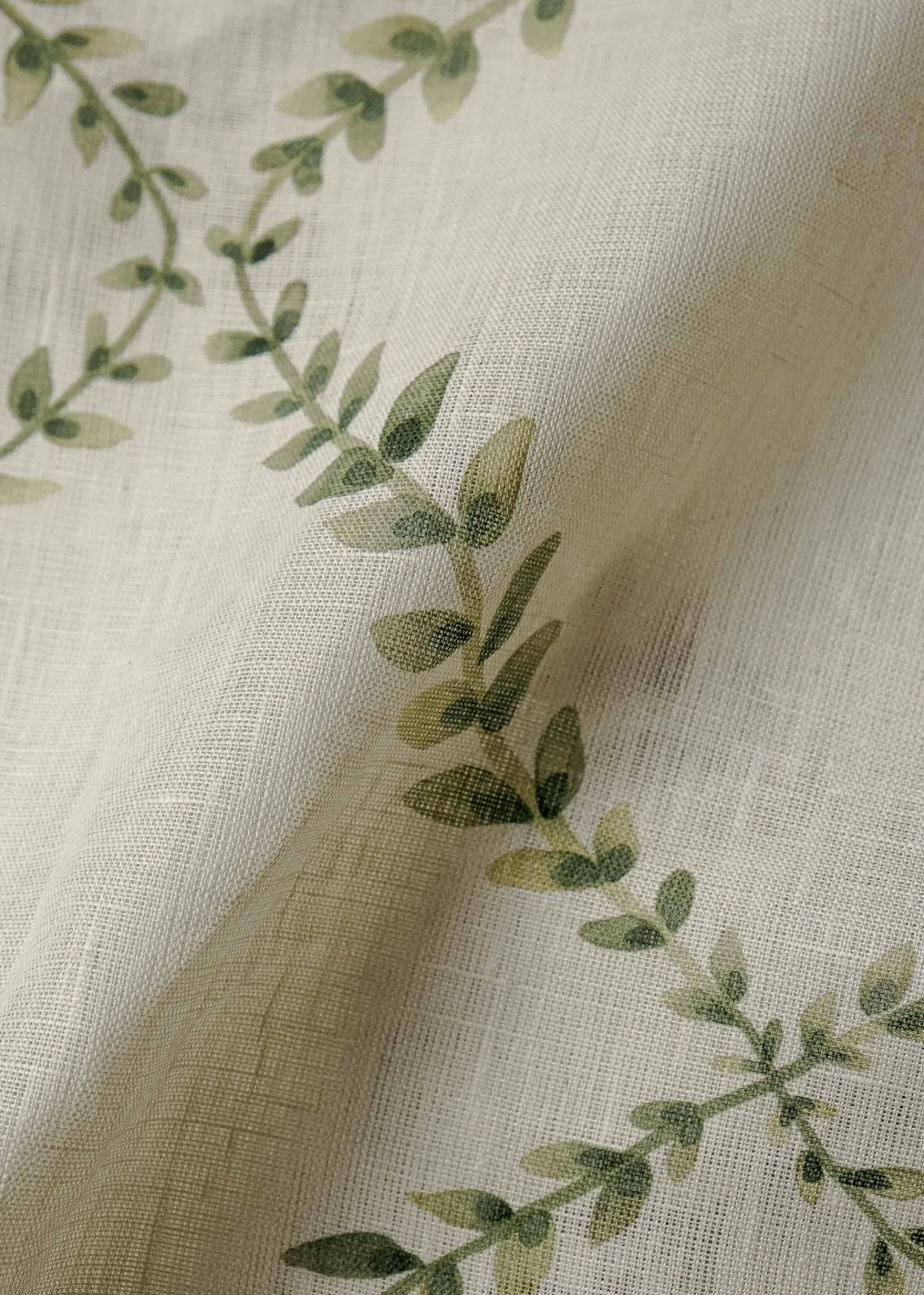 Ivy Garland Mint de Coordonné es un diseño vegetal en blanco/gris de la colección Cotswolds Fabrics. Meticulosas guirnaldas de hojas brillantes que trepan por las casas de Bibury.