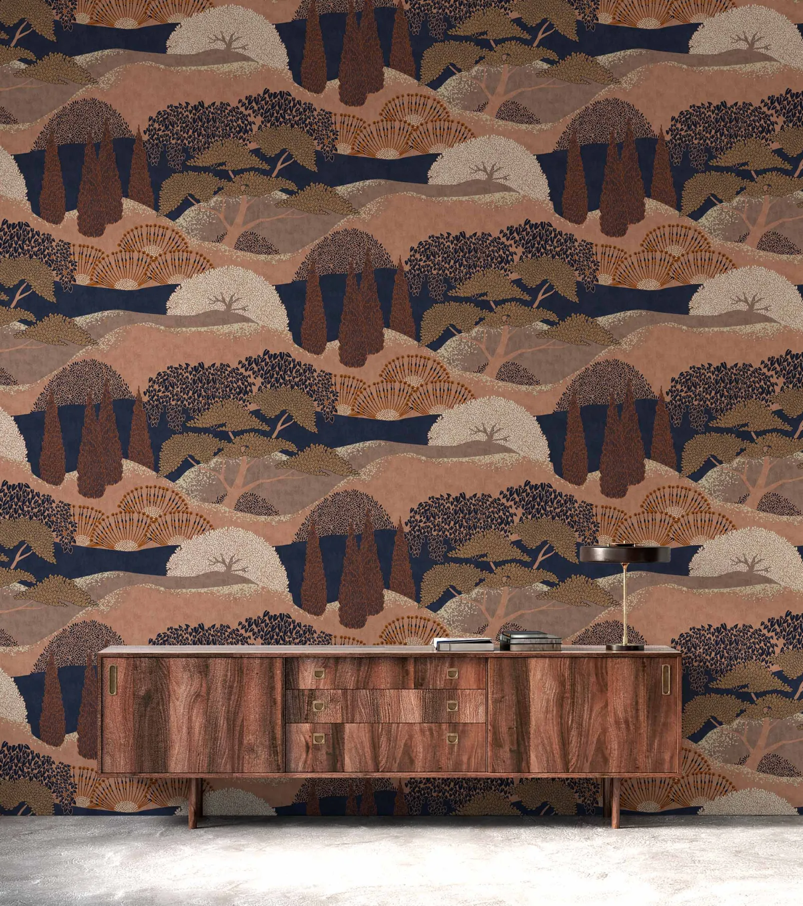 El papel pintado Jardín Japonés Canela de Coordonné es un diseño paisajístico en tonos rosa/lila. Plantaciones contemporáneas en forma de terrazas con cipreses puntillistas.