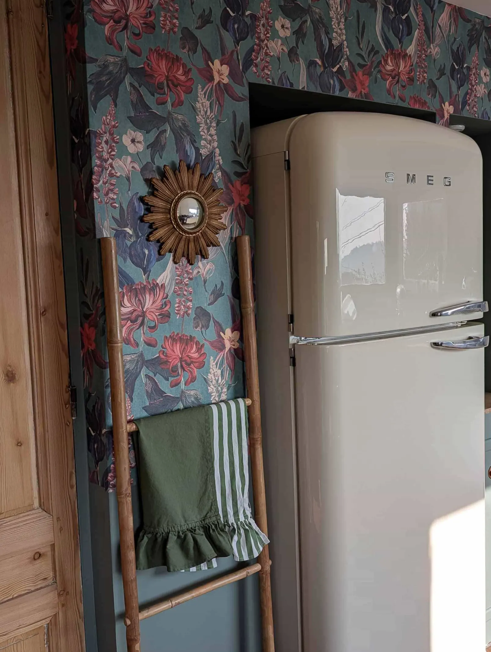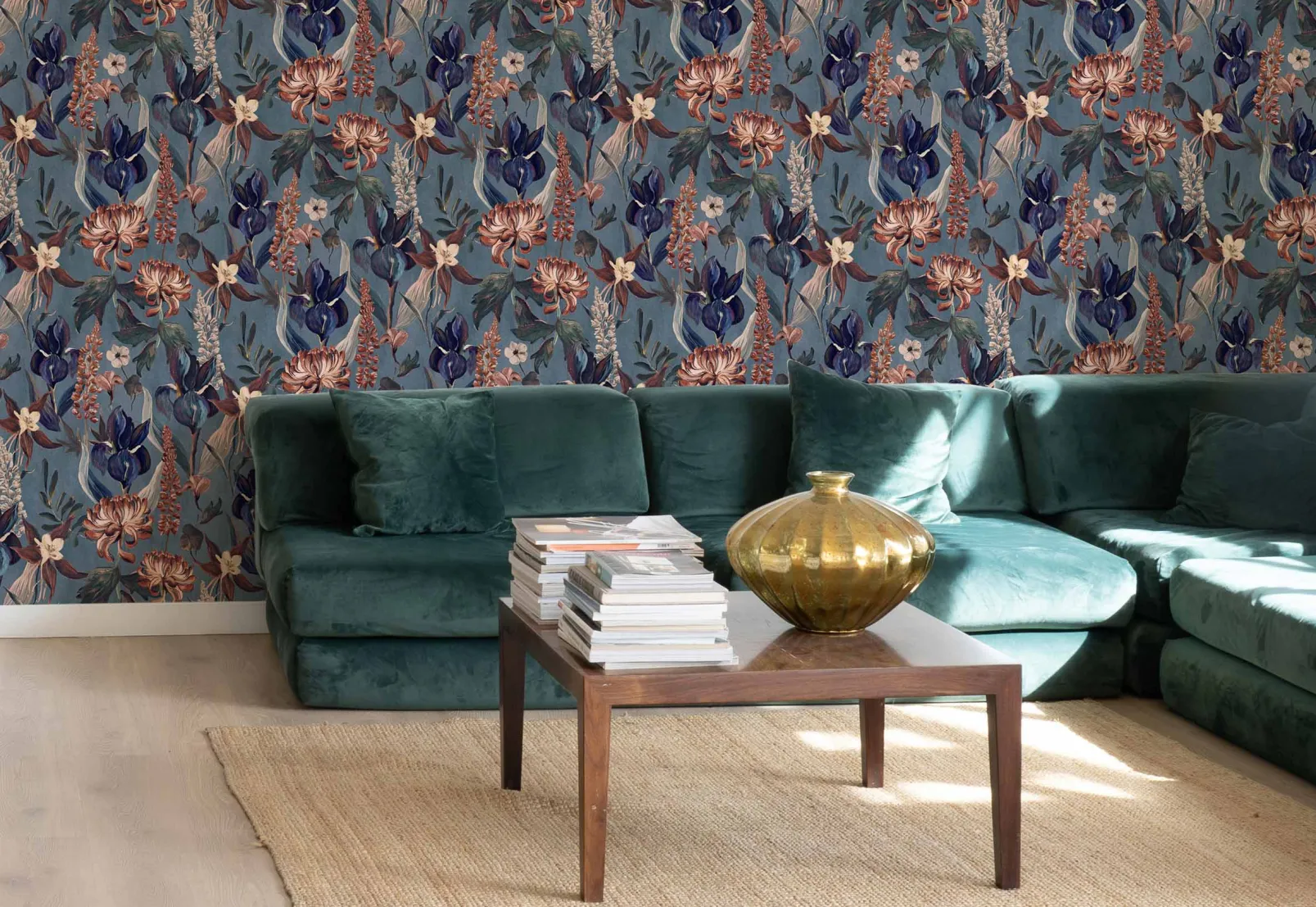 El papel pintado Jardín Rojo Añil de Coordonné es un diseño floral en tonos azules/azules marinos. Espectaculares flores de color carmesí donde los grandiosos crisantemos son los protagonistas.