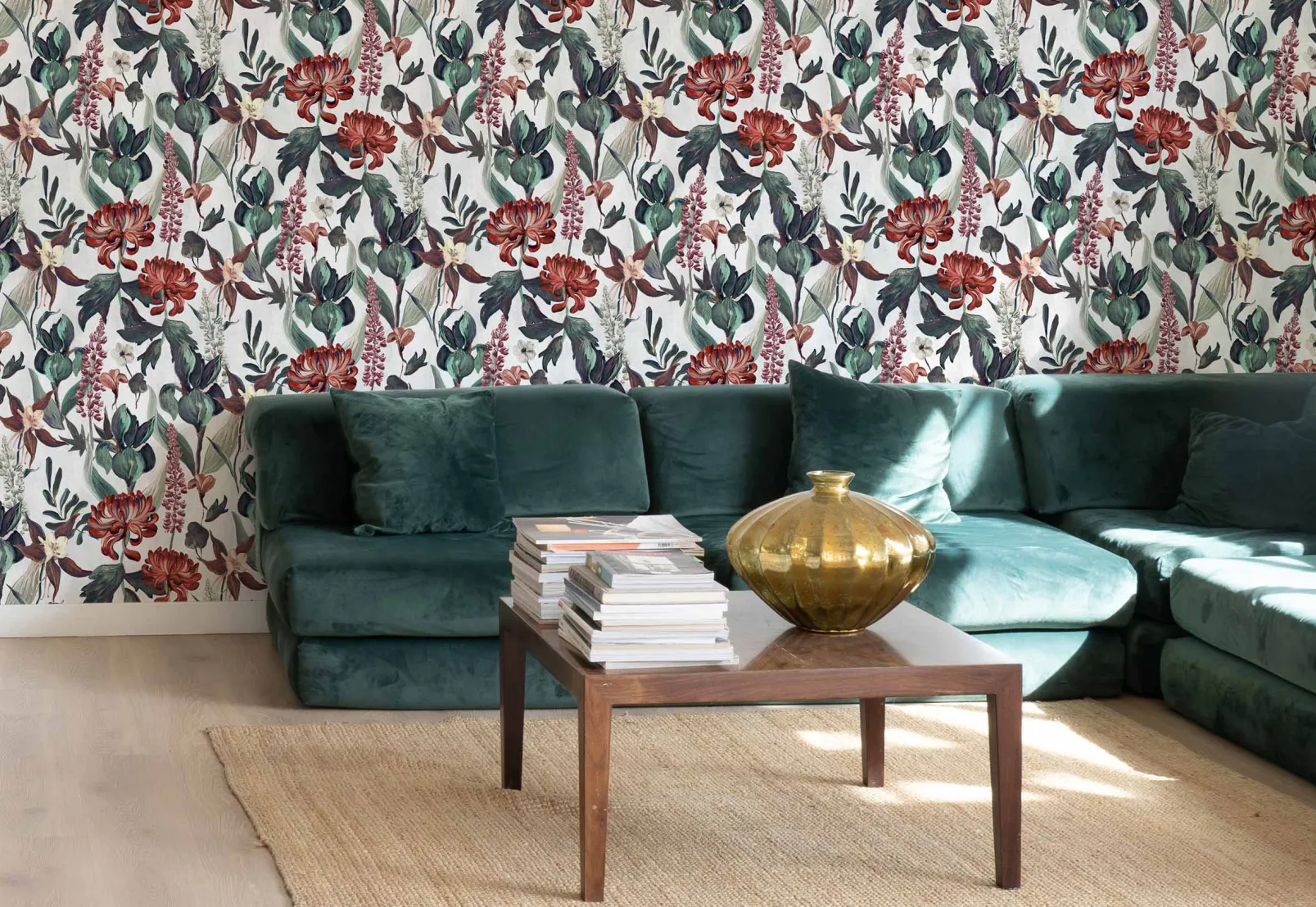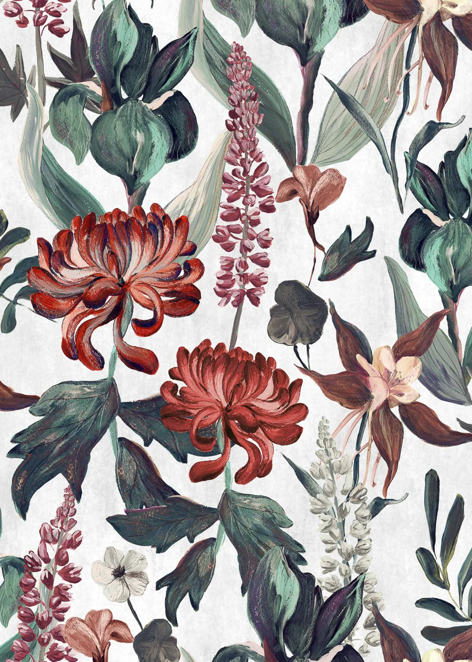 El papel pintado Jardín Rojo Cisne de Coordonné es un diseño floral en tonos blanco/gris. Espectaculares flores de color carmesí donde los grandiosos crisantemos son los protagonistas.