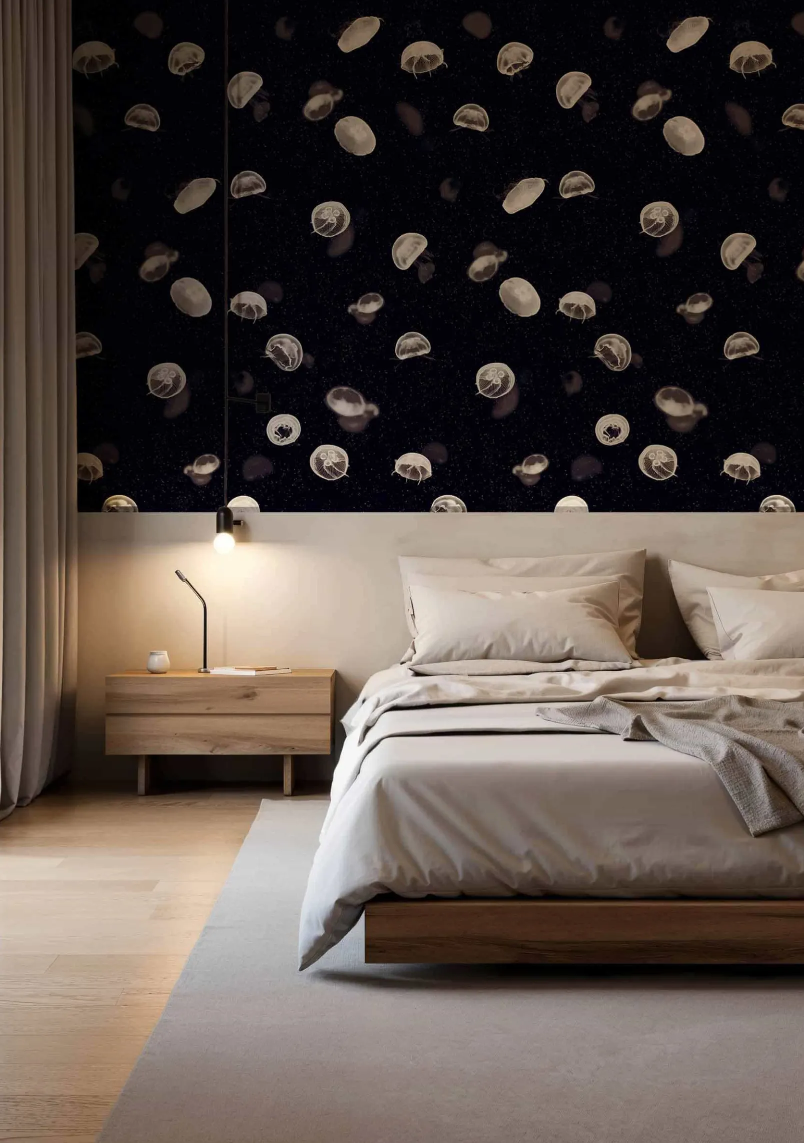 El papel pintado Jellyfish Black de Coordonné en un animal diseñado en tonos negros de la colección Essentia 15/5.