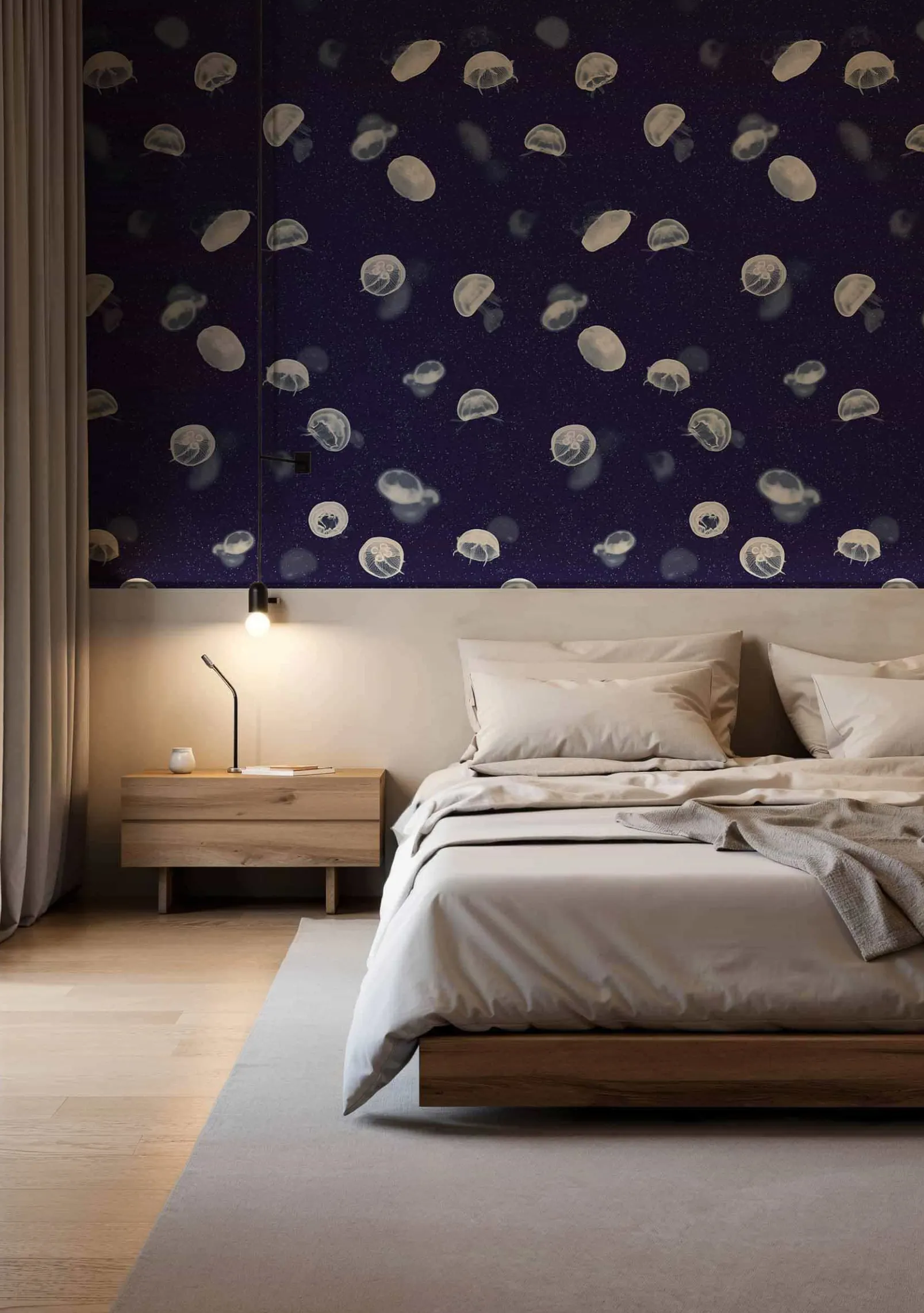 El papel pintado Jellyfish Blue de Coordonné en un animal diseñado en tonos azul/marino de la colección Essentia 15/5.