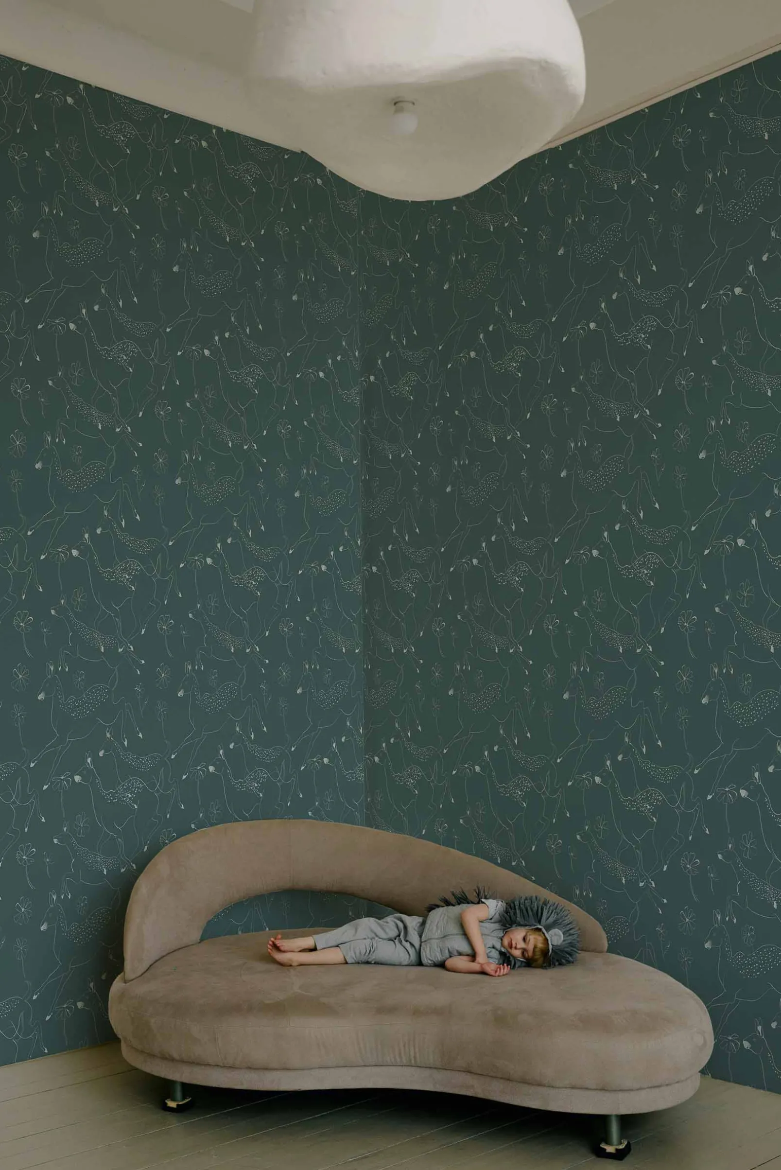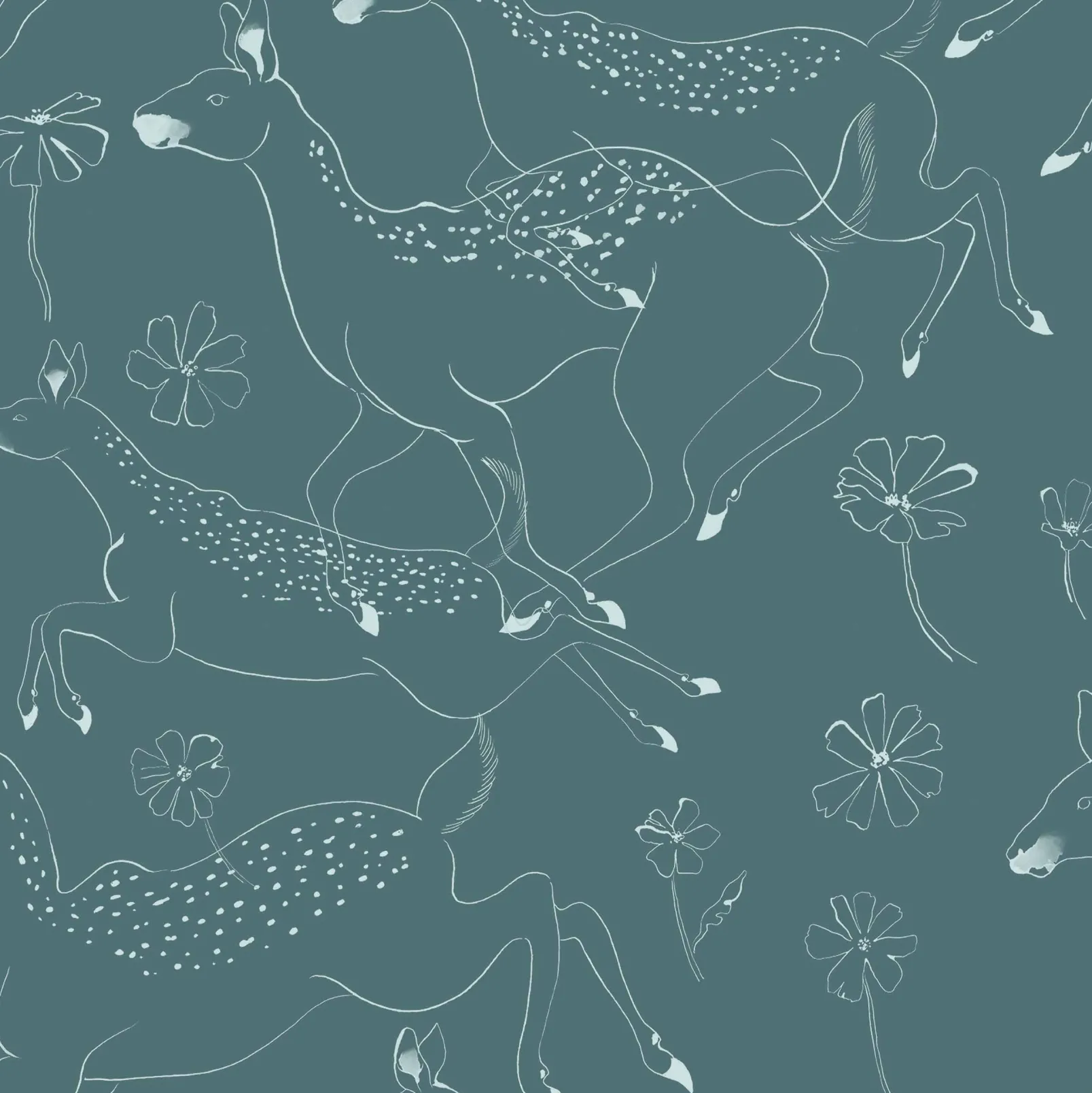 Papel pintado Jumping bambis Aqua de Coordonné en un animal diseñado en tonos verdes de la colección Random Kids.