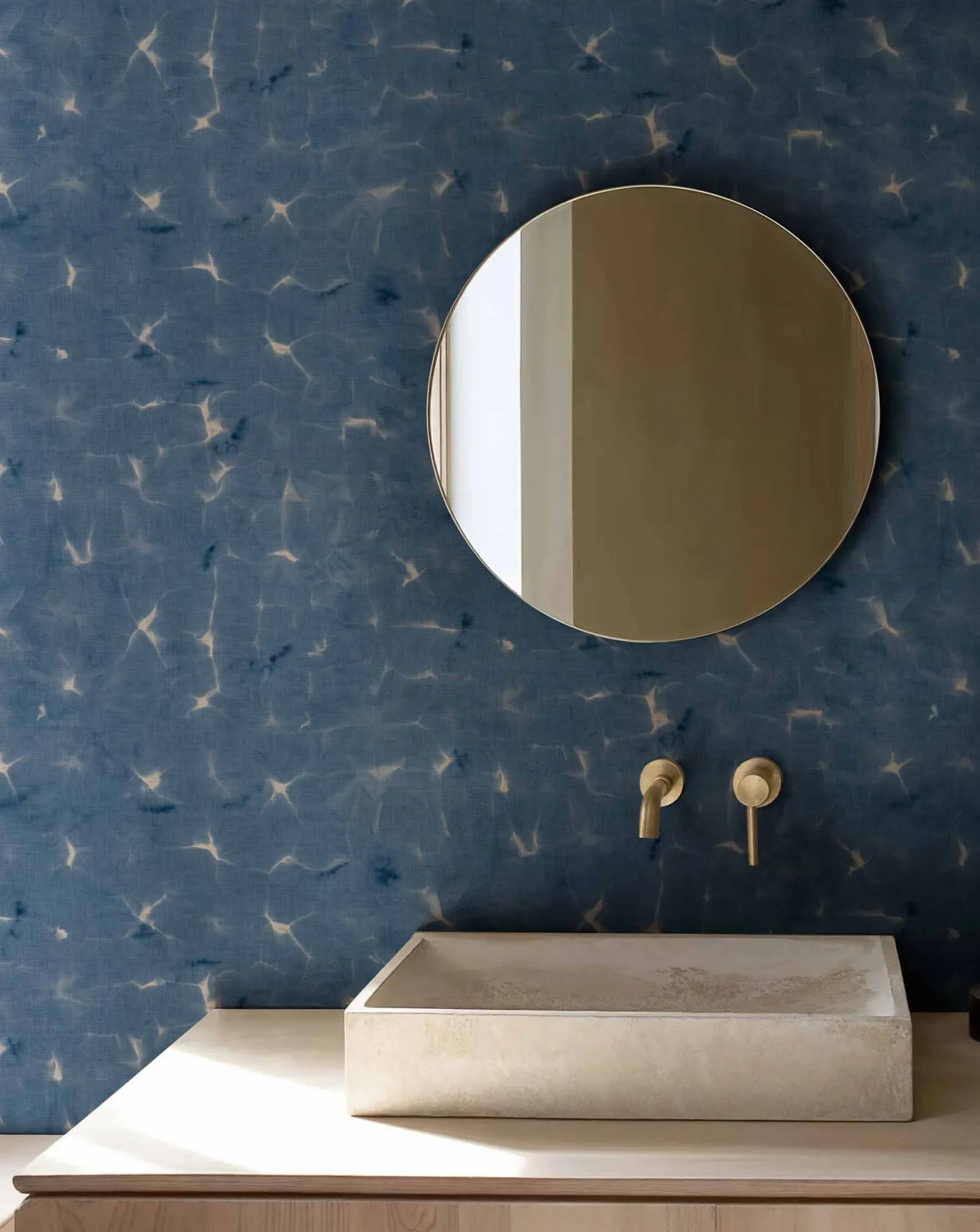 Kanoko Indigo de Coordonné es un diseño Texturas en azul/azul marino de la colección Shibori. Formas enigmáticas que emergen de la niebla.