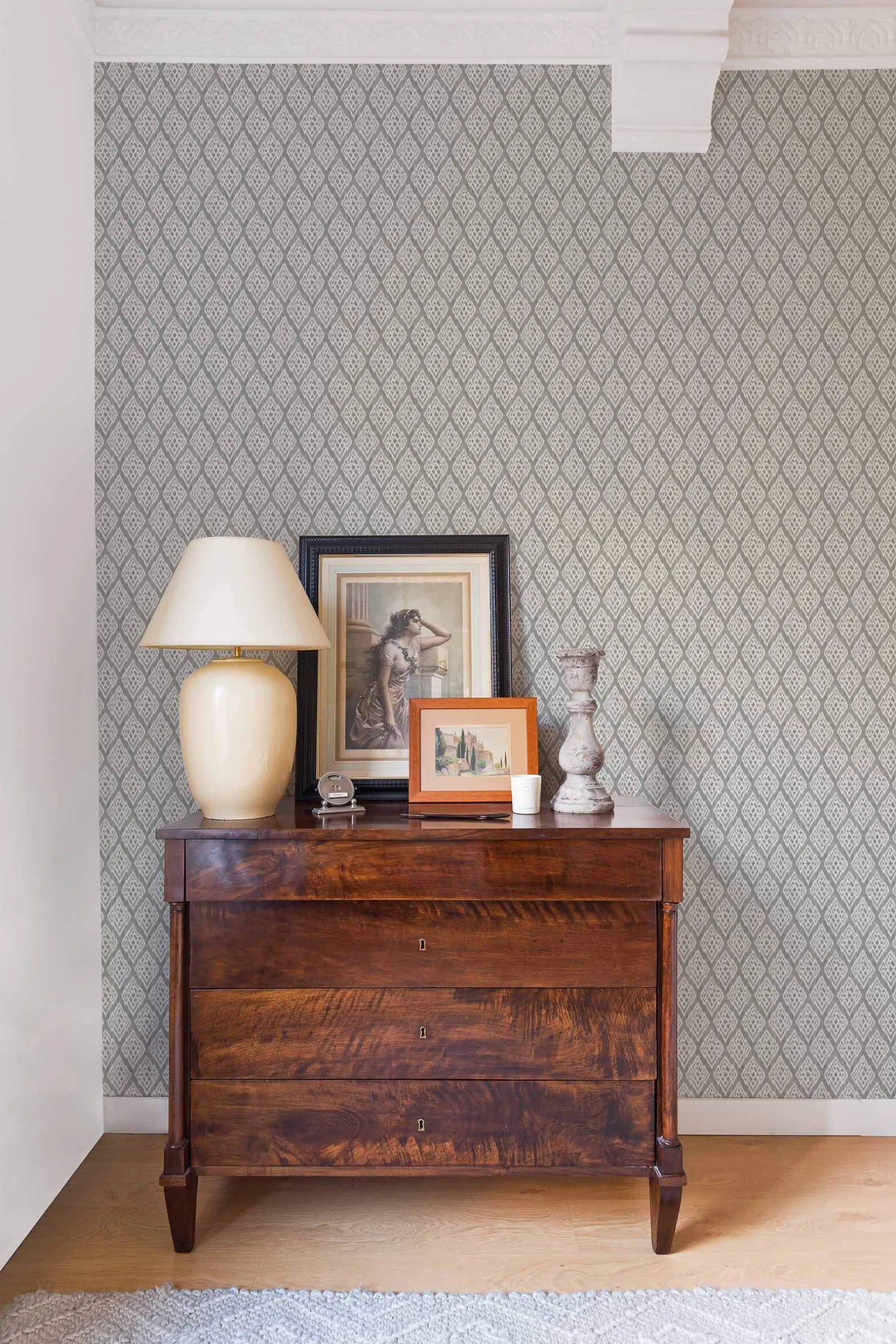 El papel pintado Kasuri Grey de Coordonné es un diseño geométrico en tonos blanco/gris. La elegancia difuminada o Kasureru de los motivos japoneses.
